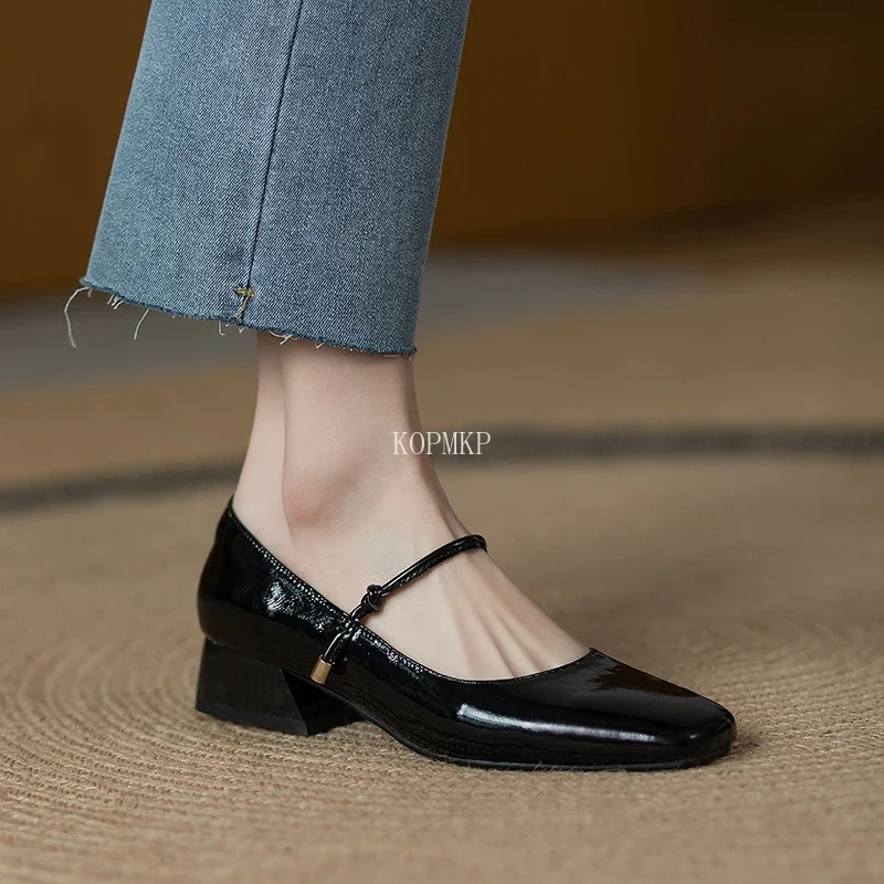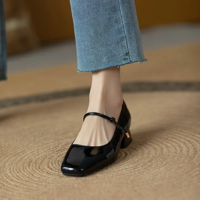 2024 New Square-toe Leather Shoes Red Mary Janes Shoes Women'S Shallow Mouth Casual Low Chunky Heel Dress Shoes Zaptos Mujer