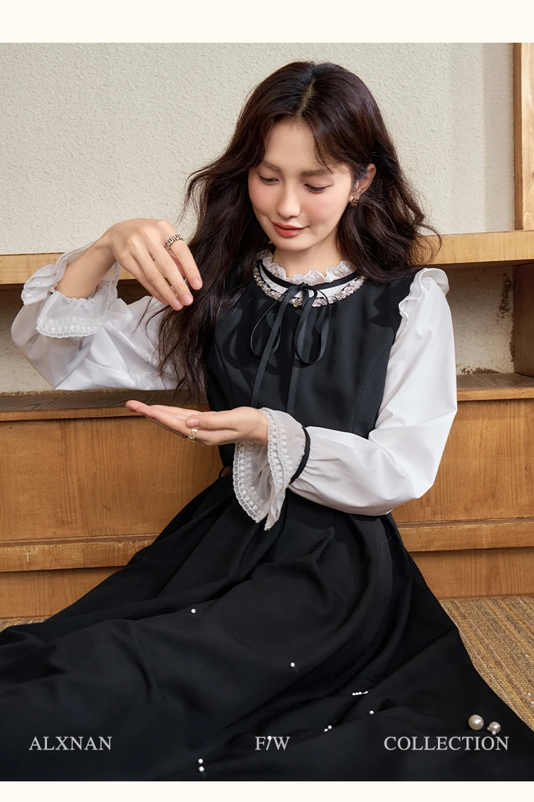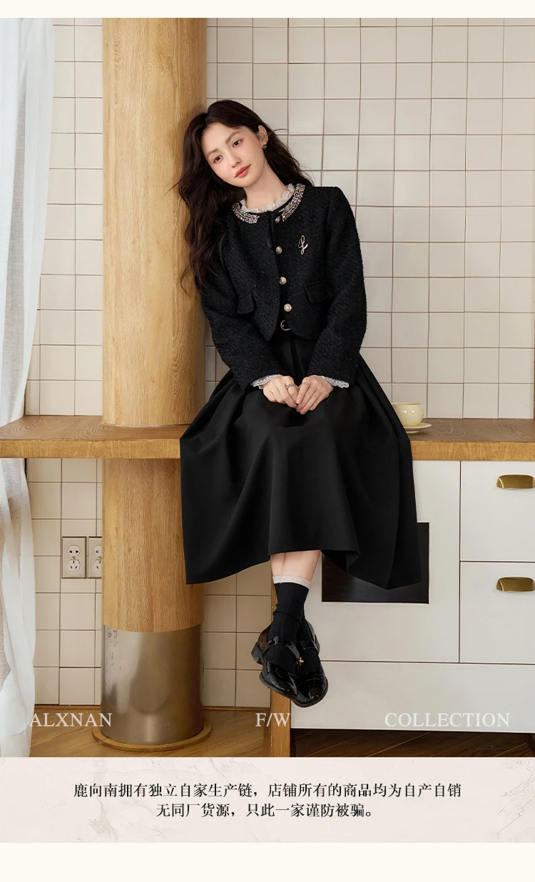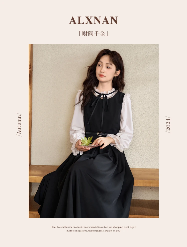 ALXNAN Camisole Dress for Women Solid Black A-line Sleeveless Sequins 2024 Autumn Simple Basics Commuter Clothing Female L50060