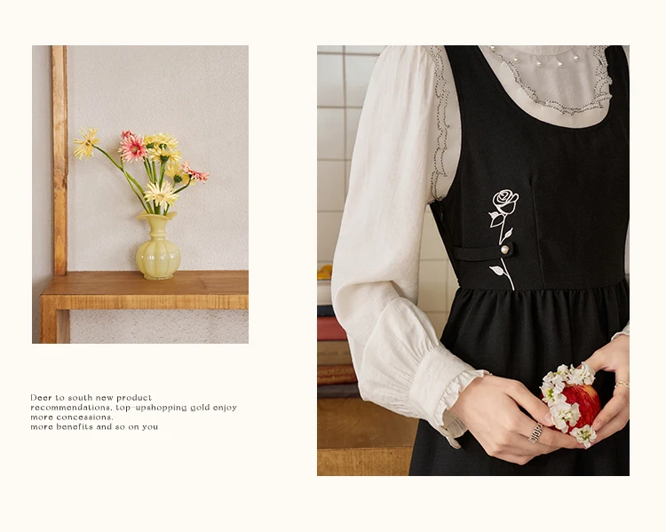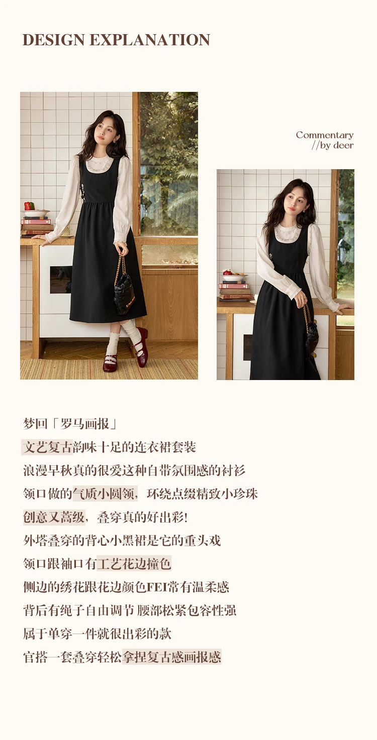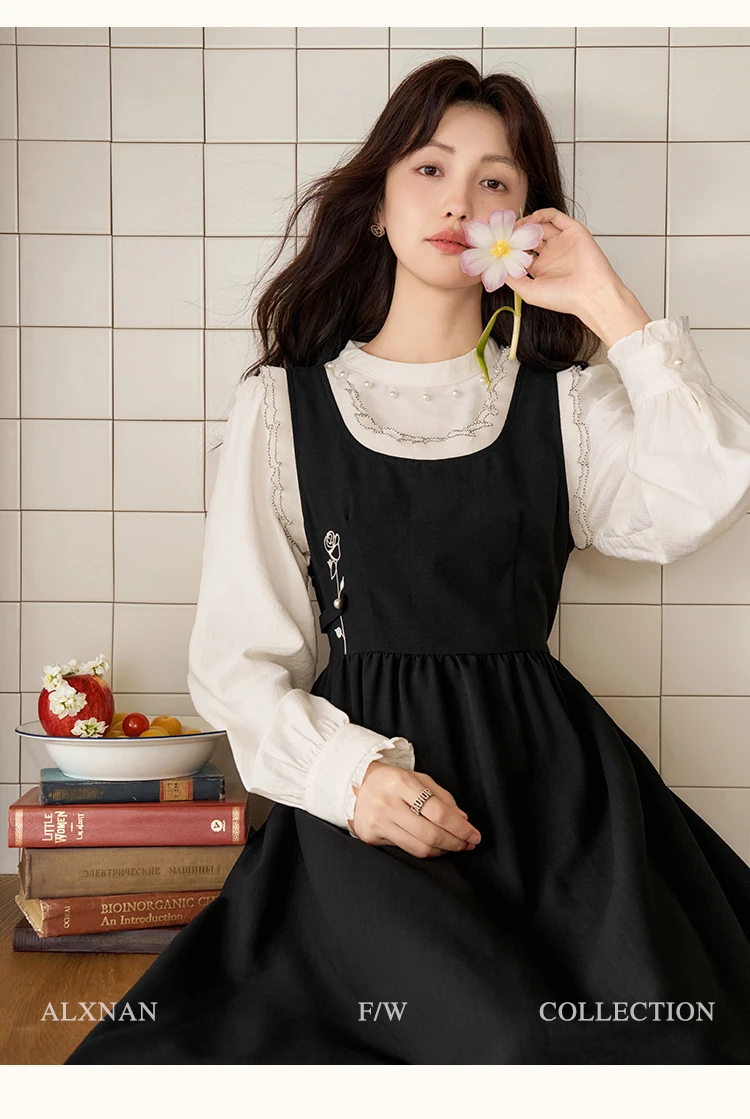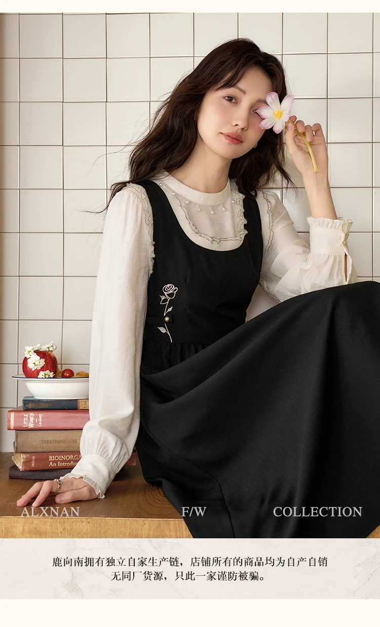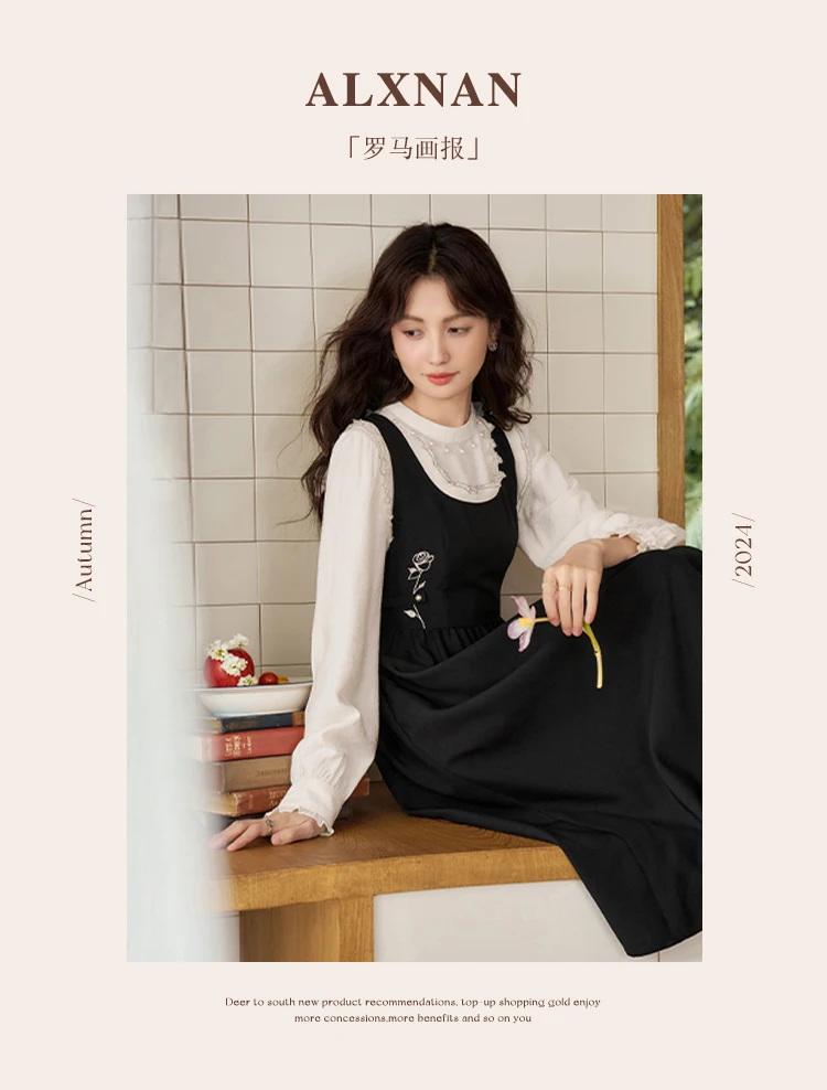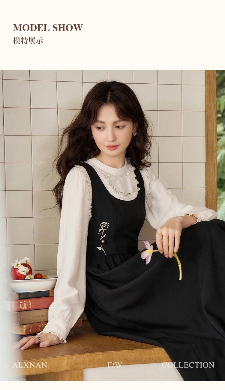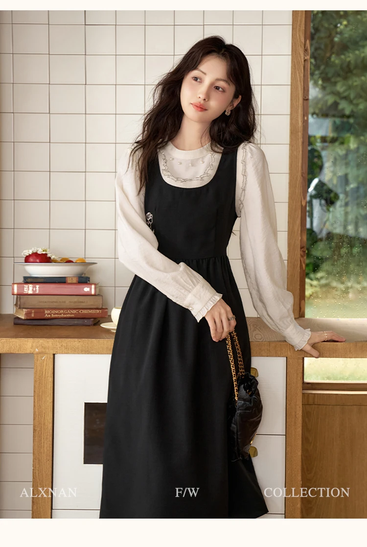 ALXNAN Women French Style Dress Autumn Vintage Embroidery Adjustable Waist Camisole Dress 2024 New Commuter Dress Female L39623