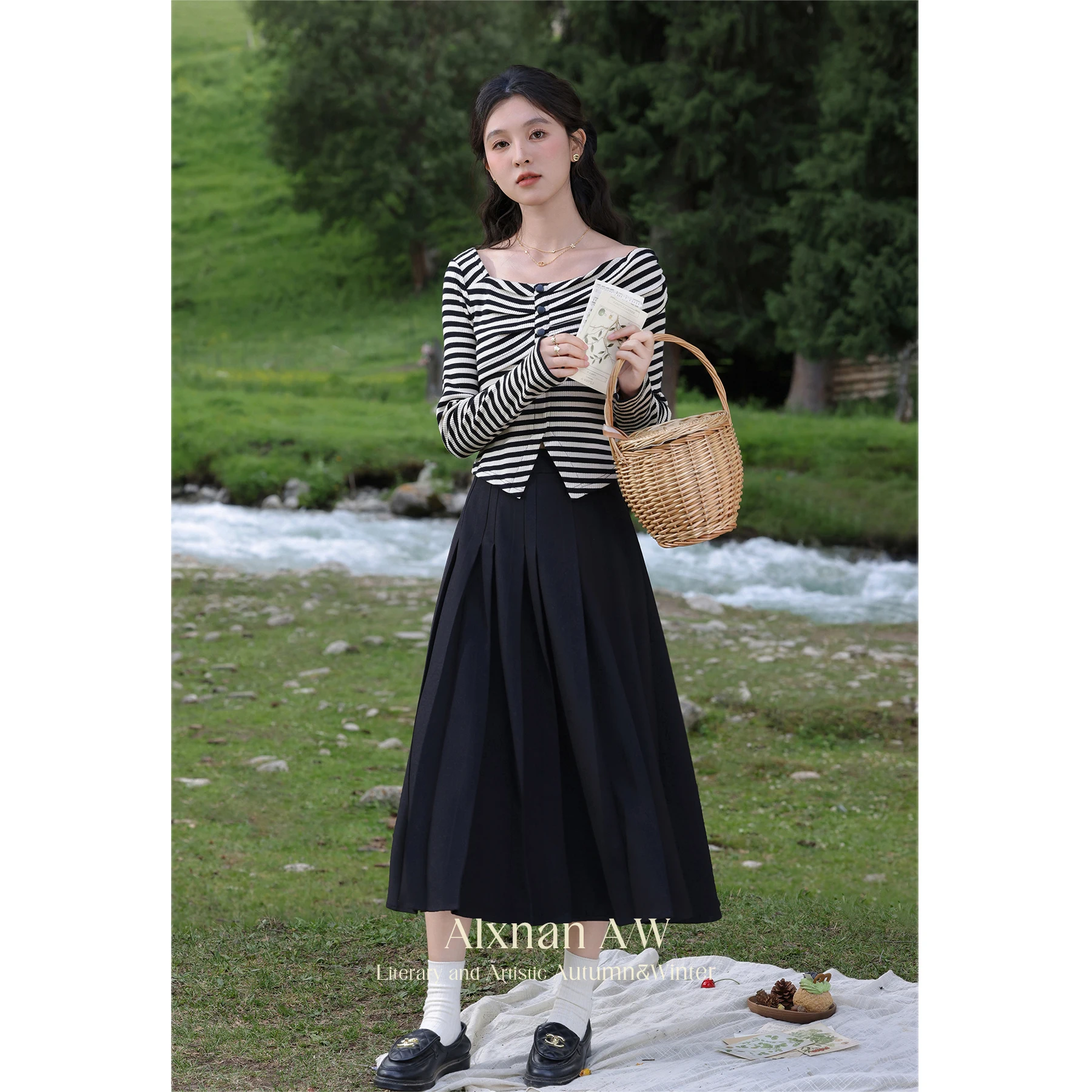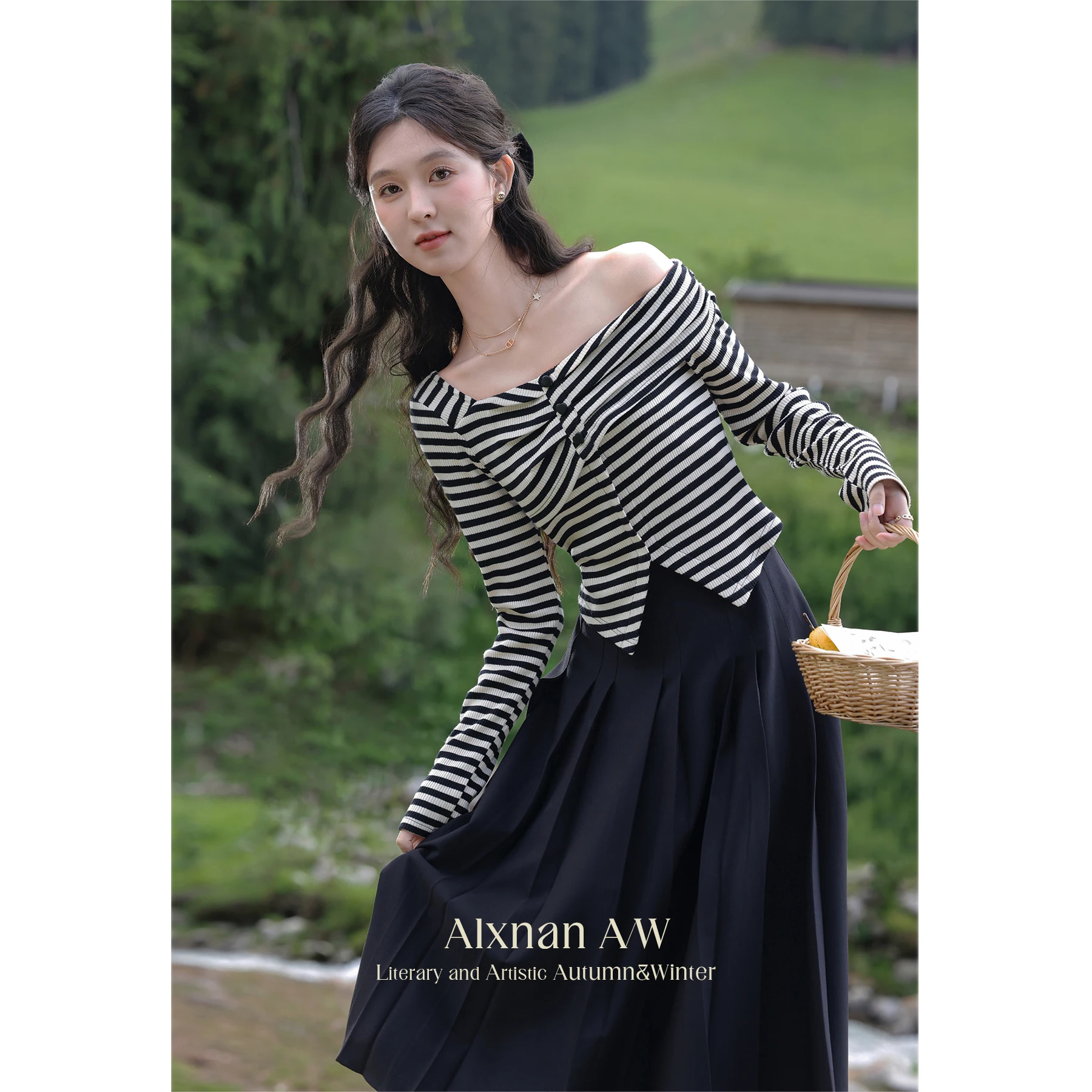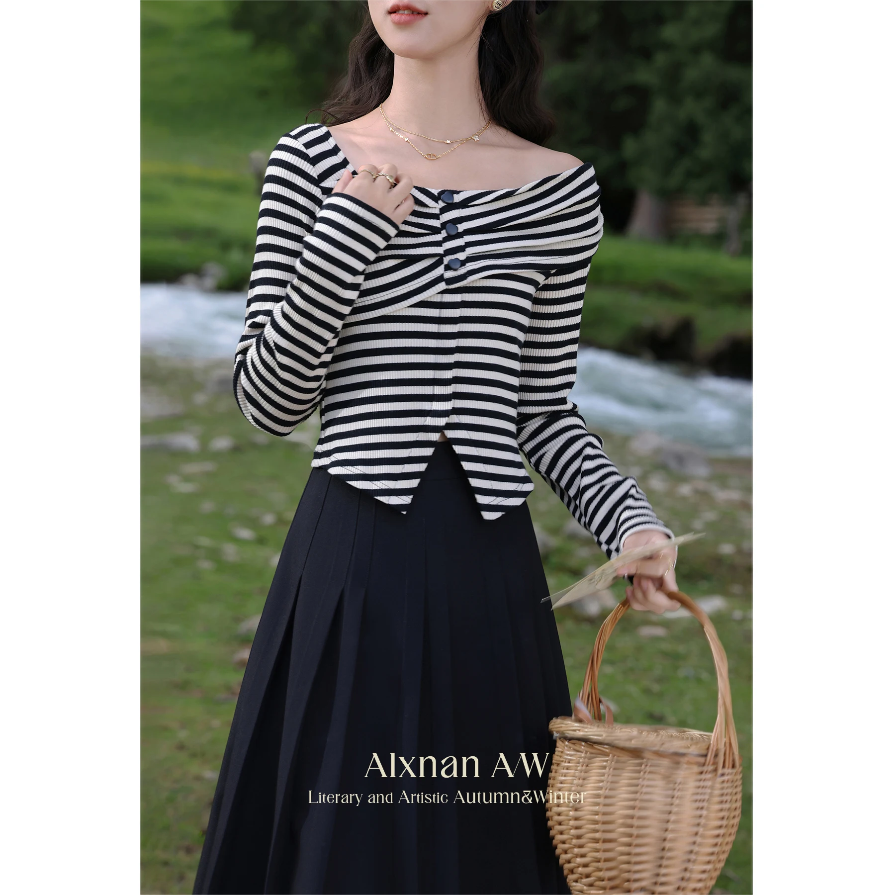 ALXNAN Women Slim Long Sleeve T-shirt 2024 Autumn New Fashion Chic Irregular Skew Collar Commuter Tops Female L39301