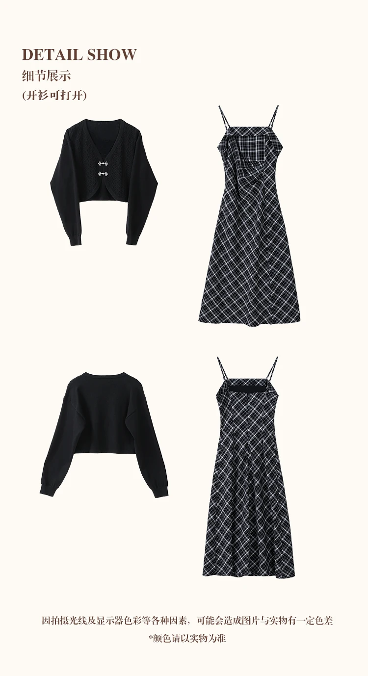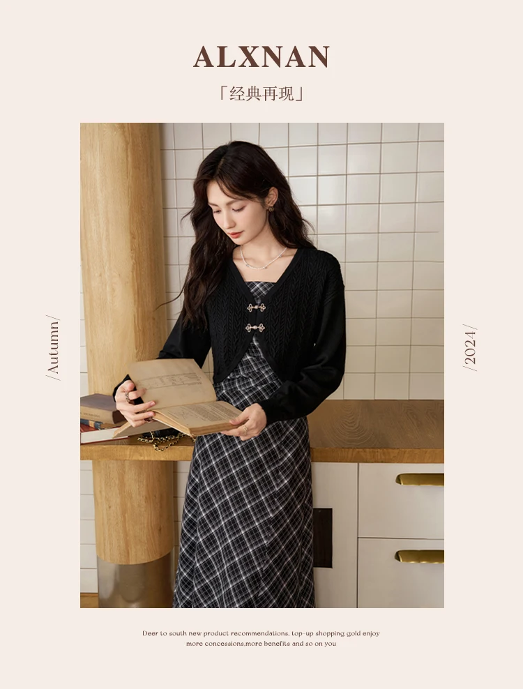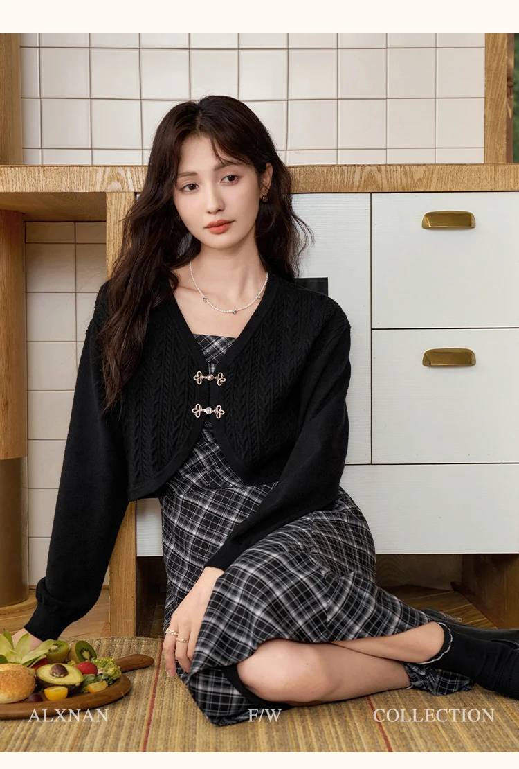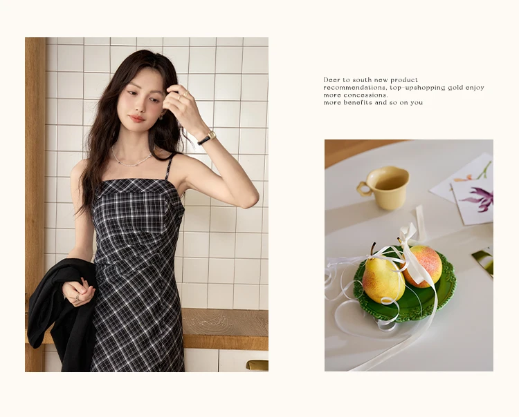 ALXNAN Women's Elegant Plaid Dresses 2024 Autumn Slash Neck Sleeveless A-line Adjustable Camisole Dress Female Clothing L39530