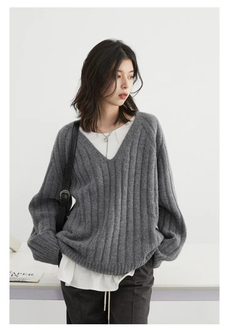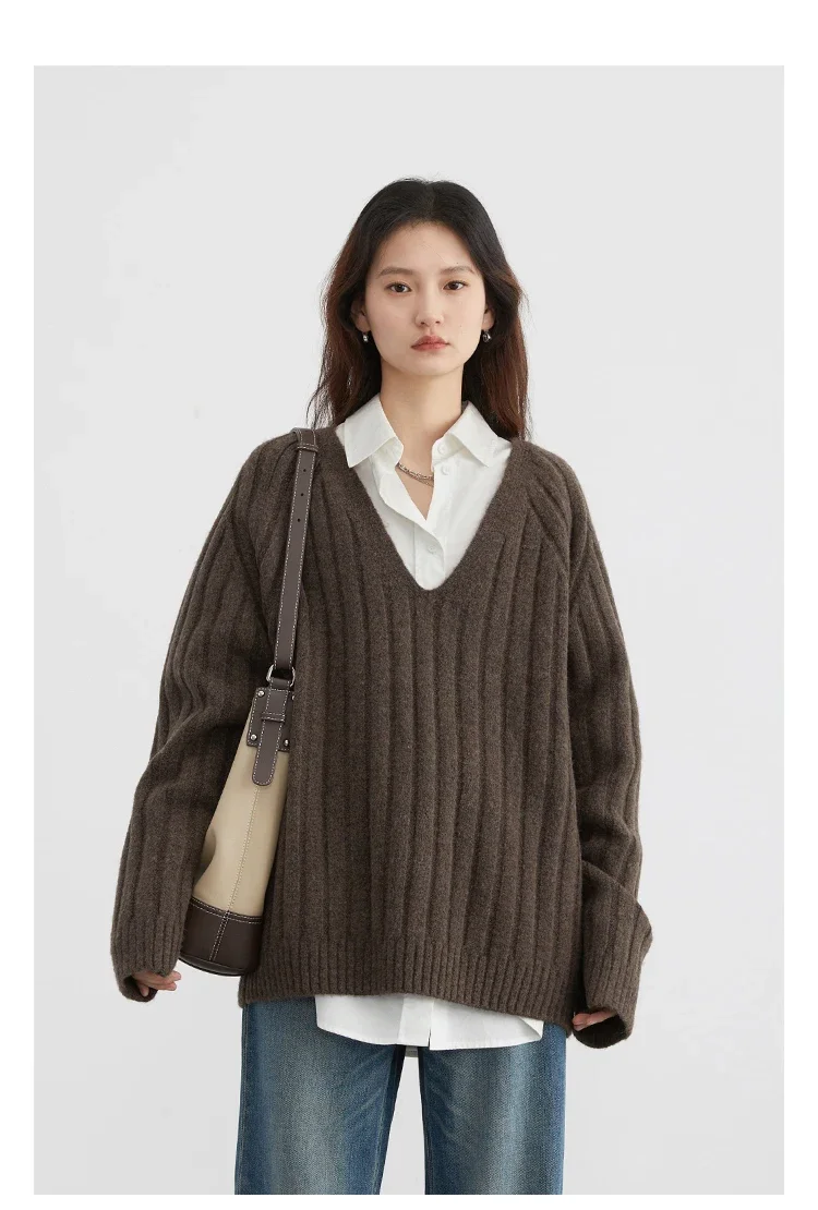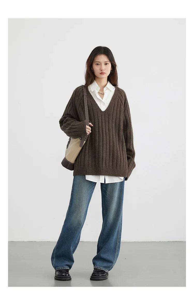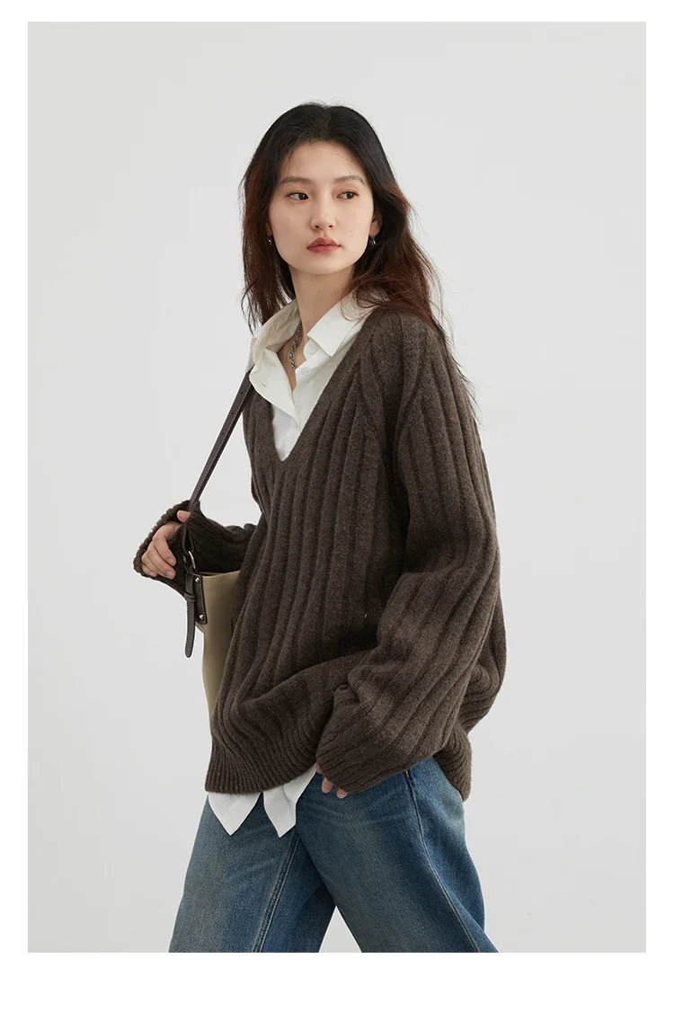 CHIC VEN Women's Sweaters Casual Simple V-Neck Loose Pullovers Soft Pit Stripe Mohair Female Knitted Tops Autumn Winter New 2023