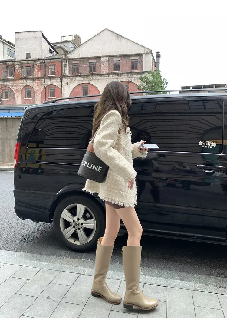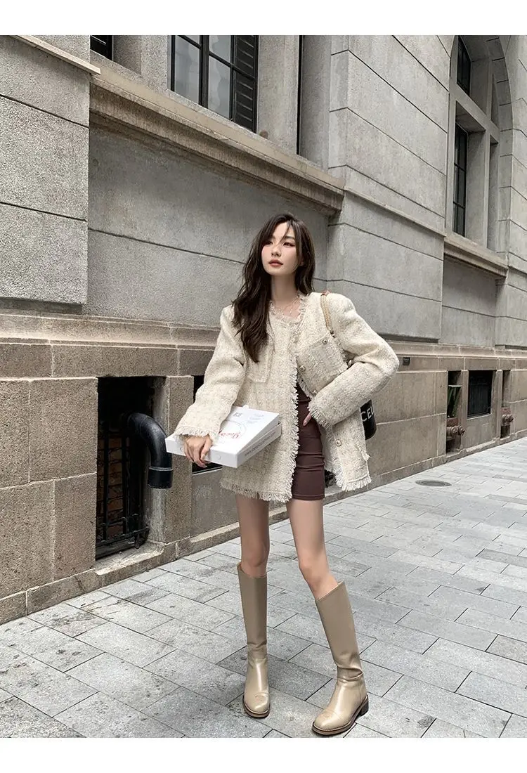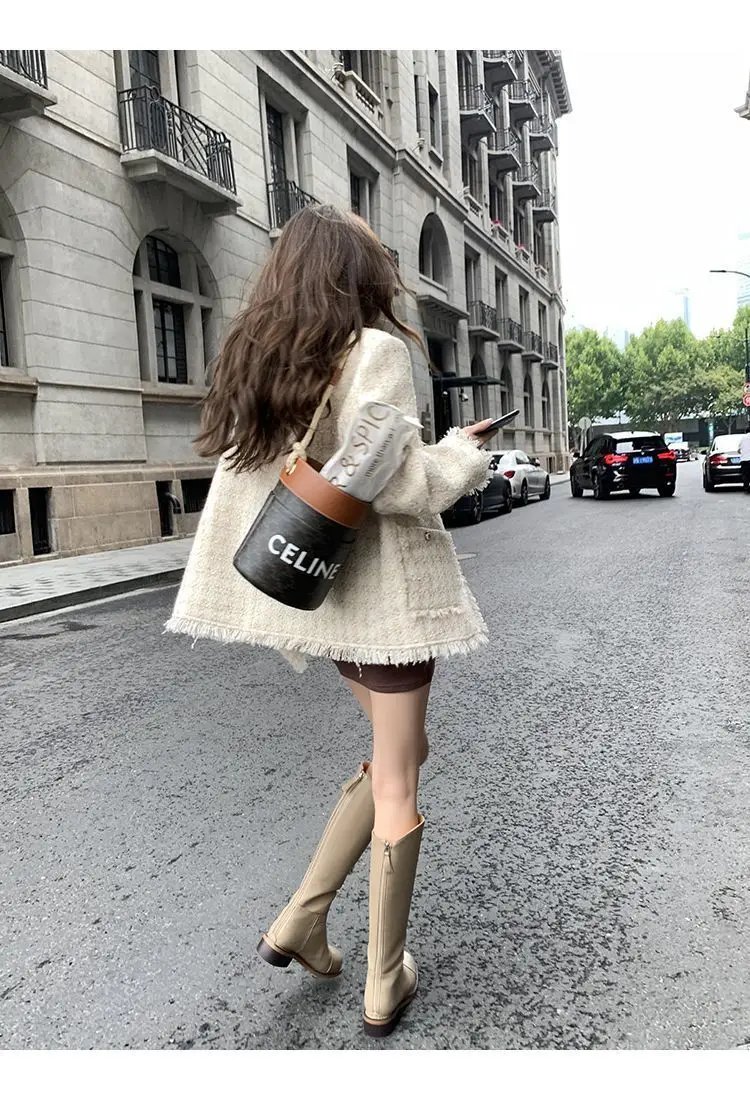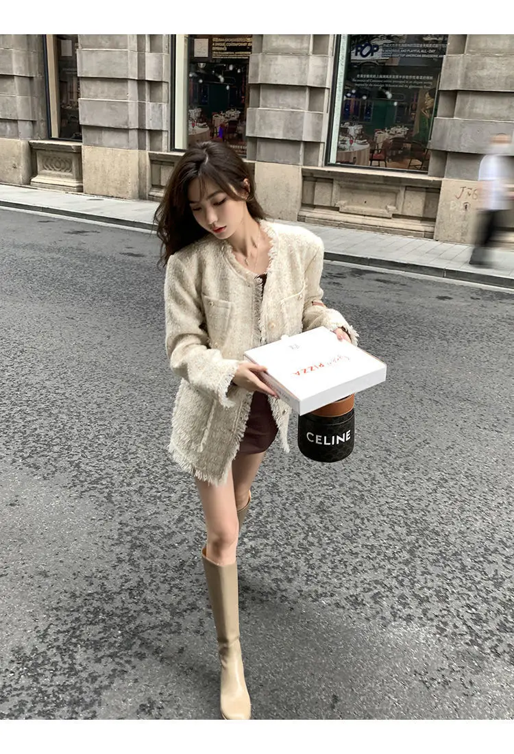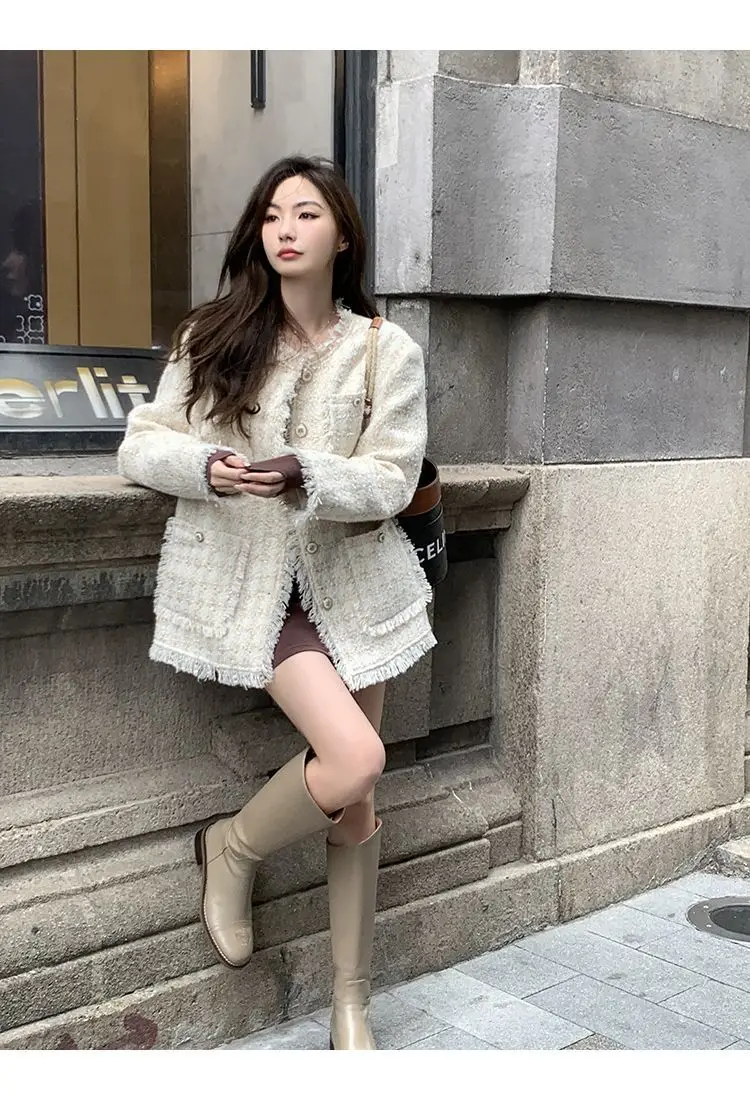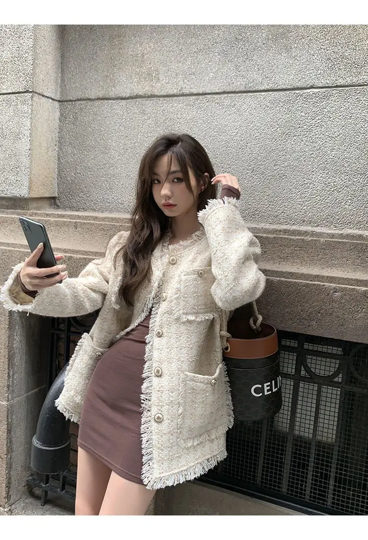 CJFHJE Women's Beige Round Neck Tassel Outerwear Spring Autumn New Korean Fashion Long Sleeve Loose Raw Edge Tweed Women Jacket