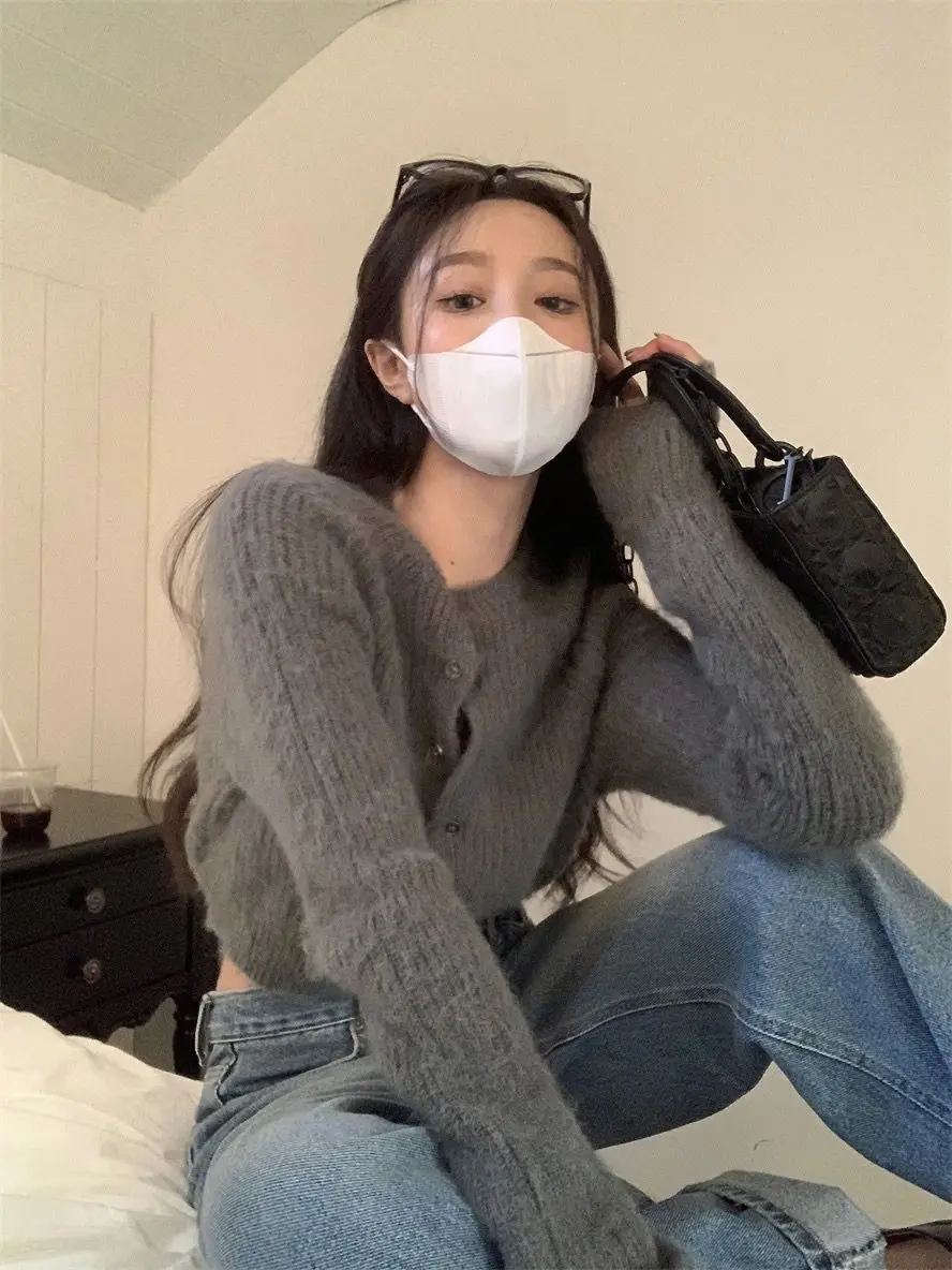 Deeptown White Cropped Women Short Sweaters Harajuku Basic Long Sleeve Slim Cardigan Warm Autumn Korean Fashion Office Lady
