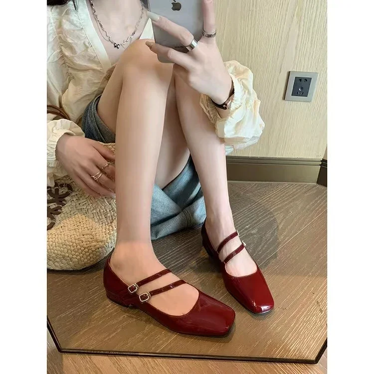 Designer Shoes Women's Flats Patent Leather Mary Janes Shoes Square Toe Double Buckle Red Low Heels Female Autumn Zaptos Mujer