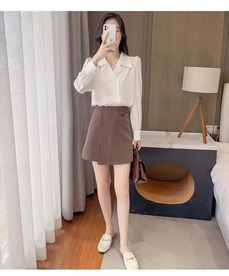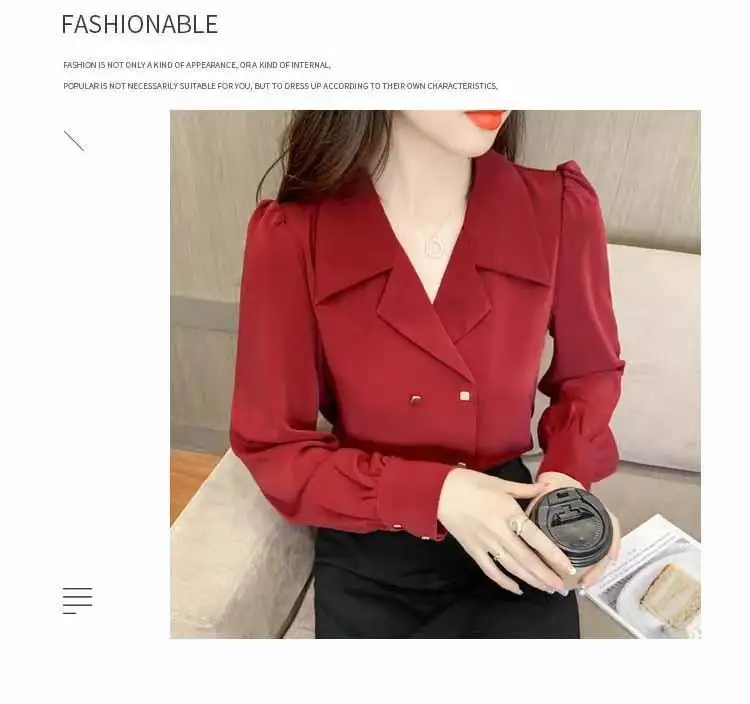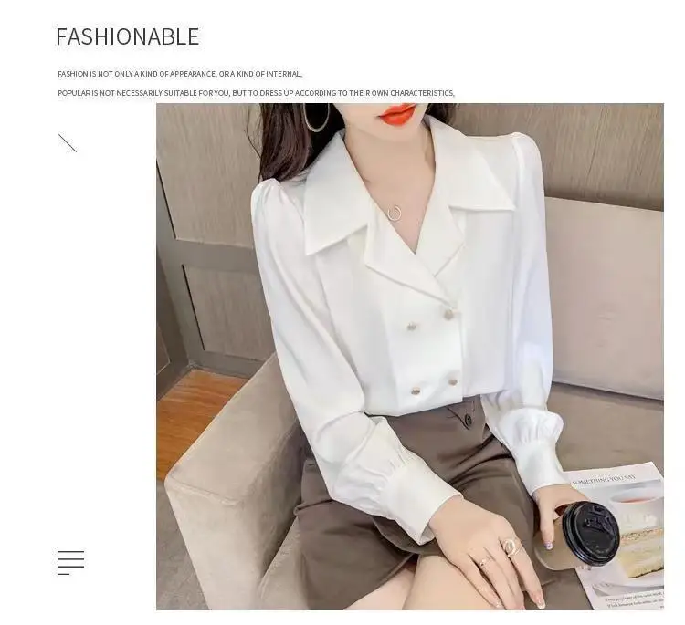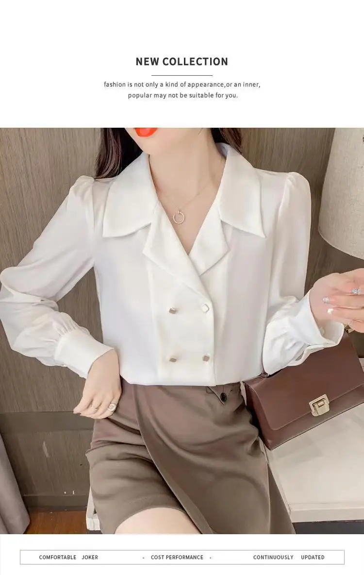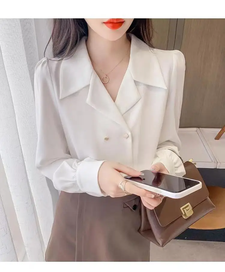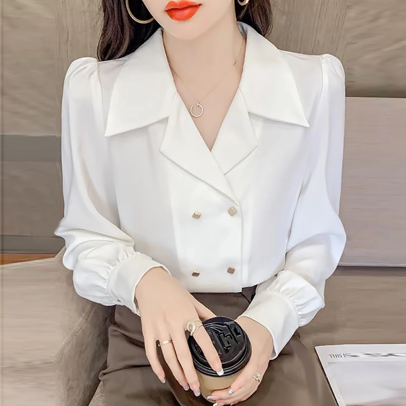 Double Breasted French Turn Down Collar Long-sleeve Solid Top Office Lady Shirt And Blouses Casual Woman Clothing Simple Elegant