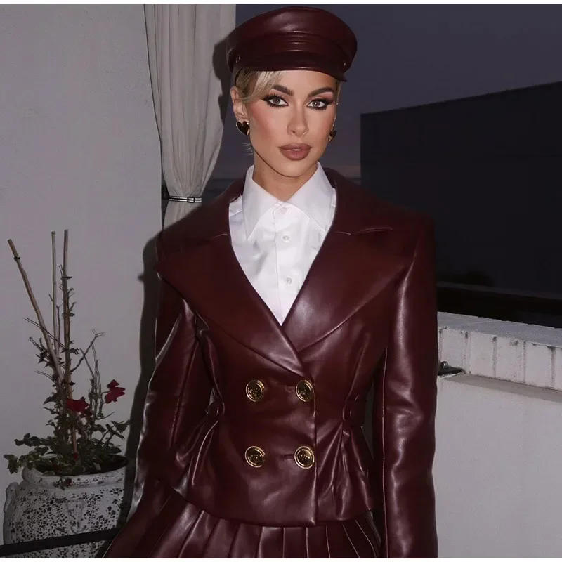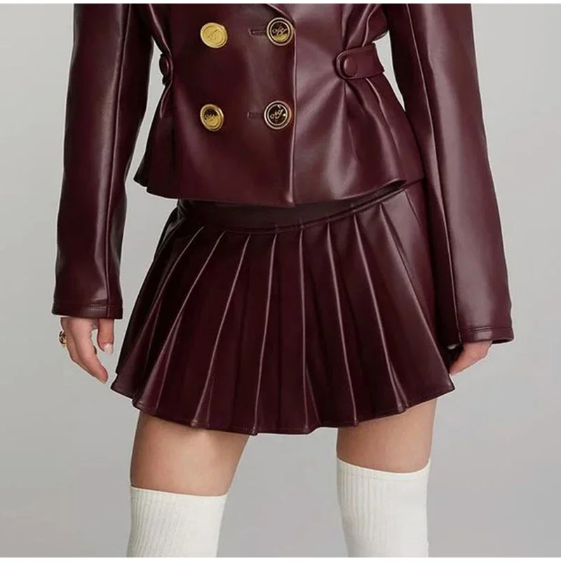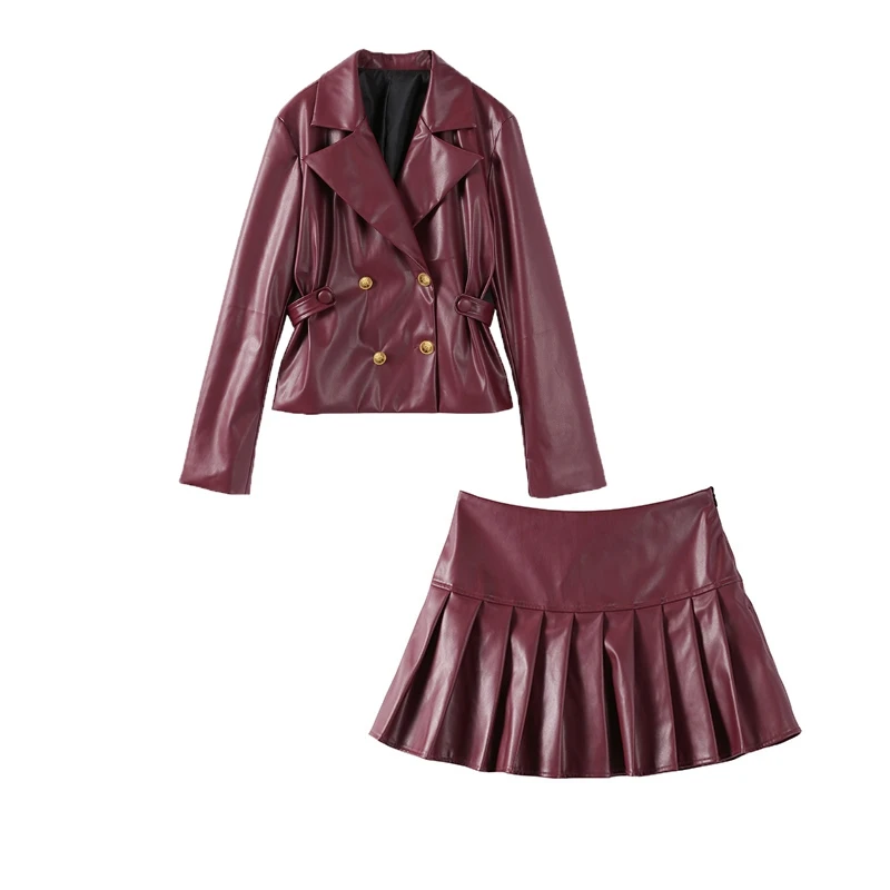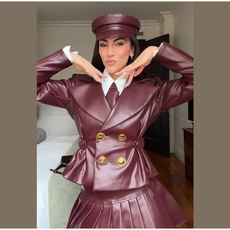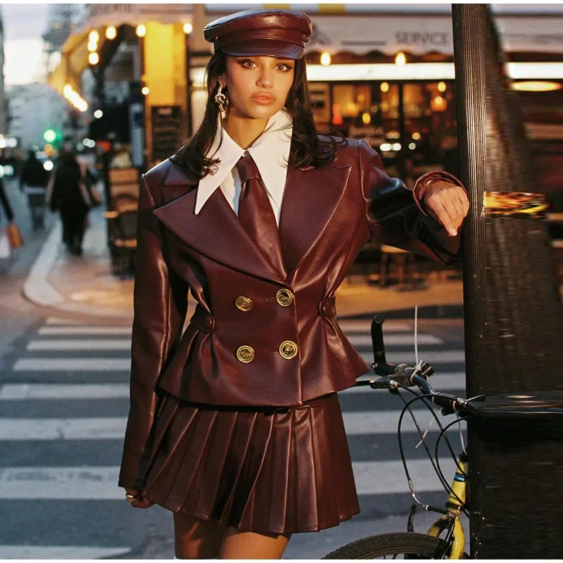 Double Breasted Leather Jacket Skirts Set Women Wine Red Lapel Slim Coat Pleated Mini Skirt 2024 Autumn New Lady Chic Outfits