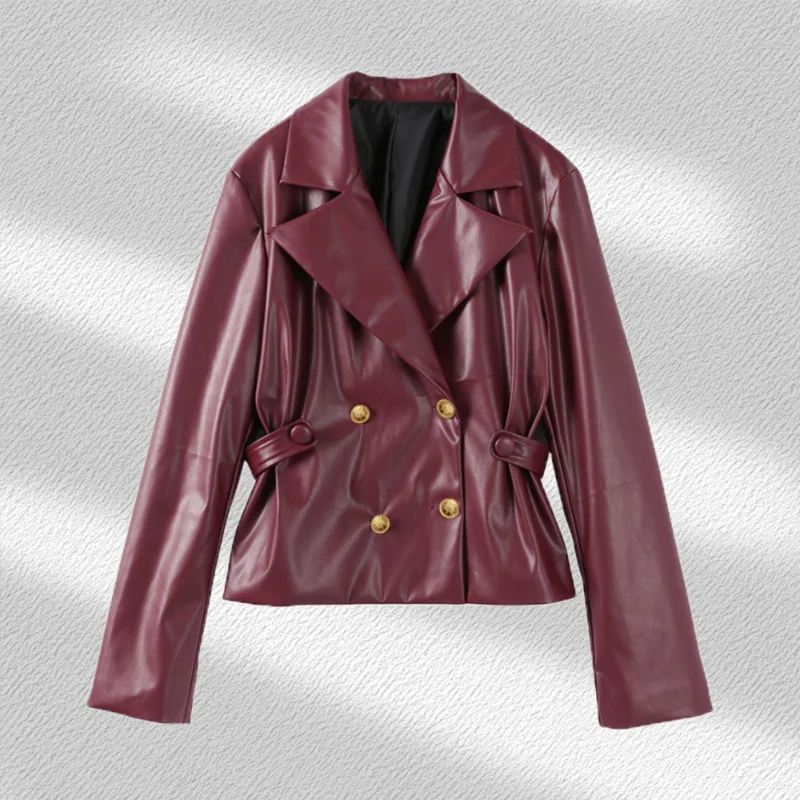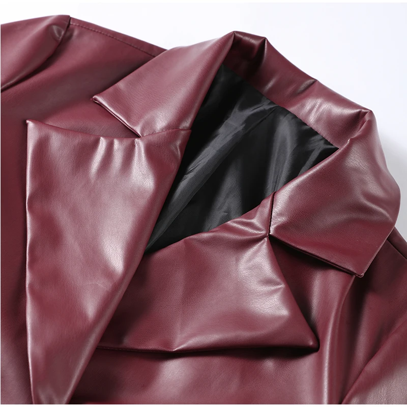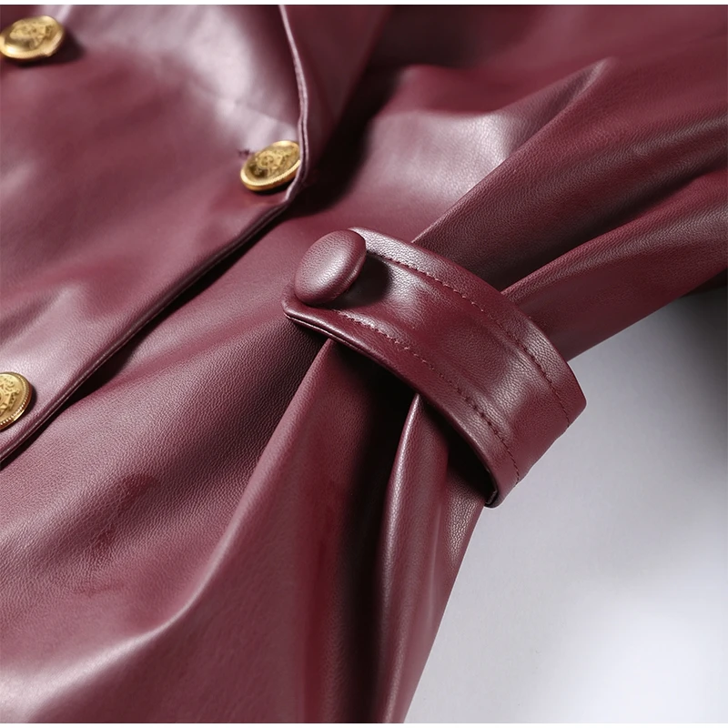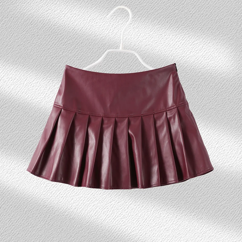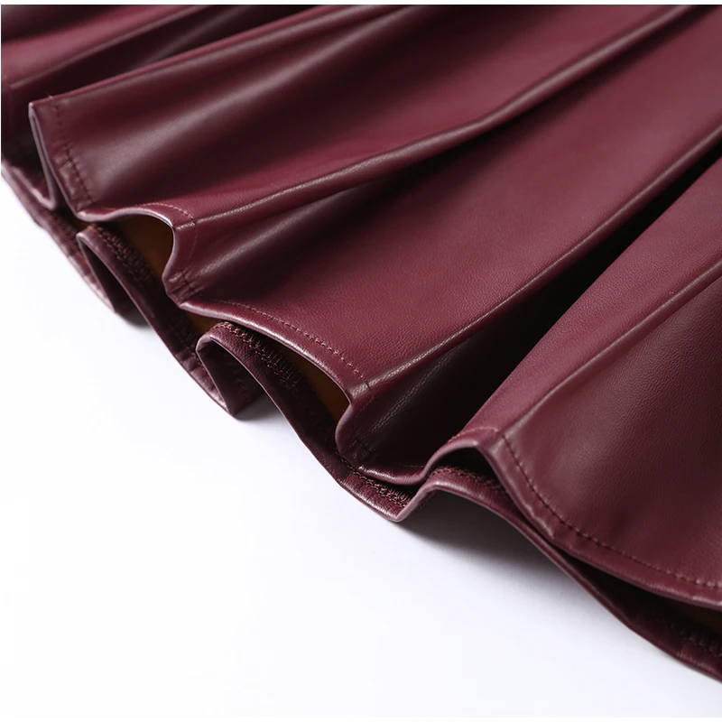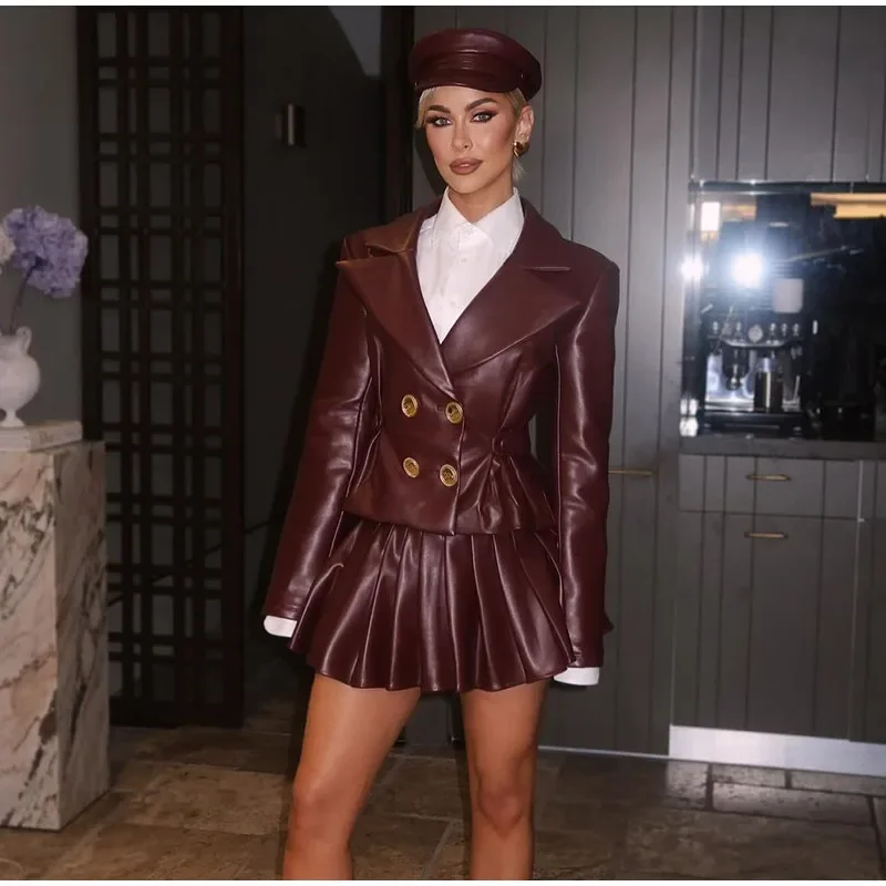Double Breasted Leather Jacket Skirts Set Women Wine Red Lapel Slim Coat Pleated Mini Skirt 2024 Autumn New Lady Chic Outfits