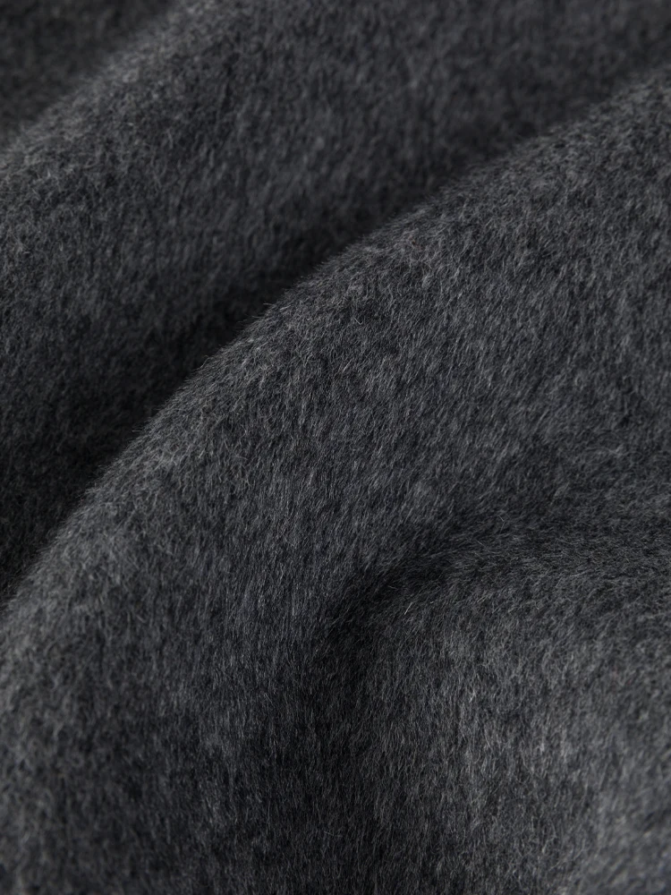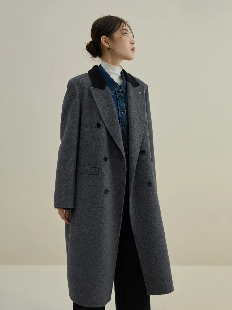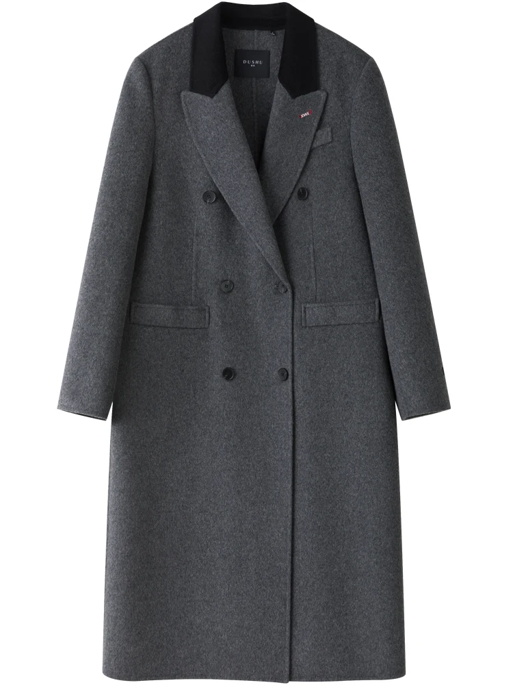 DUSHU 100% Wool Dark Grey Women Temperament Double Breasted Long Woolen Jacket Notched Collar Front Shoulder Commute Woolen Coat