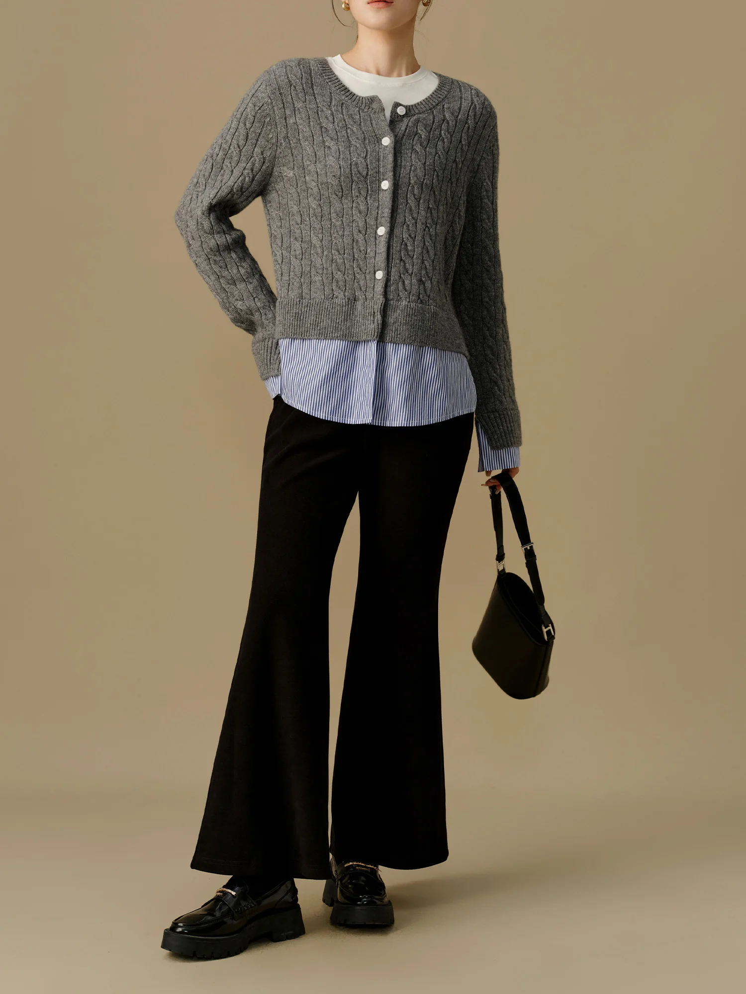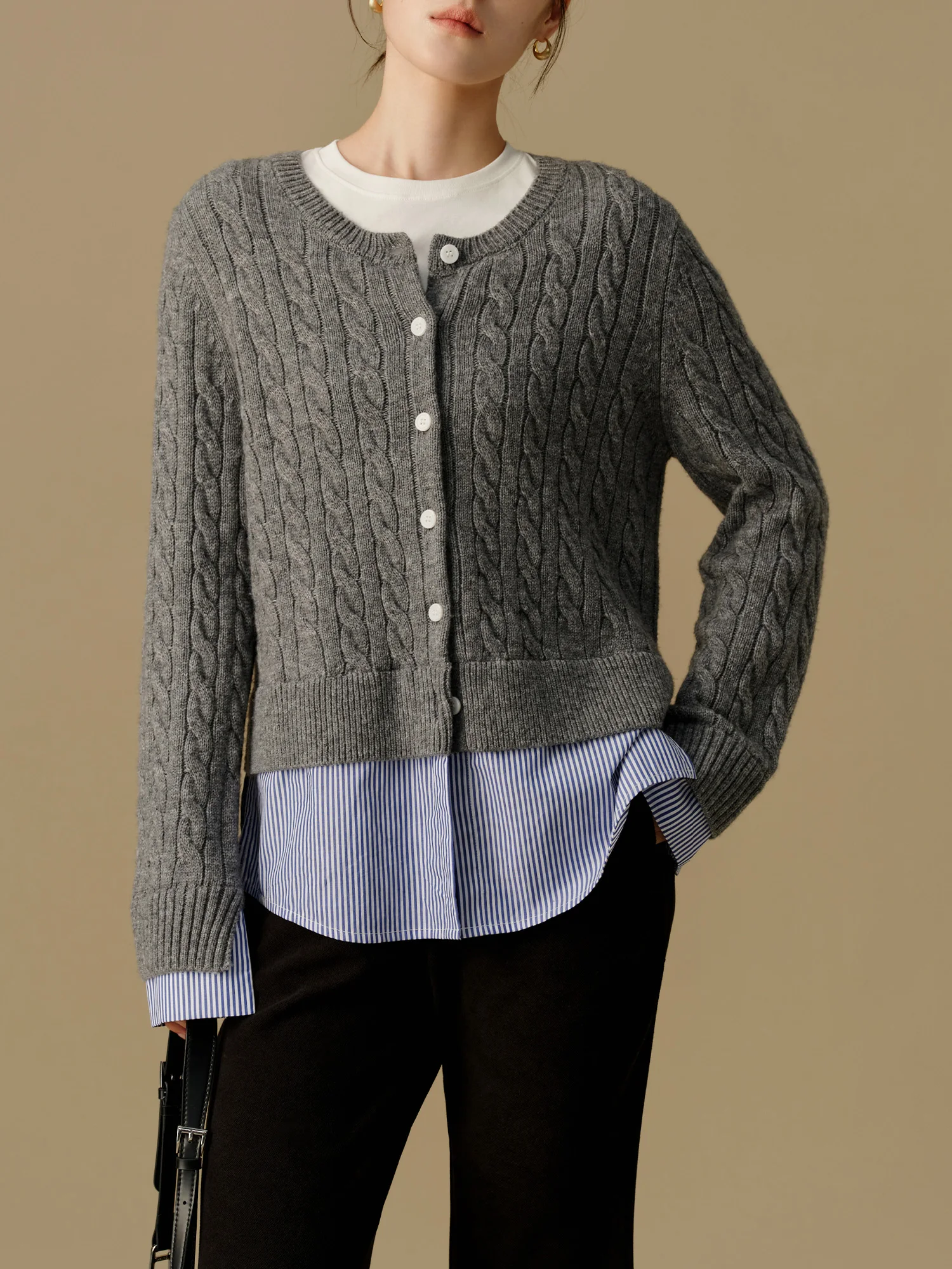DUSHU 31.2% Wool Women Grey Cardigans Parchwork Stripe Design Female Winter Coat Tops Women Round Neck Wool Coats 24DS84448