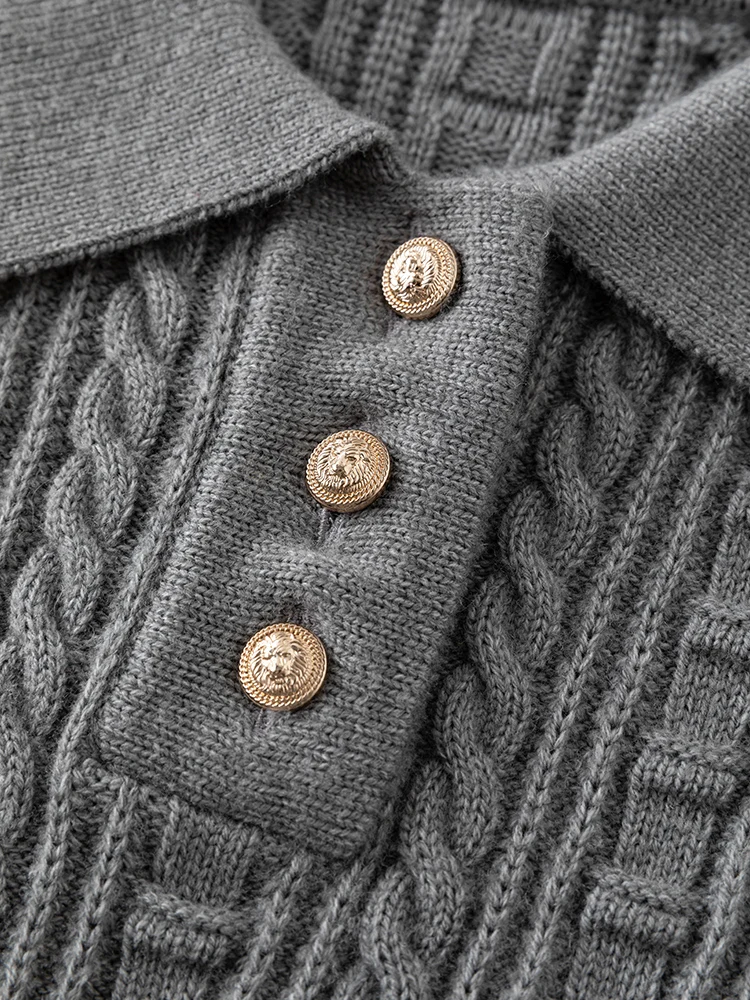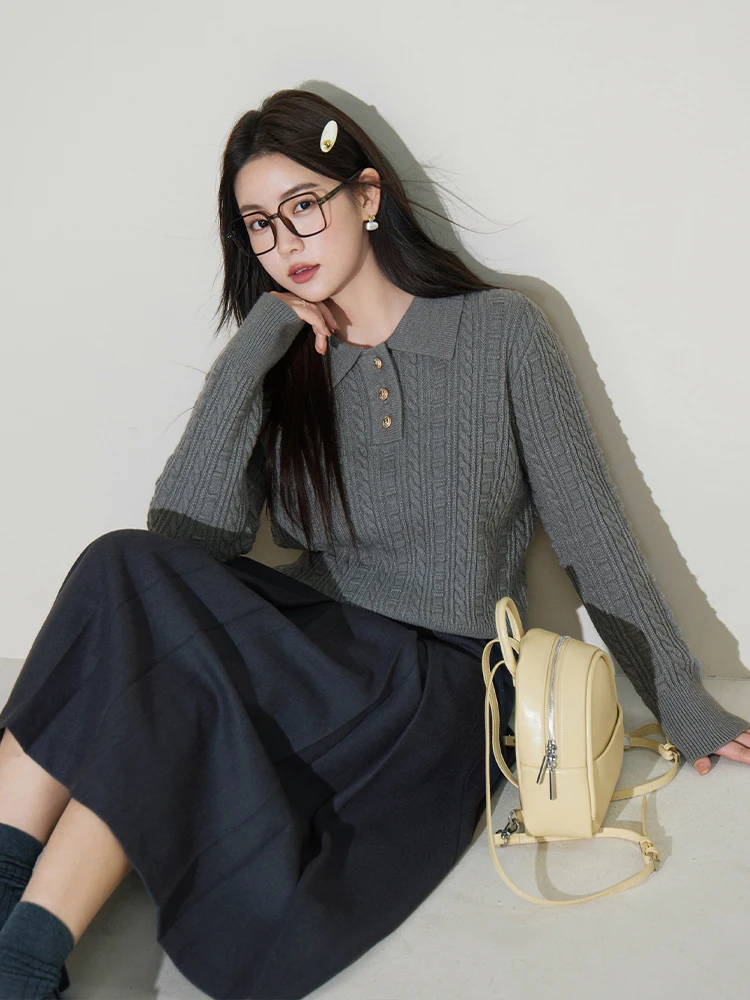 DUSHU 9.4% Wool Polo Neck Front Shoulder Women Dark Grey Winter Short Pullovers Three Mental Button Design Female Sweater