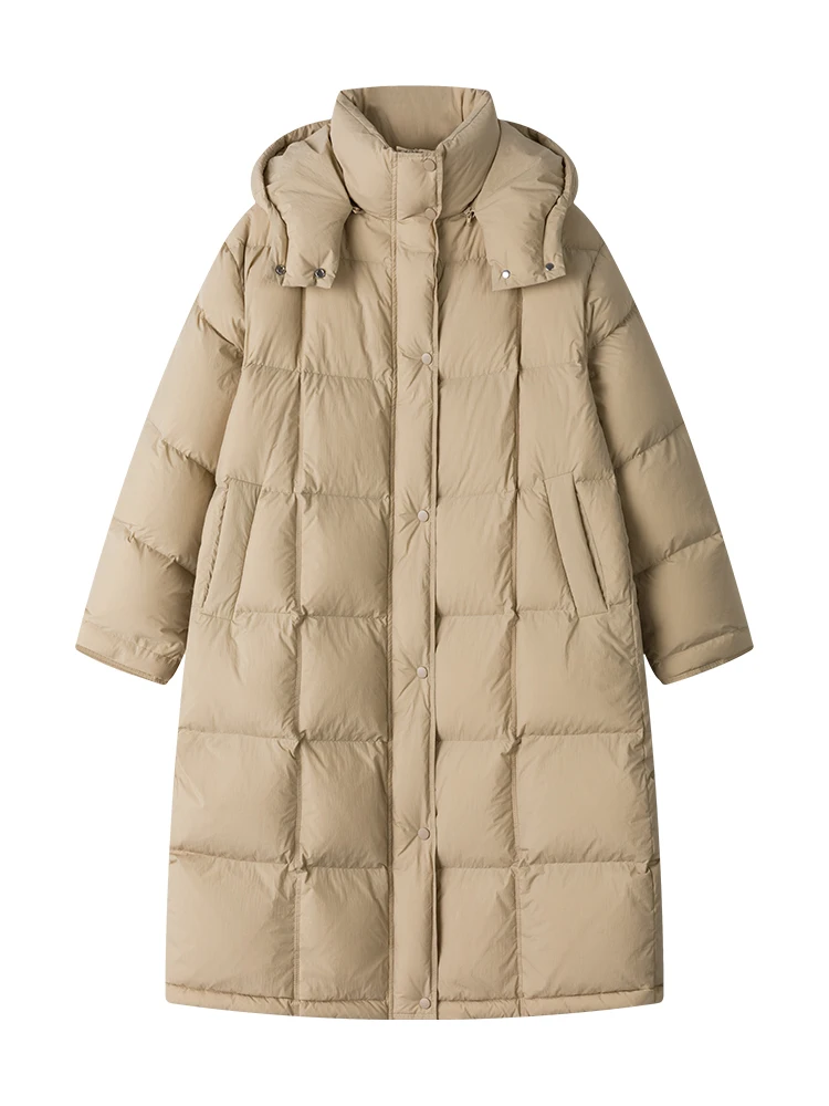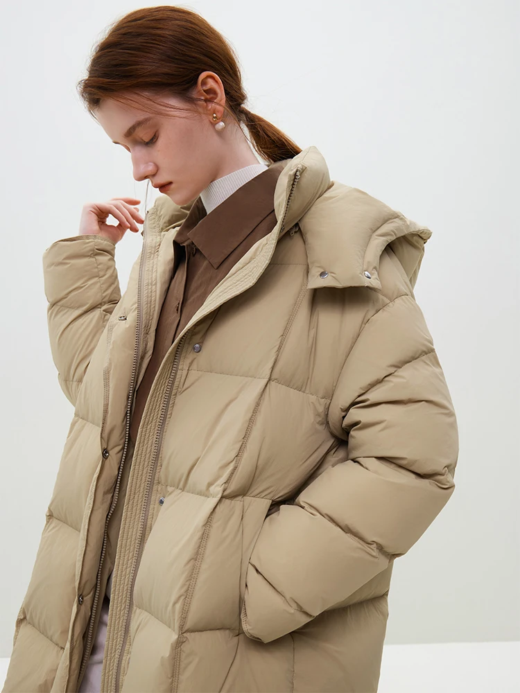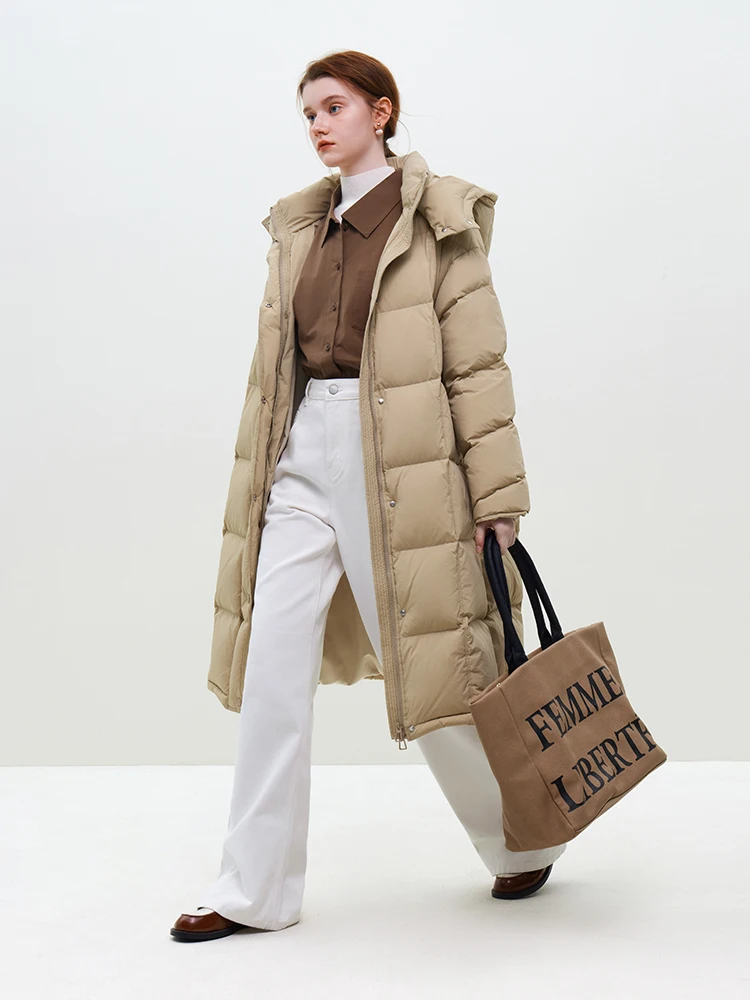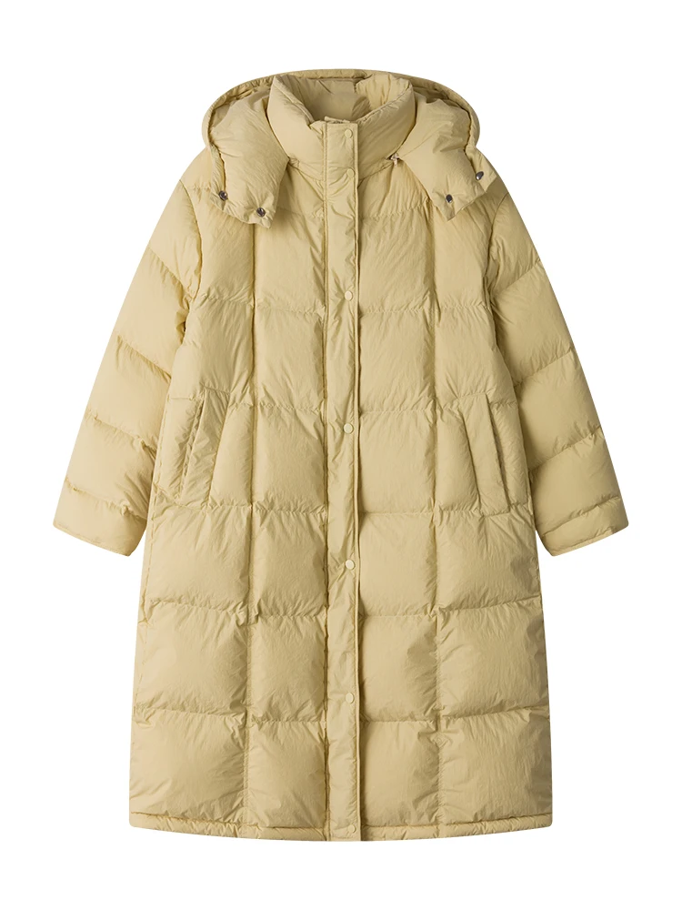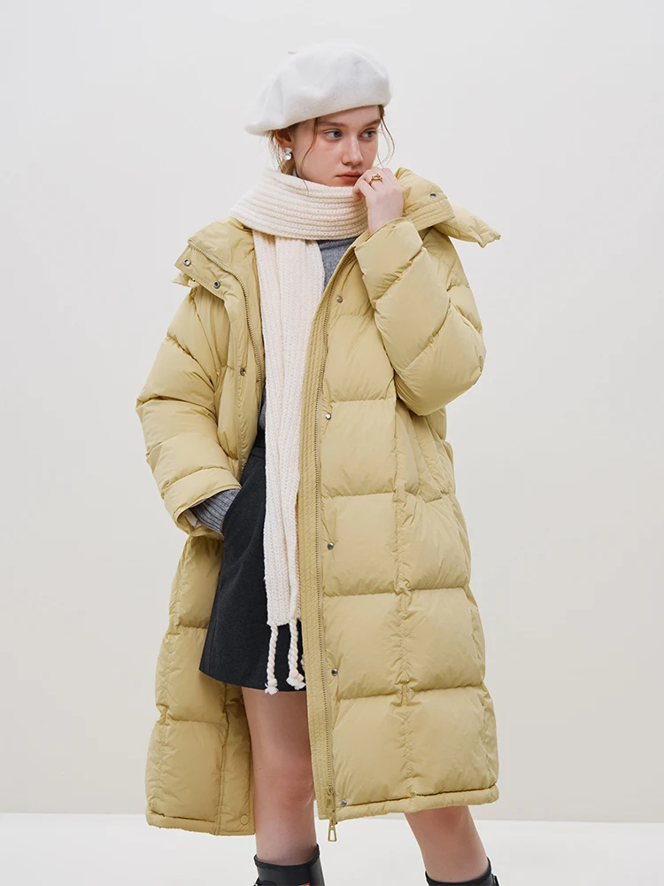 FSLE 240G Filling Capacity Retro Urban Commute Simple Korean Style Hooded Mid-Length Down Jacket Yellow Thicken Female Down Coat