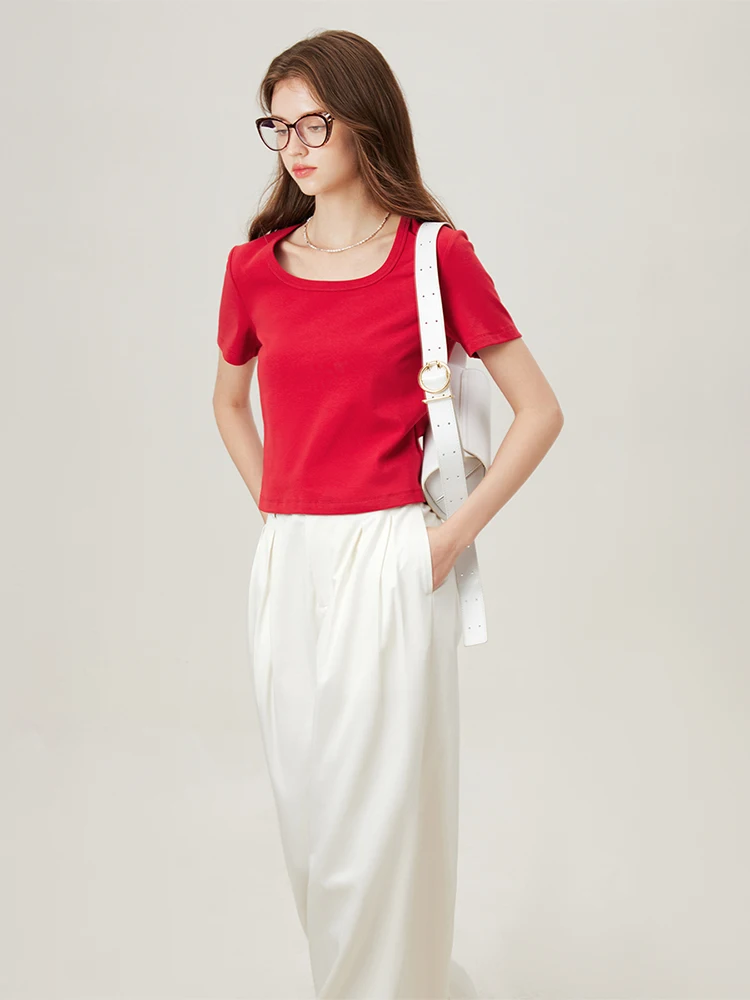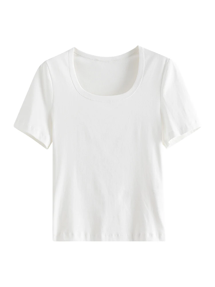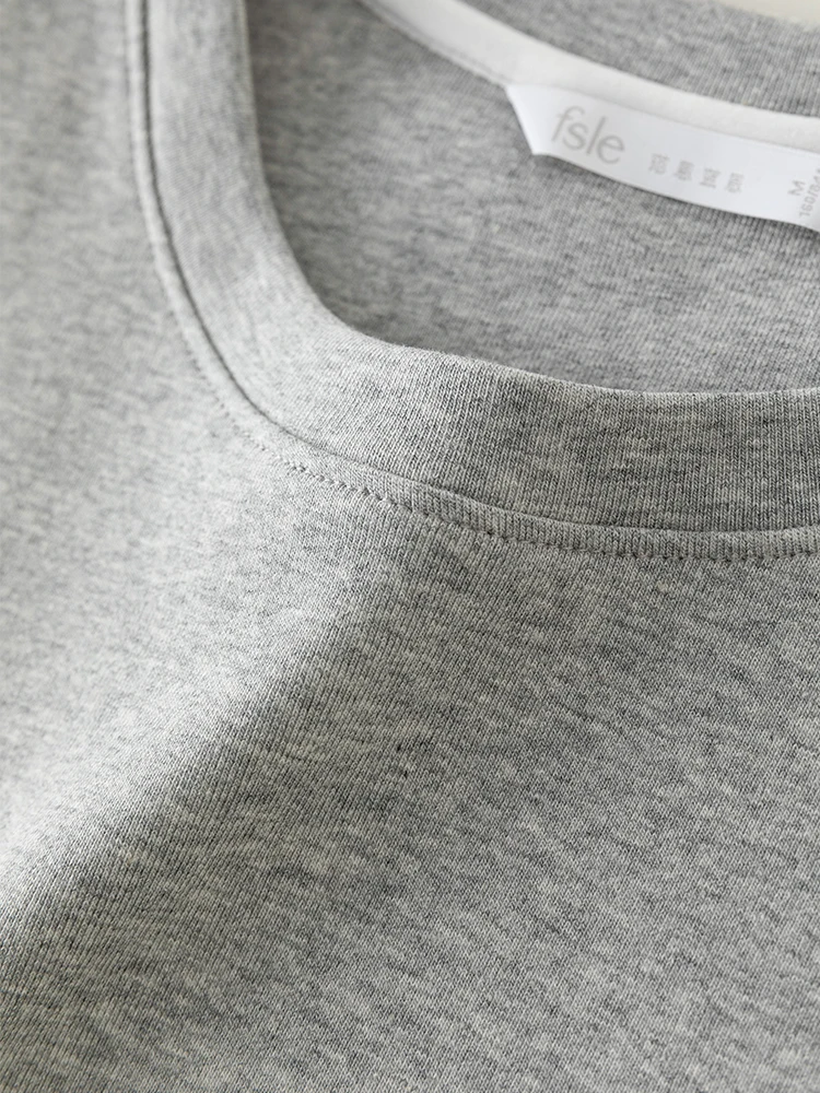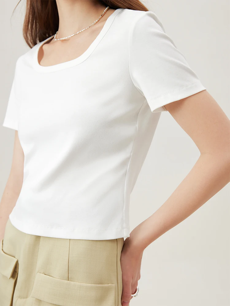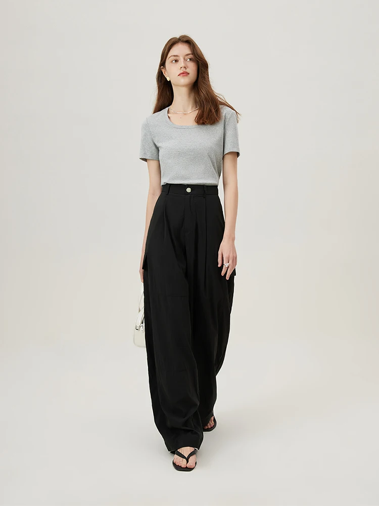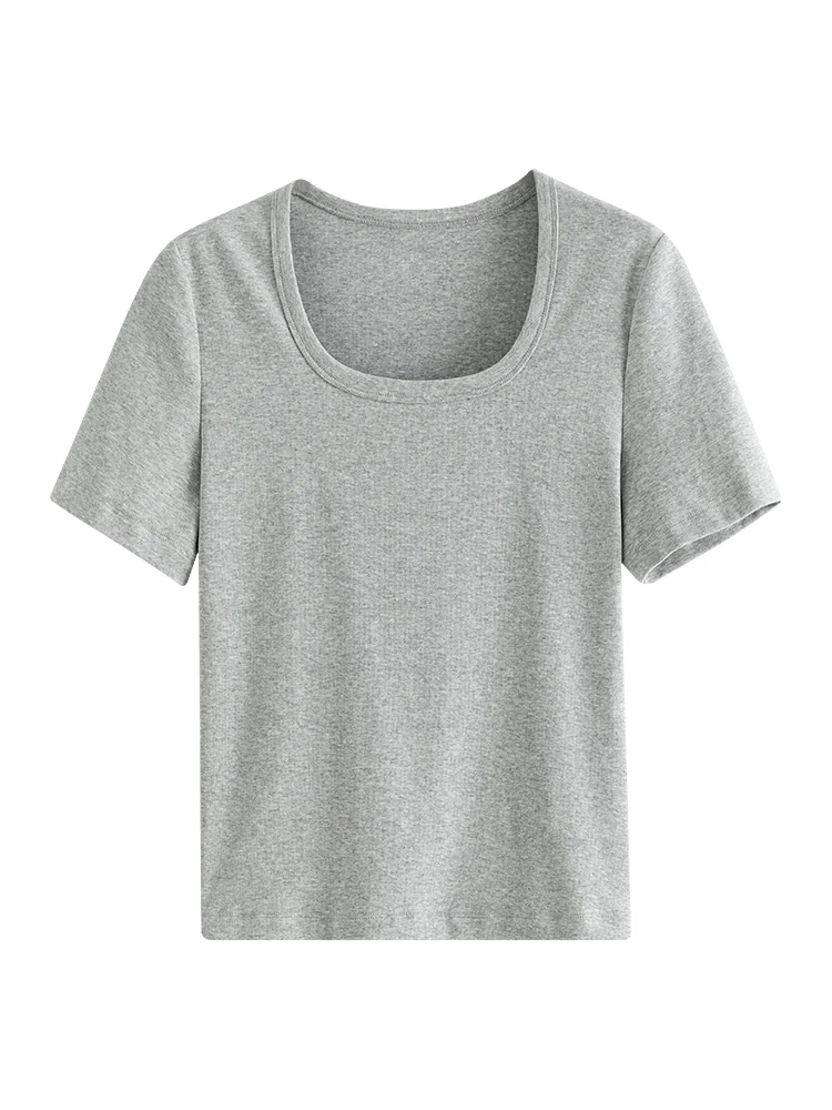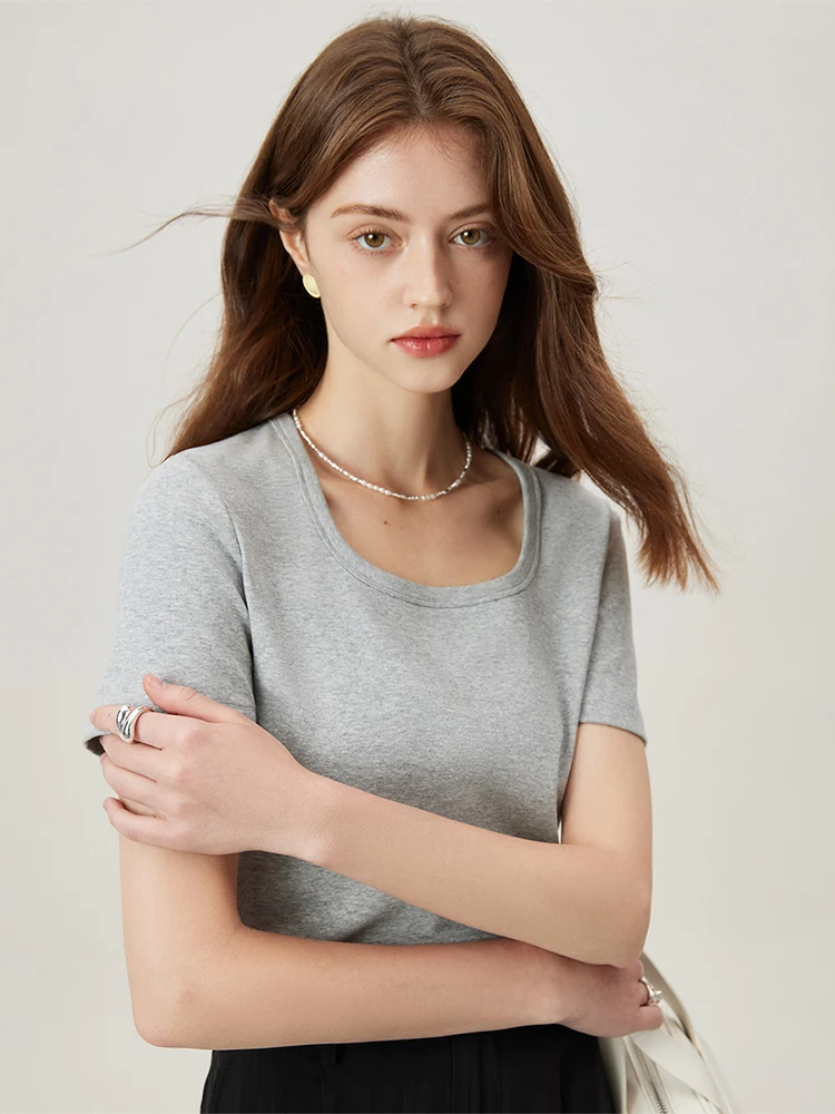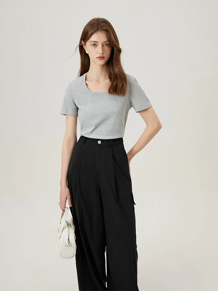 FSLE【4 Colors】Women Round Neck Casual Grey Summer T-Shirt Black Cotton Square Neck Short Sleeve Elastic Tees 24FS12797+24FS12798