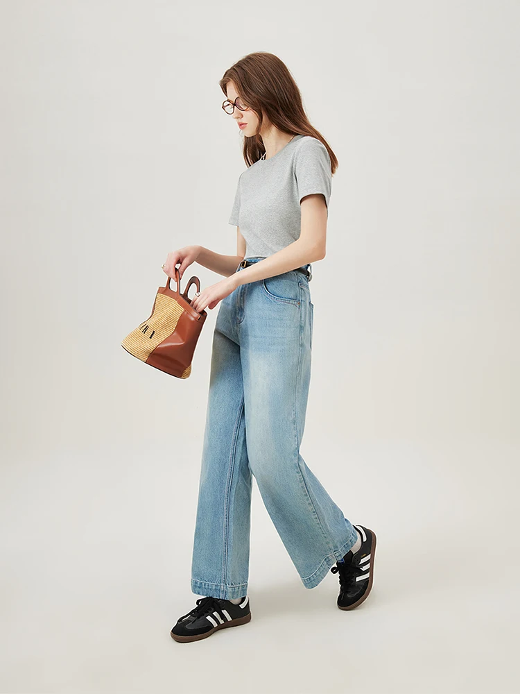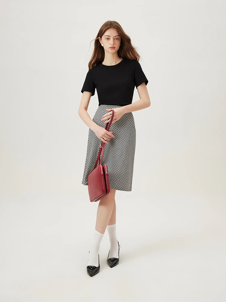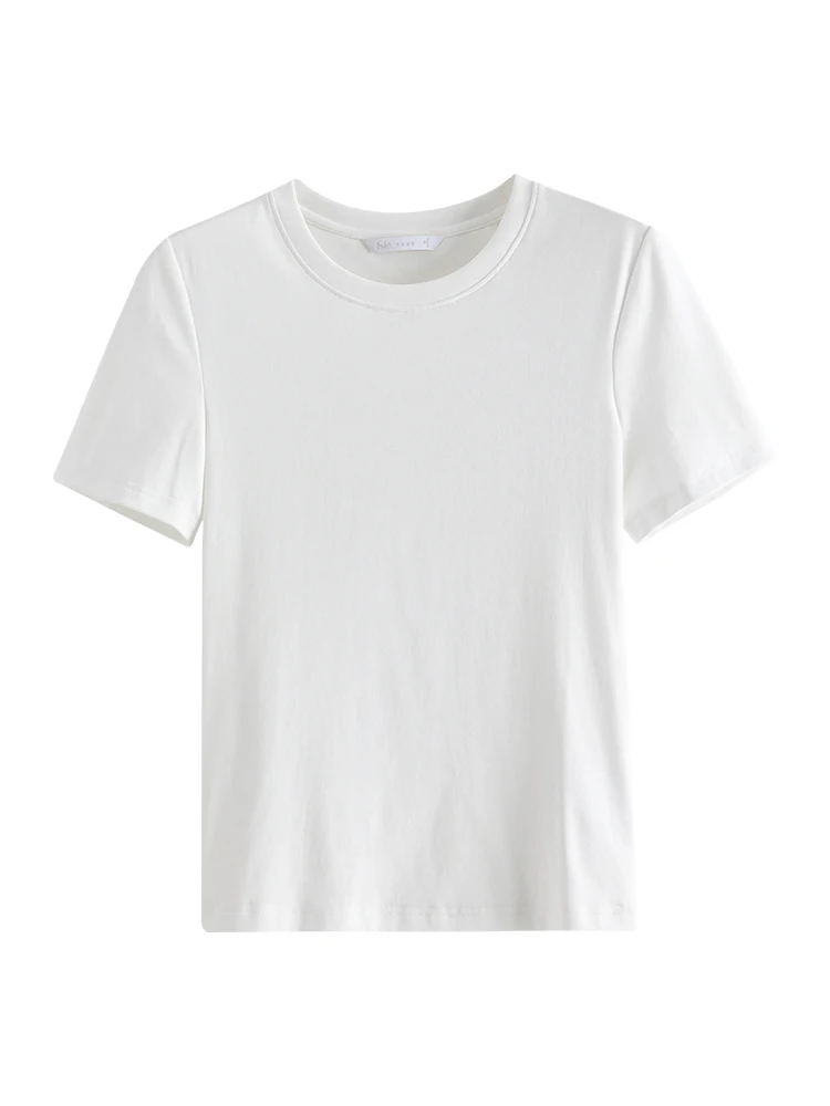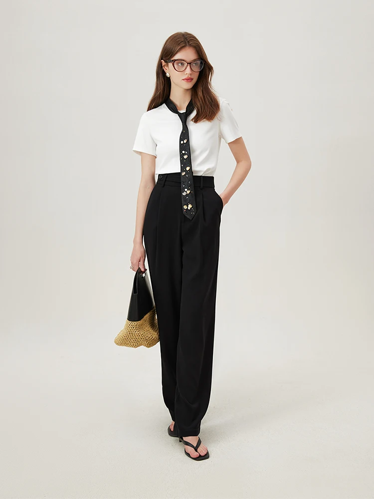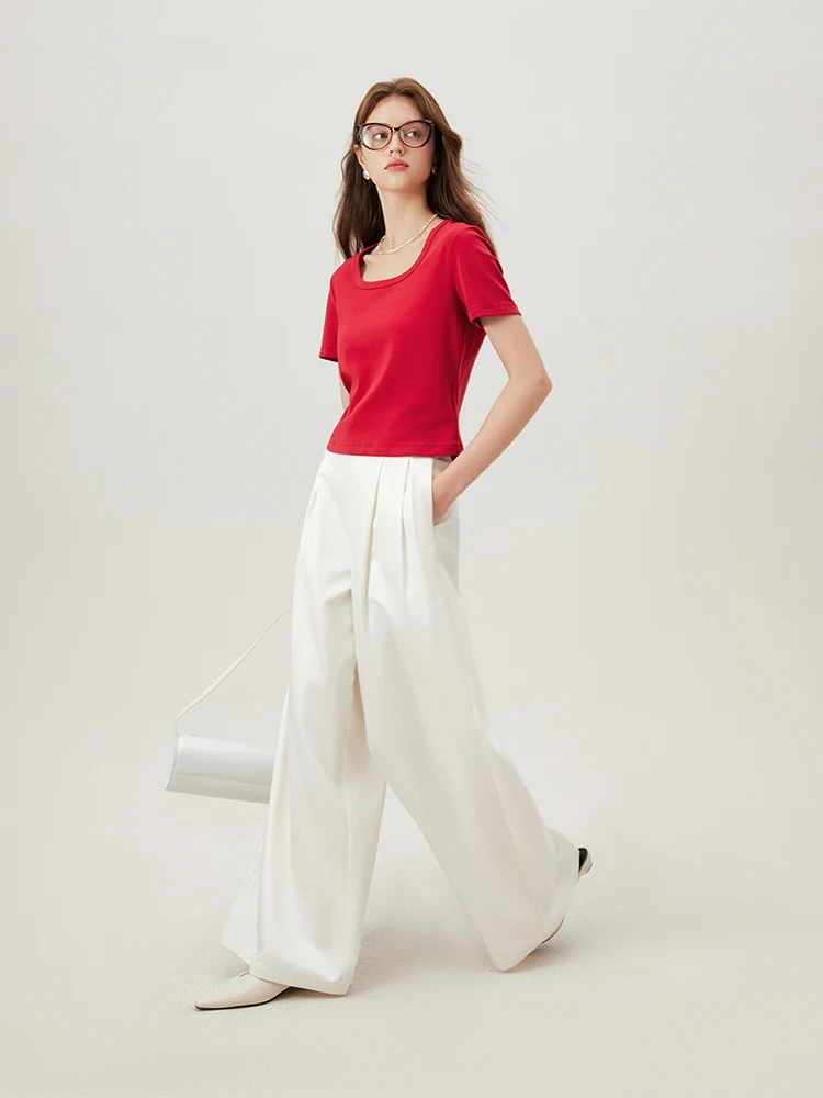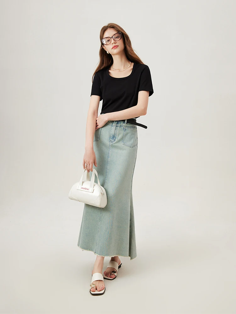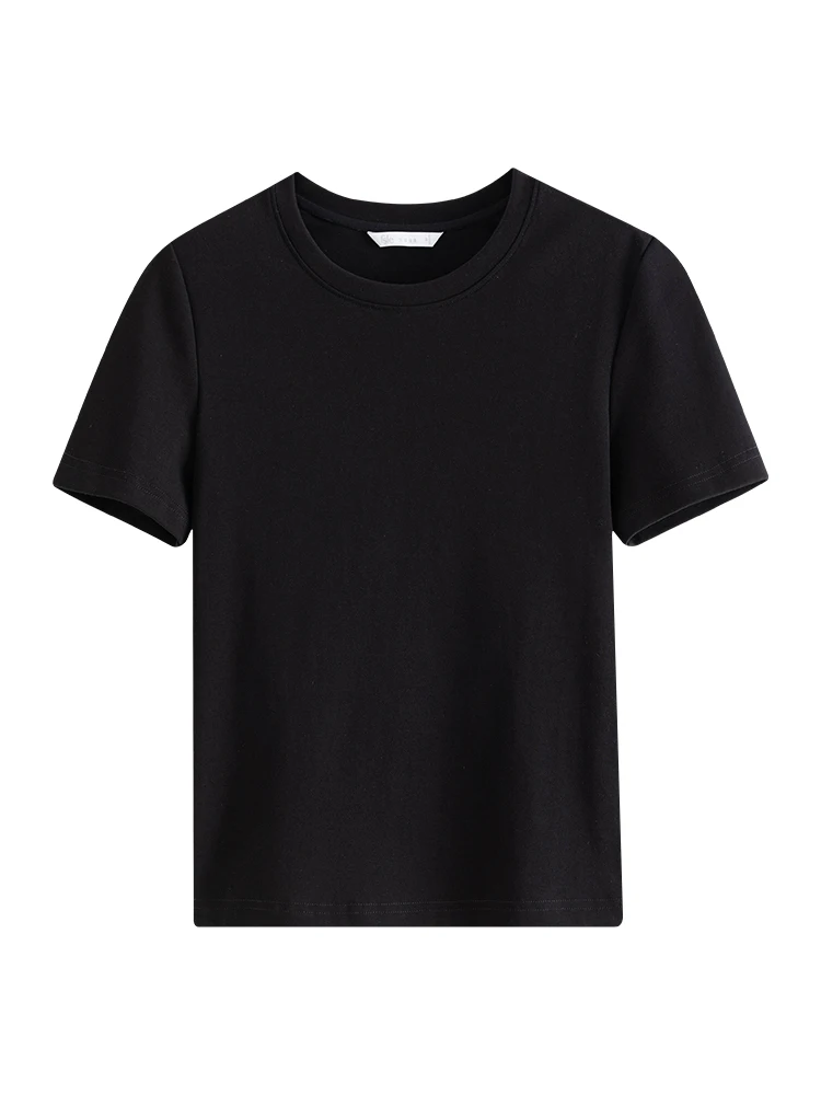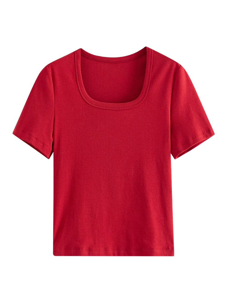 FSLE【4 Colors】Women Round Neck Casual Grey Summer T-Shirt Black Cotton Square Neck Short Sleeve Elastic Tees 24FS12797+24FS12798
