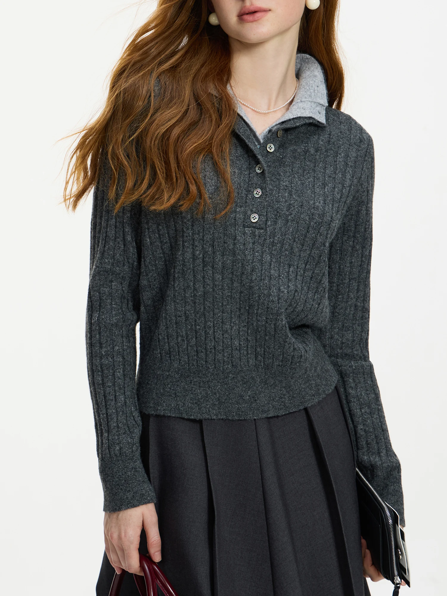 FSLE 6.2% Wool Collision Gray Fake Two-piece Stand-up Collar Versatile Knit Sweater 2024 New Versatile Casual Tops 24FS14162