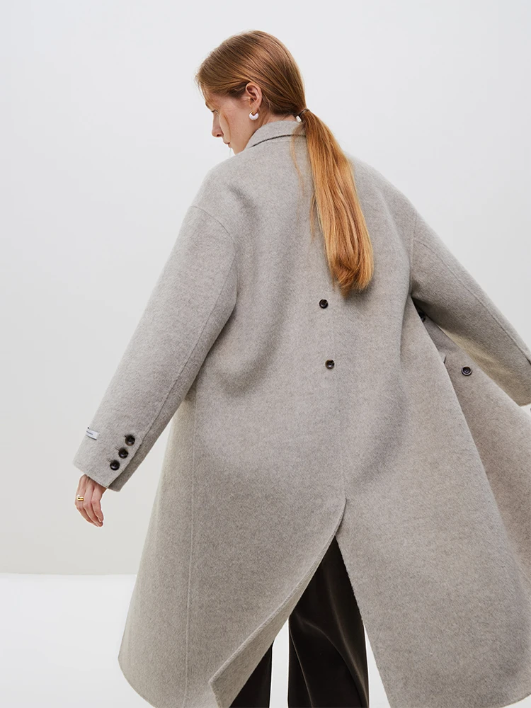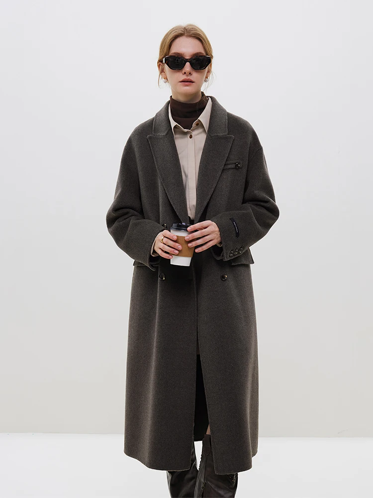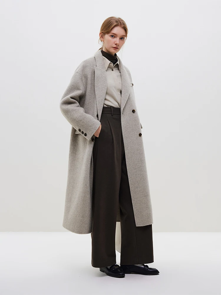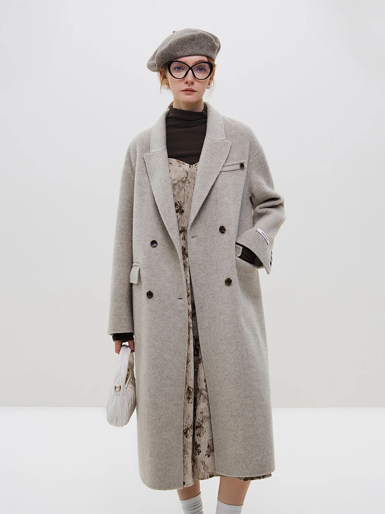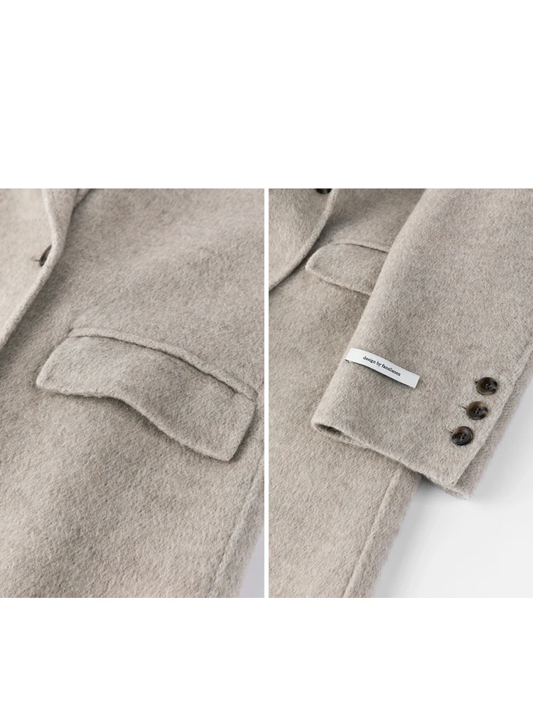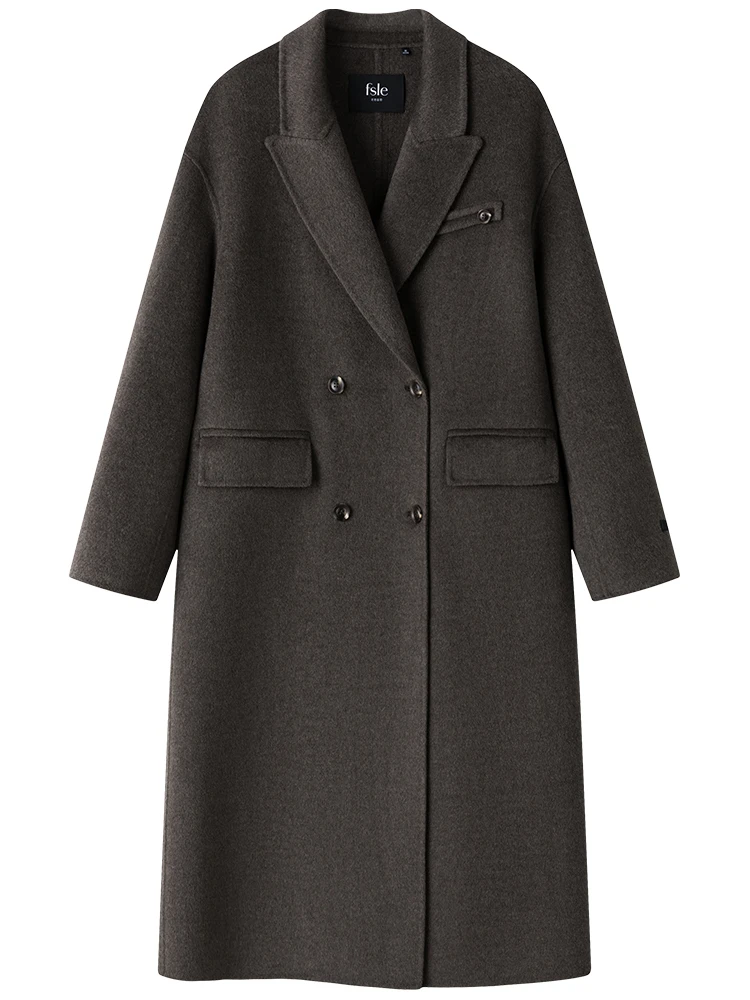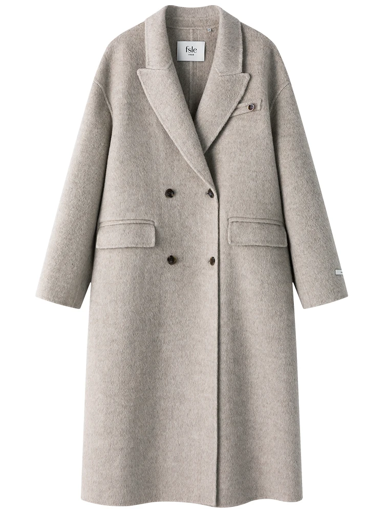 FSLE 95.2% Wool 4.8% Camel Hair Temperament Oatmeal Long Woolen Jackets Notched Collar Double Breasted Button Decoration Coats
