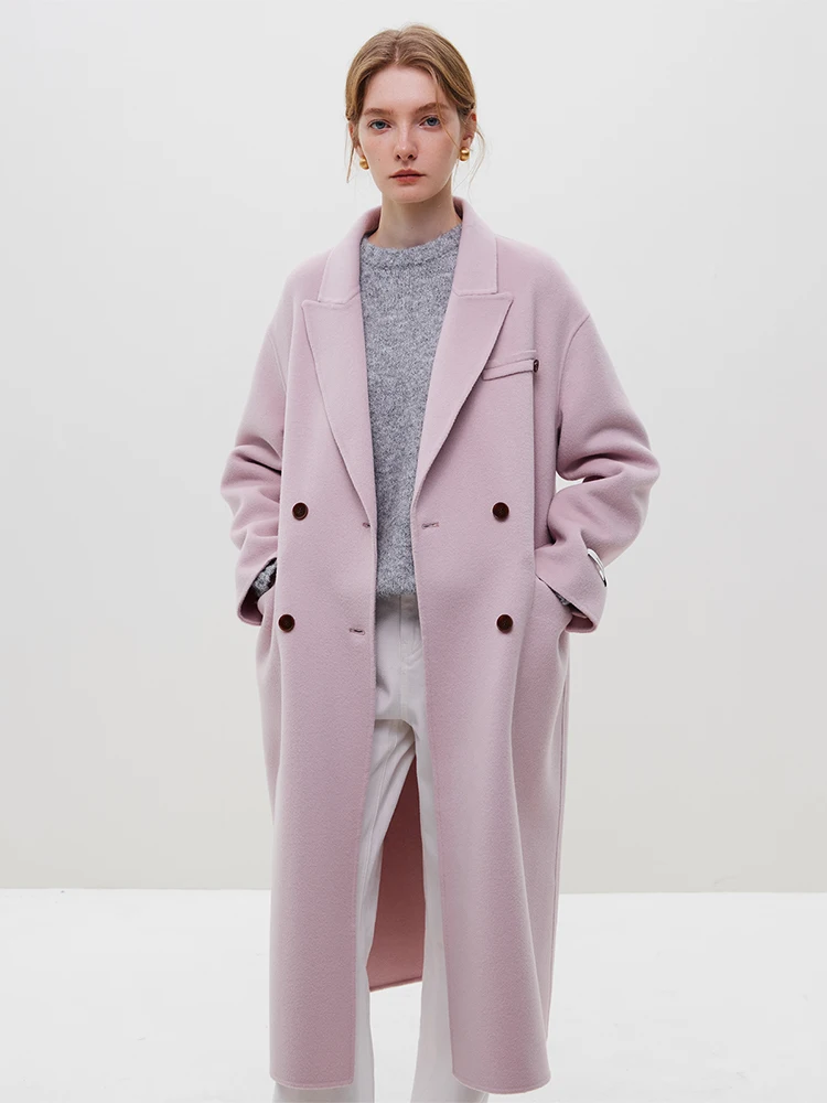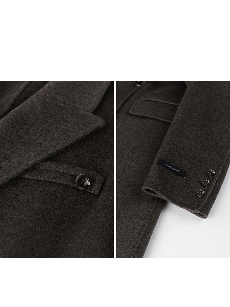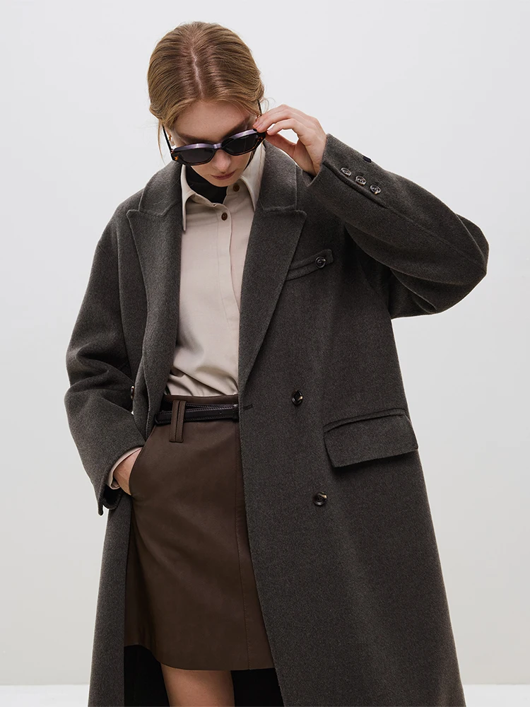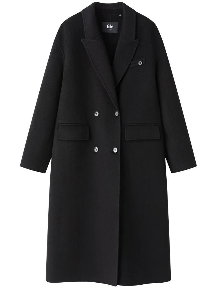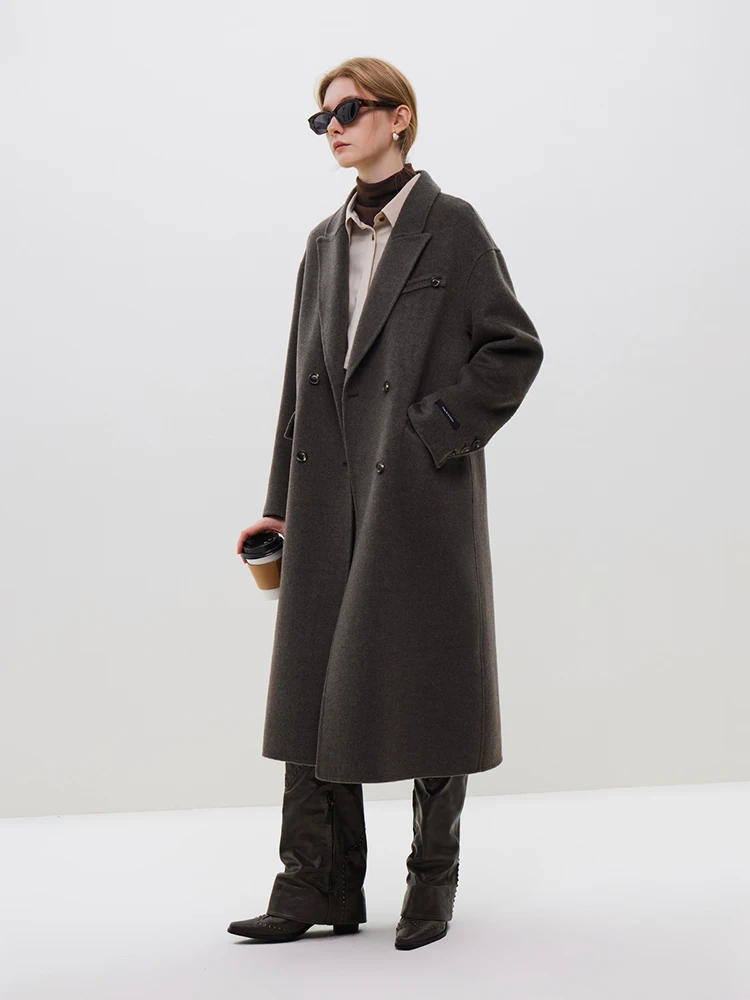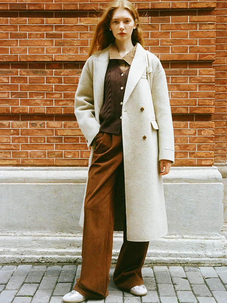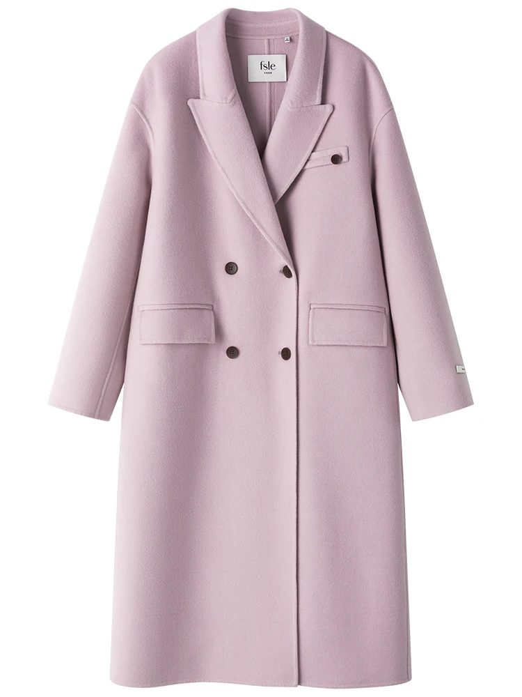 FSLE 95.2% Wool 4.8% Camel Hair Temperament Oatmeal Long Woolen Jackets Notched Collar Double Breasted Button Decoration Coats