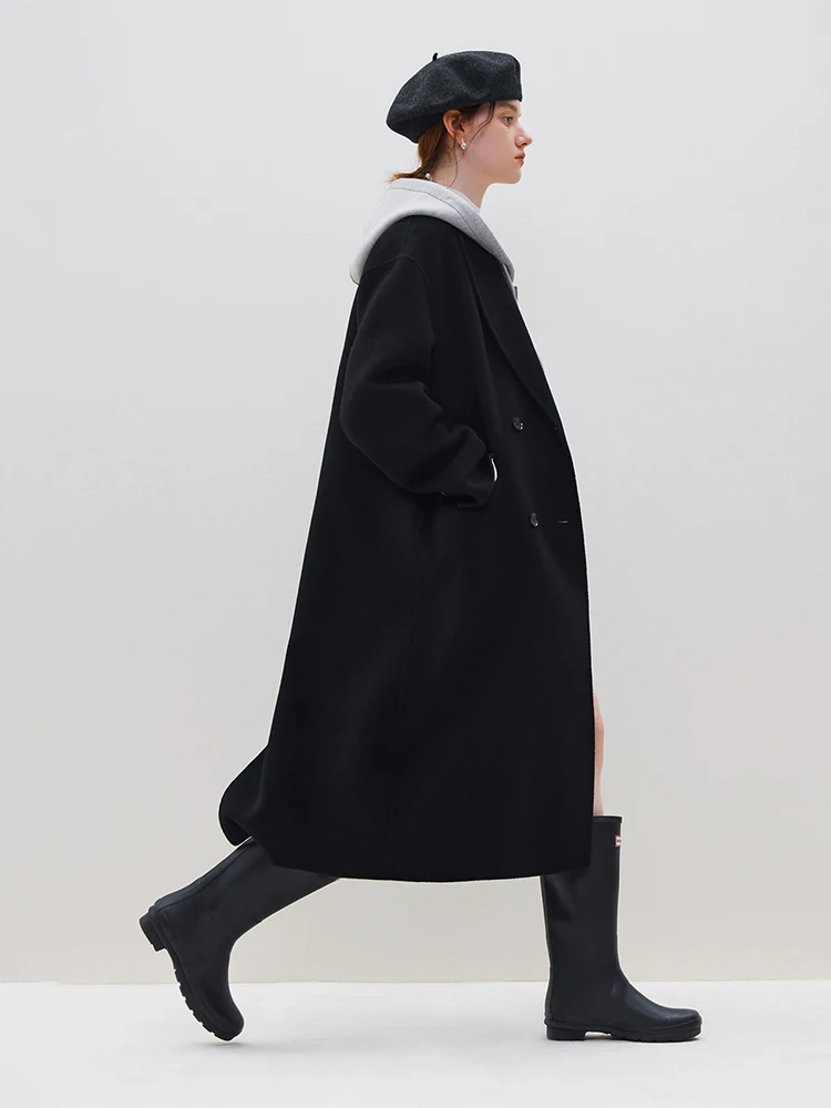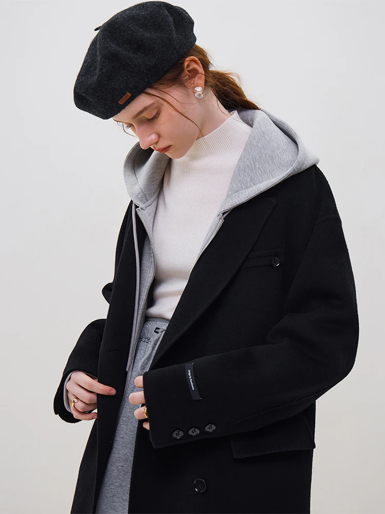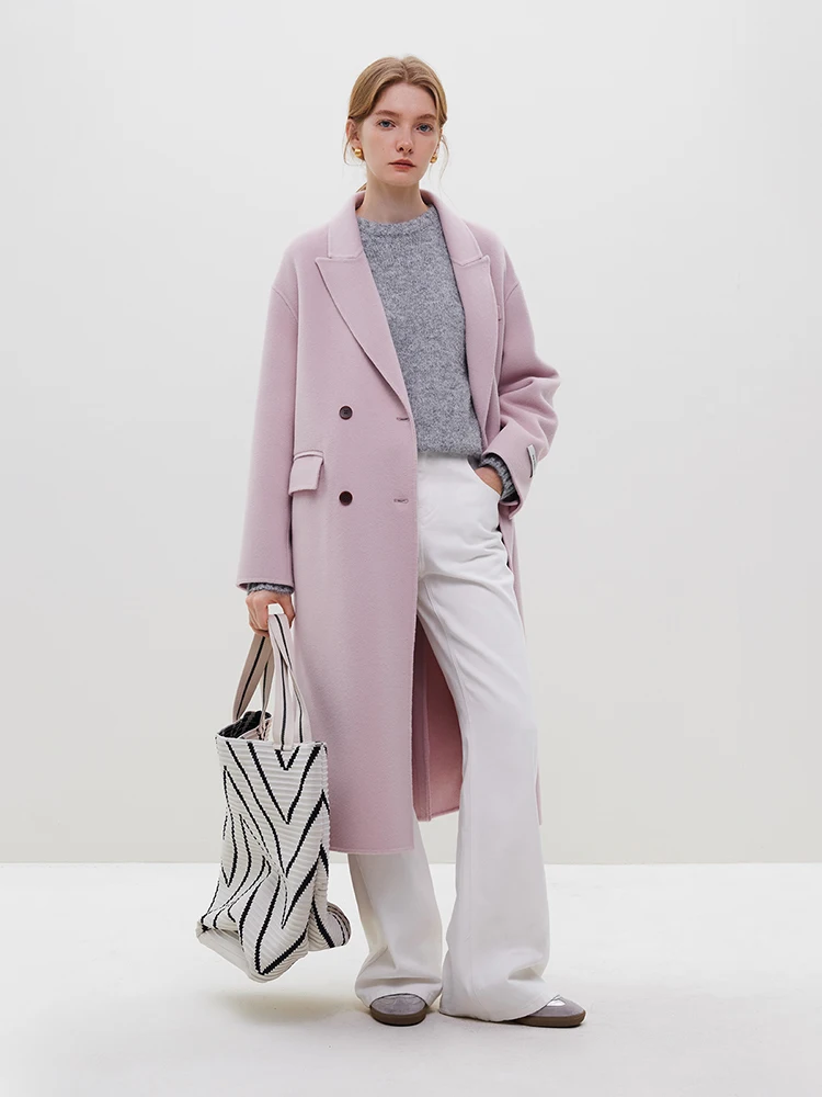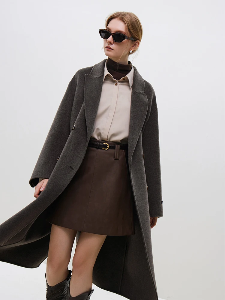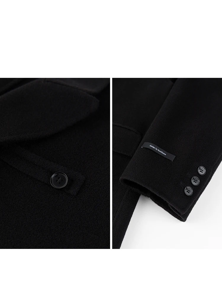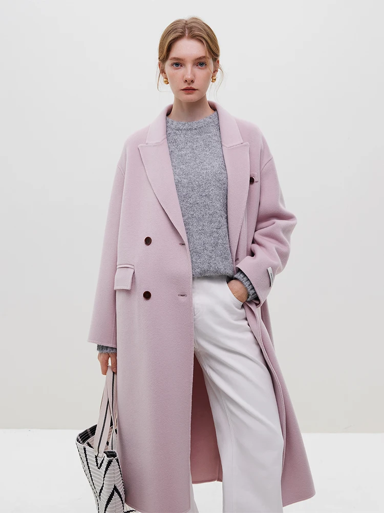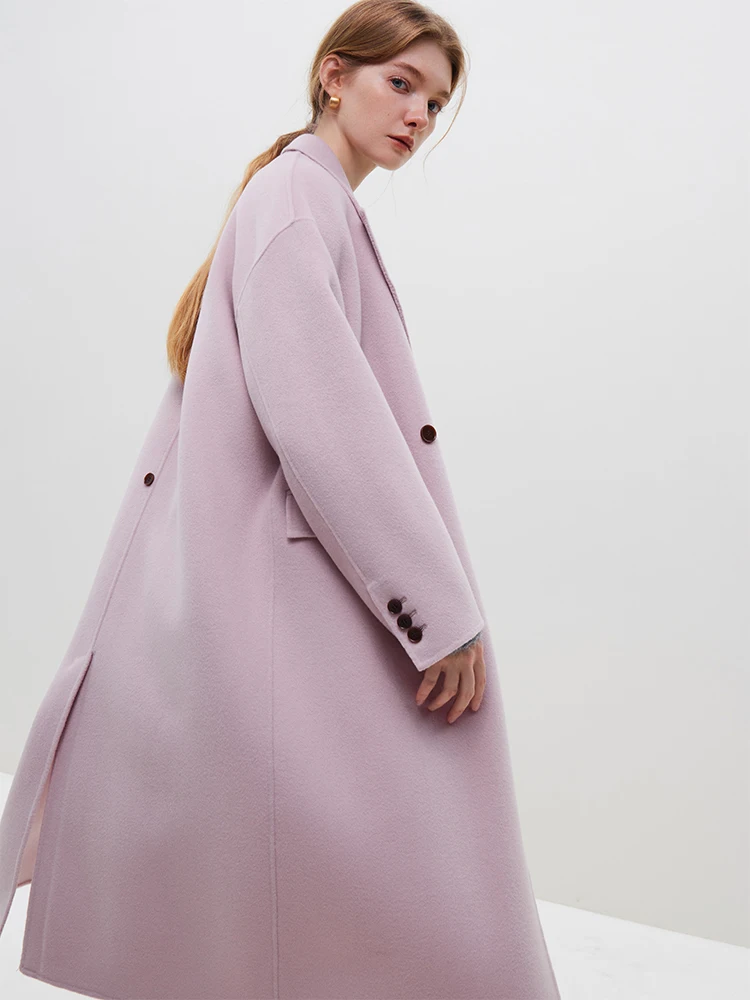 FSLE 95.2% Wool 4.8% Camel Hair Temperament Oatmeal Long Woolen Jackets Notched Collar Double Breasted Button Decoration Coats