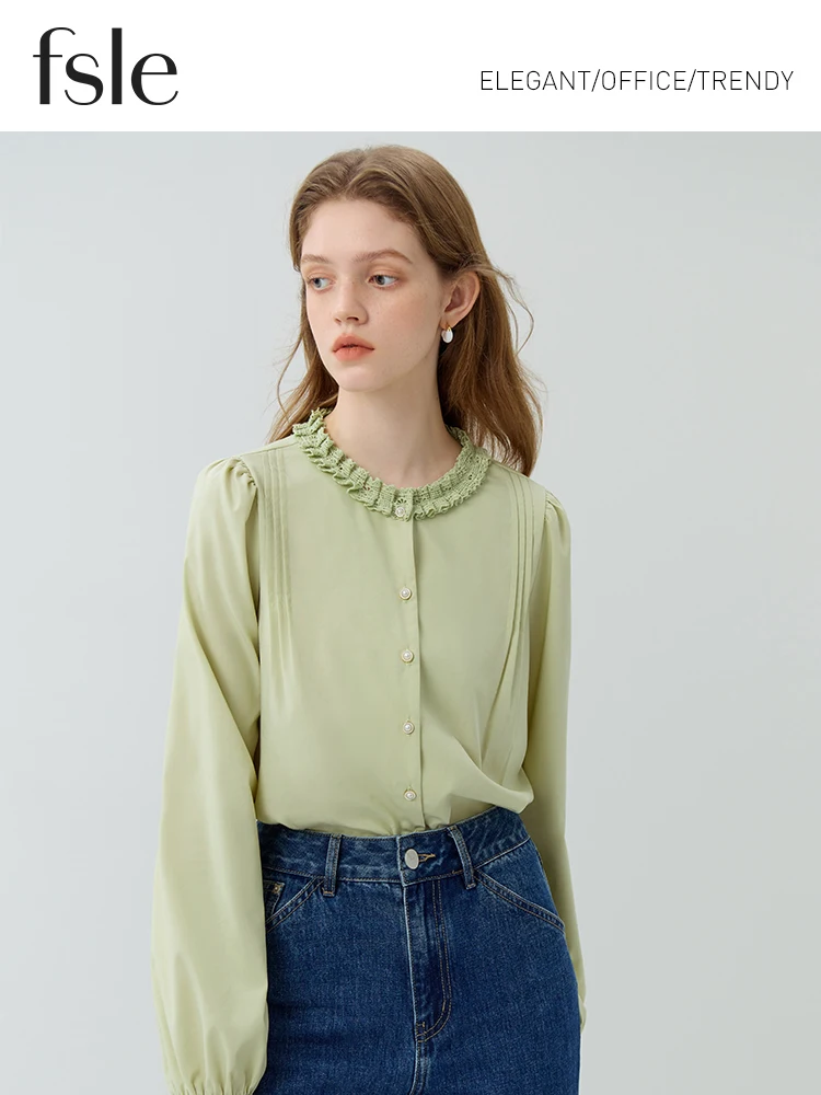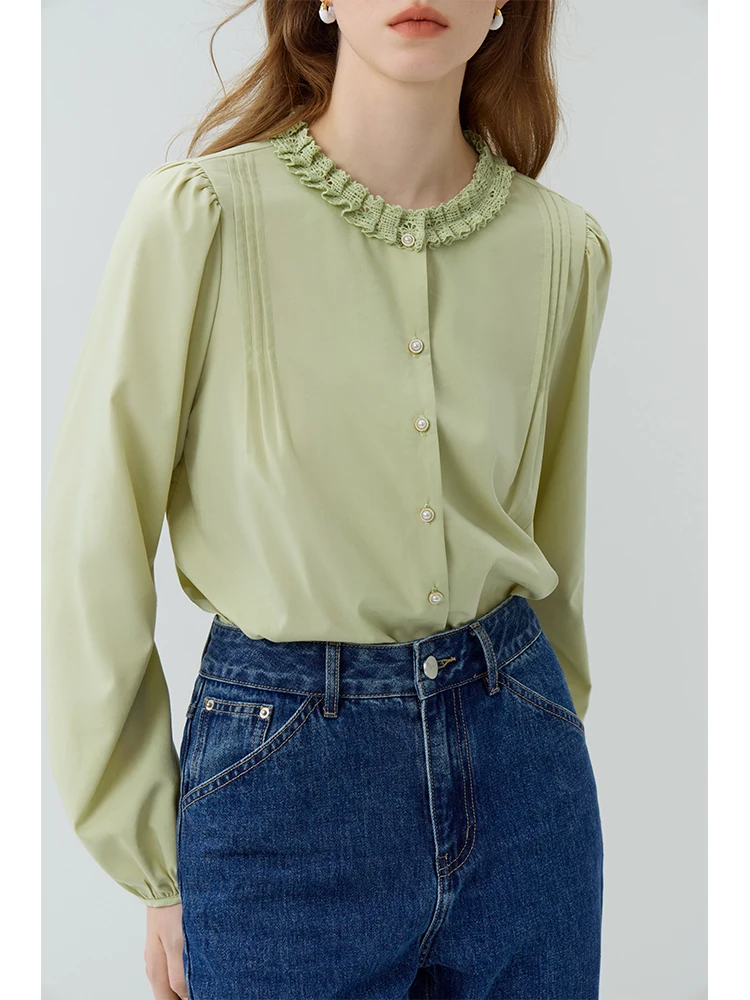 FSLE Pastoral Style Commuter Sense All-match Long-sleeved Shirt for Women 2023 Autumn New Lace Round Neck Top Shirt Female