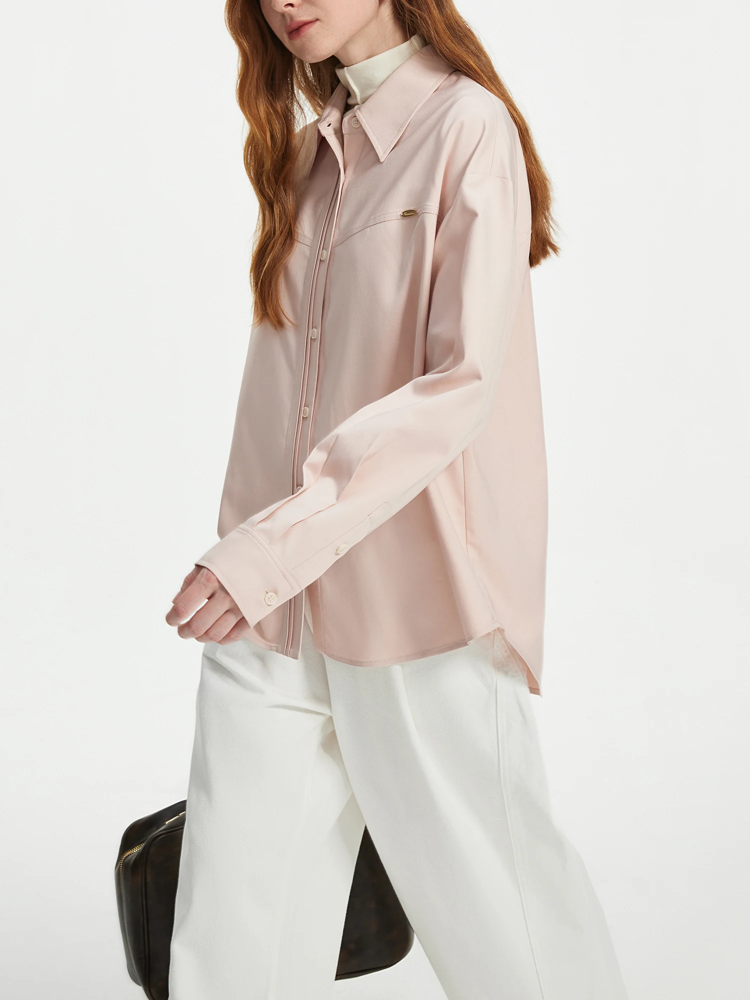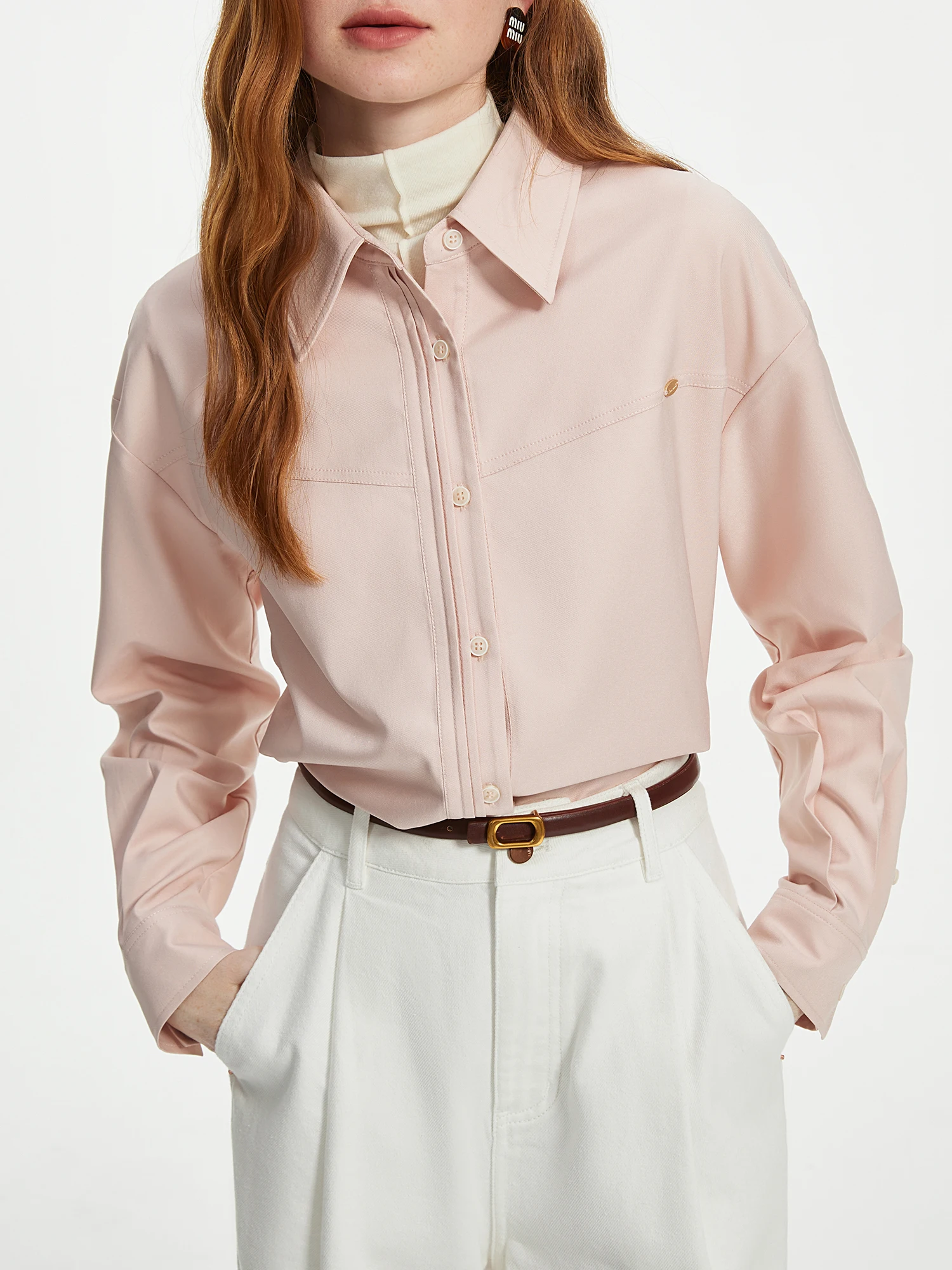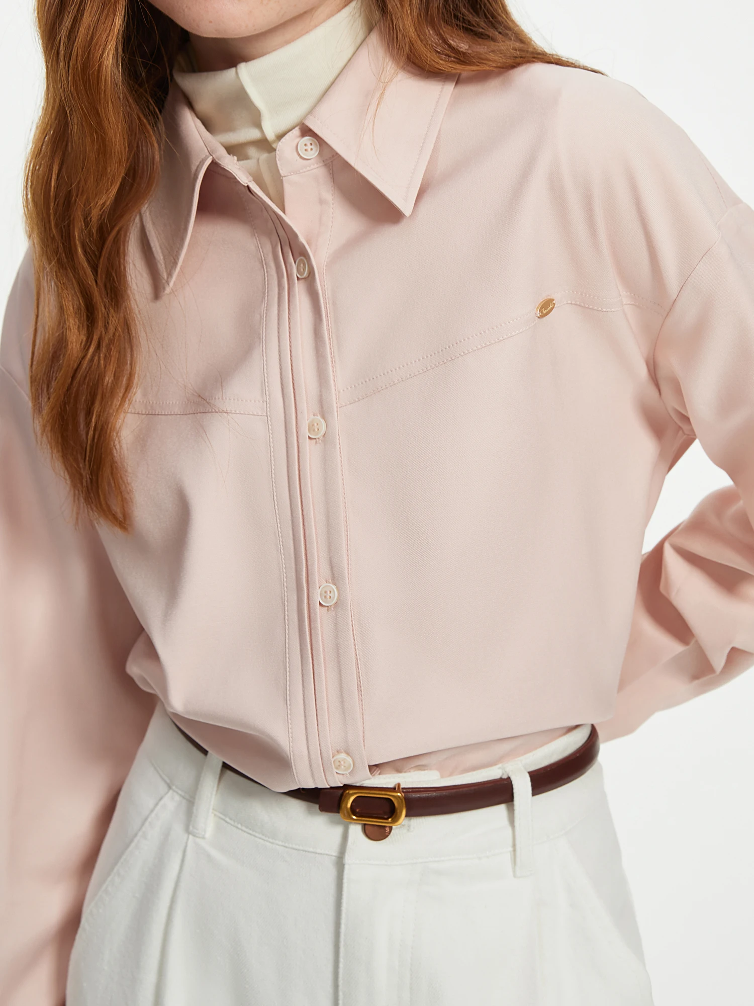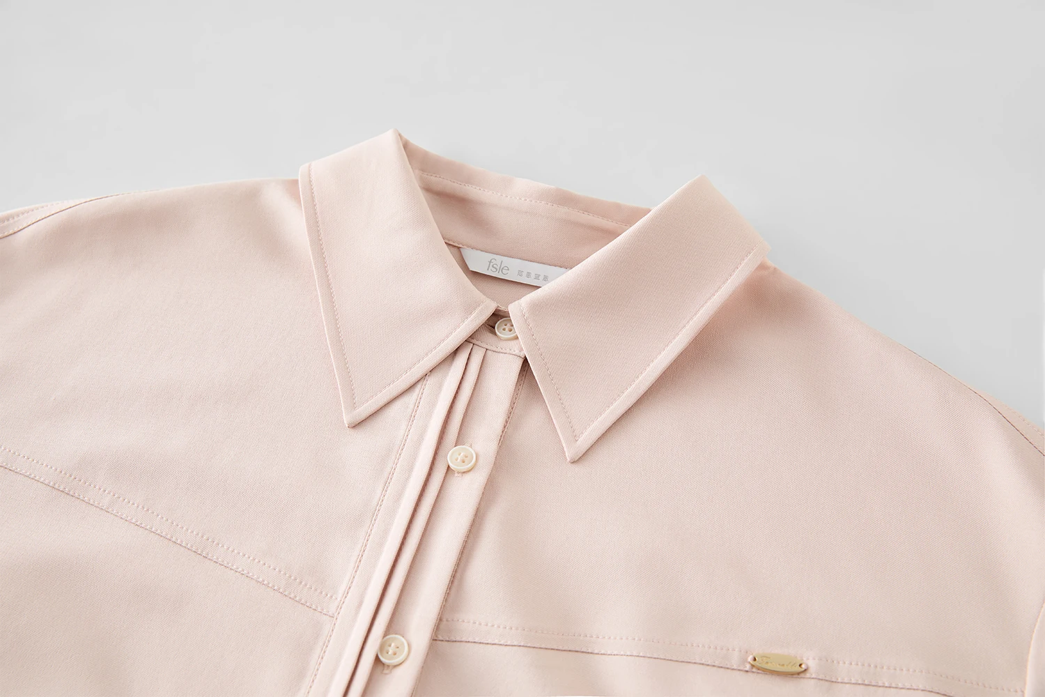 FSLE Women Long Sleeve Blouse 2024 Winter Thick Twill Female Drop Sleeve Shirts Polo Neck Pink Single Breasted Shirt 24FS14417