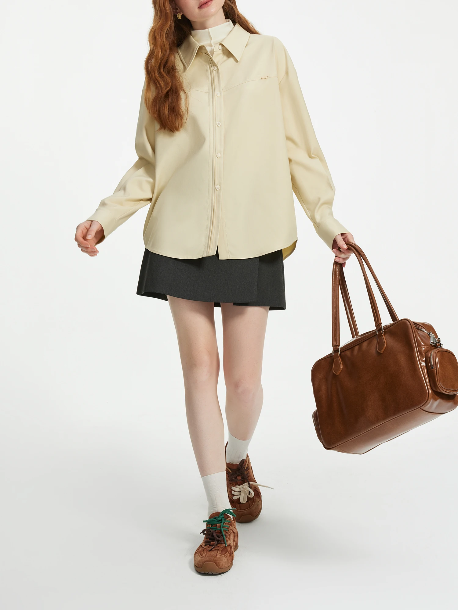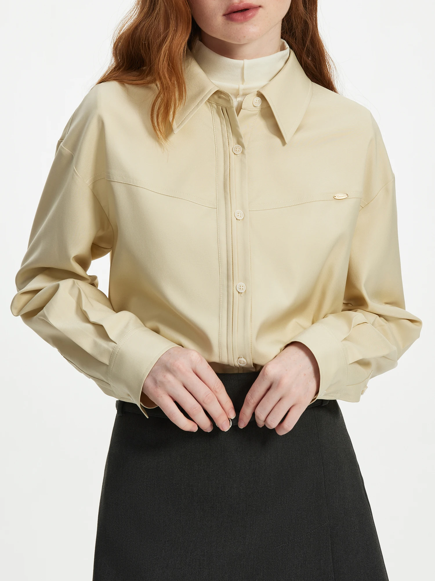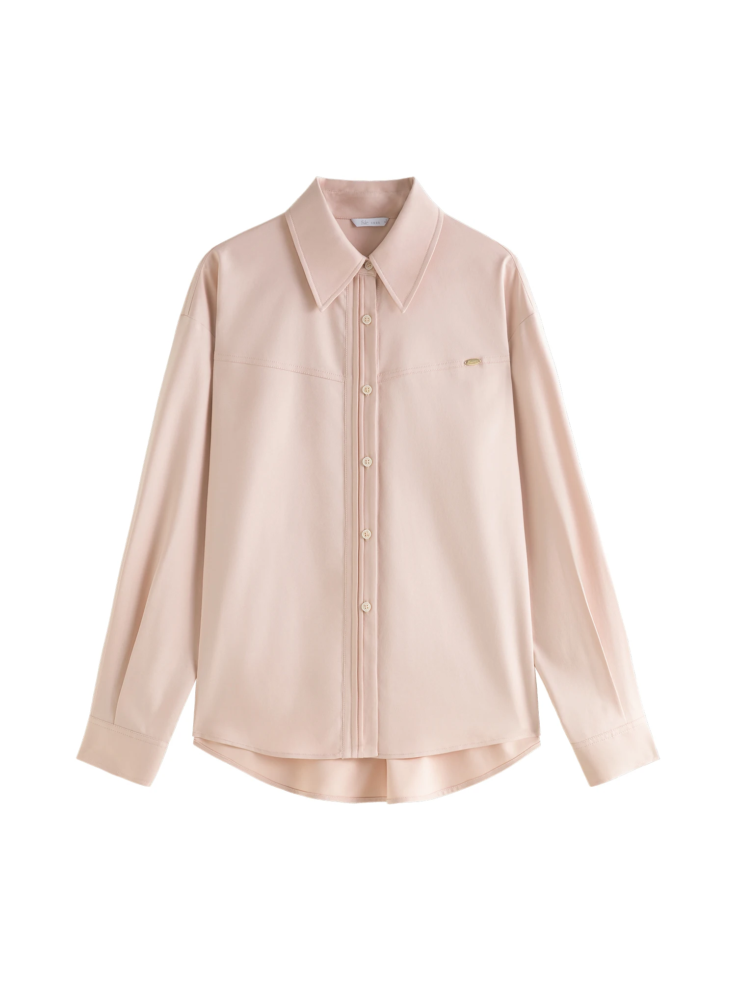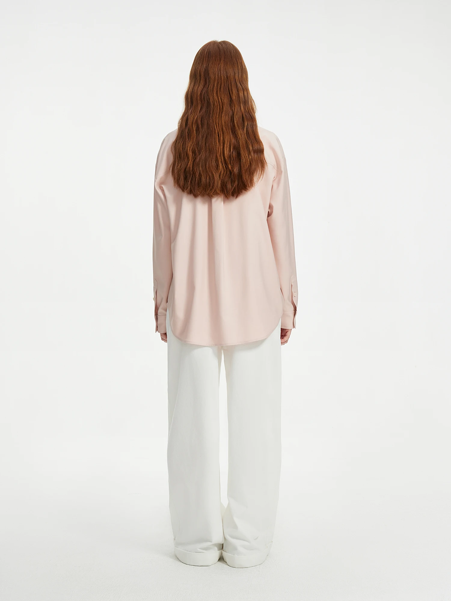 FSLE Women Long Sleeve Blouse 2024 Winter Thick Twill Female Drop Sleeve Shirts Polo Neck Pink Single Breasted Shirt 24FS14417