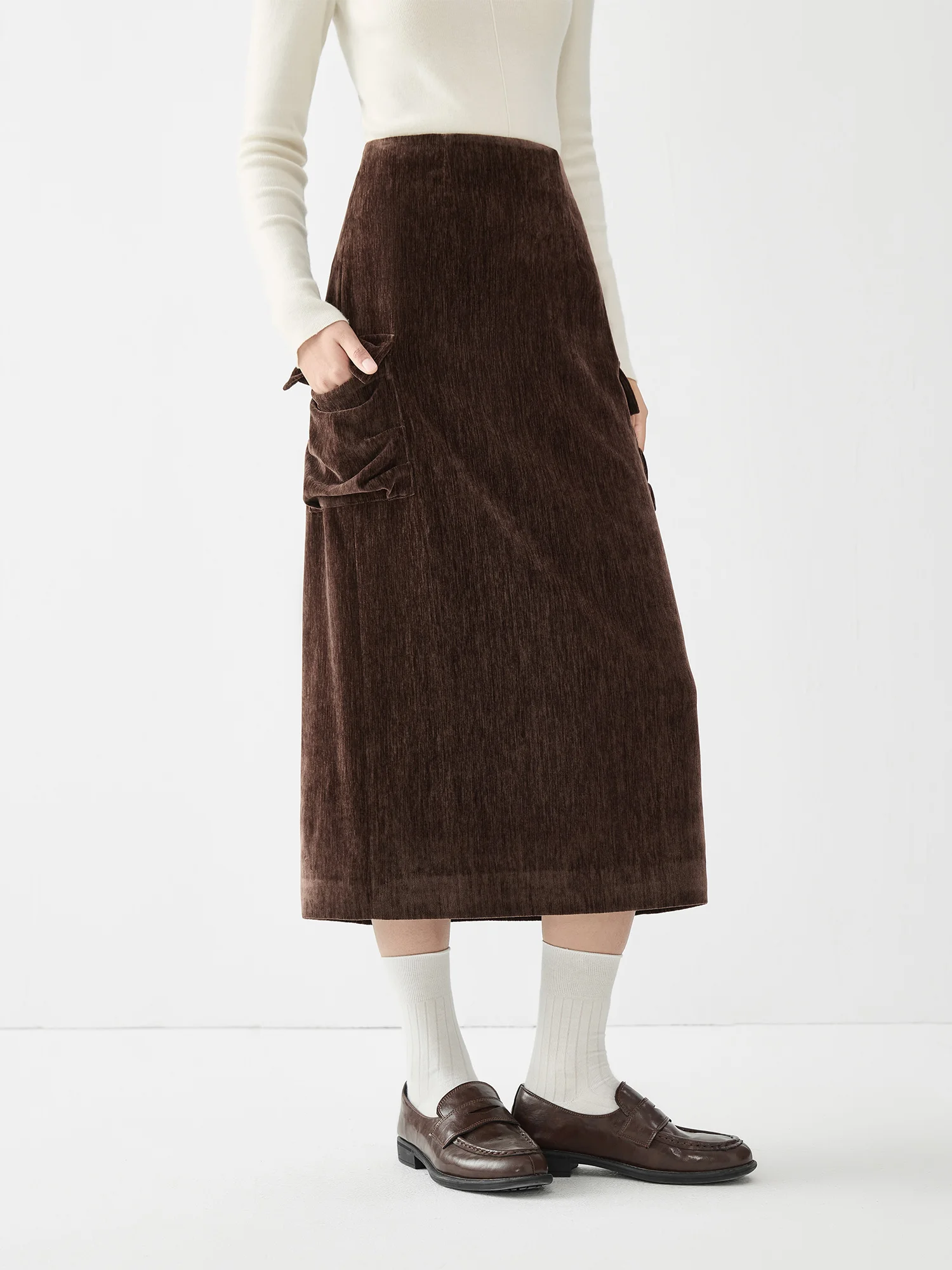 FSLE Women Winter Velvet Long Brown Skirts Casual Style Pocket Decoration Female A-LINE Skirt Back Zipper Women Skirt 24FS14668
