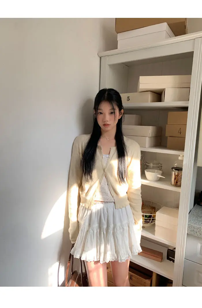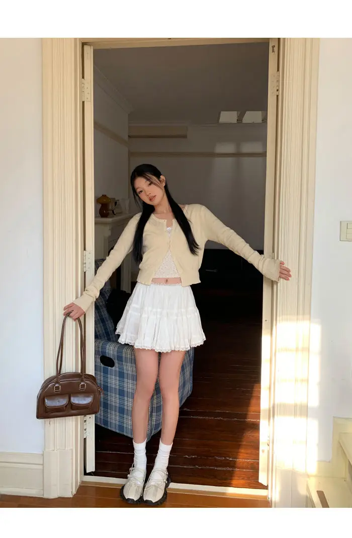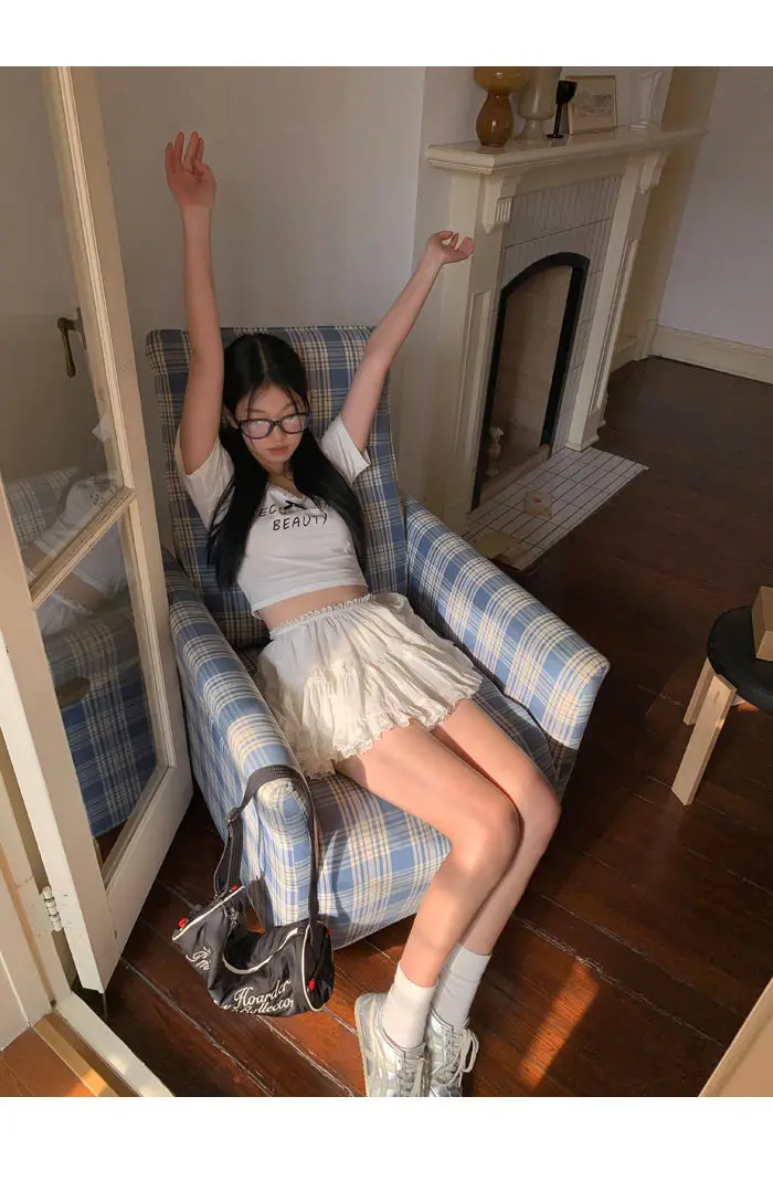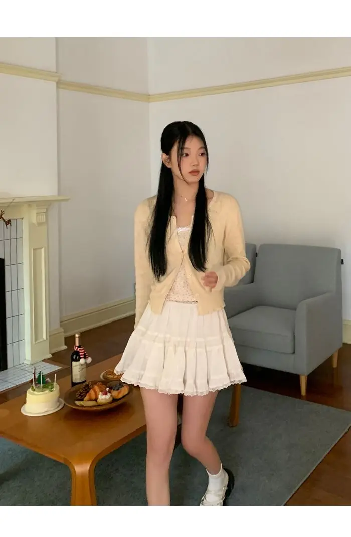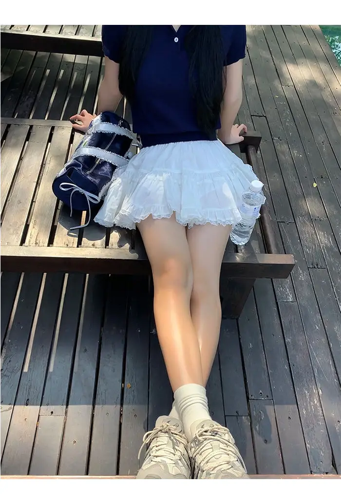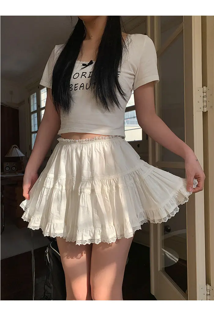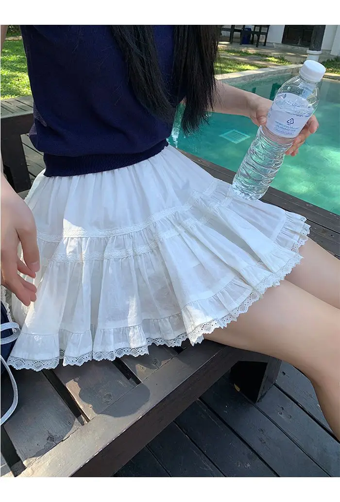 HOUZHOU Coquette White Mini Skirt Women Summer 2024 Lace Patchwork Kawaii Korean High Waist A-line Ruffle Short Skirt Fairycore