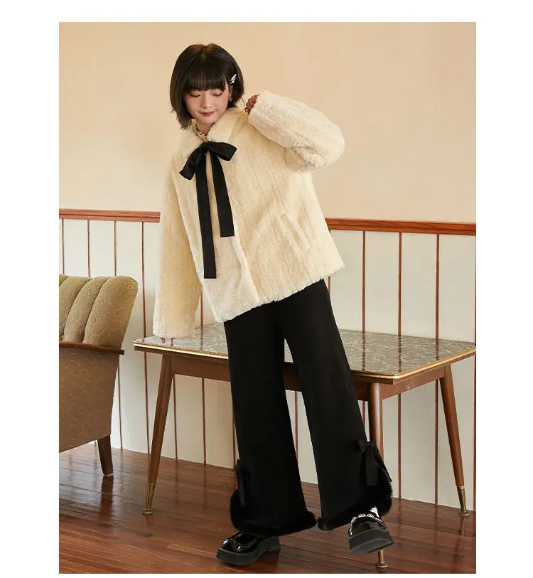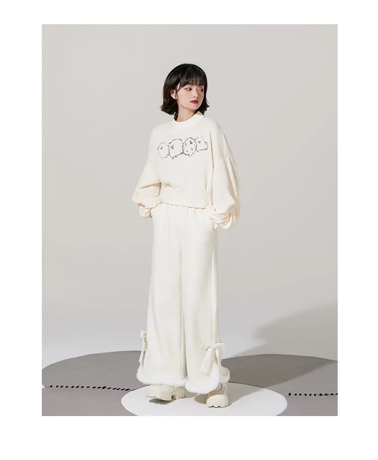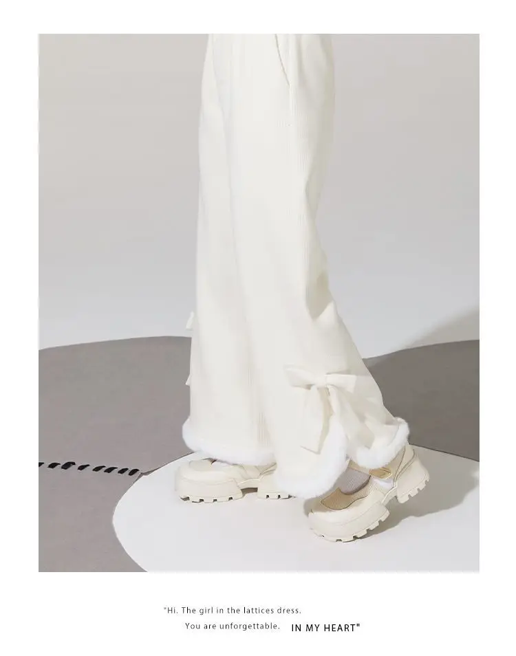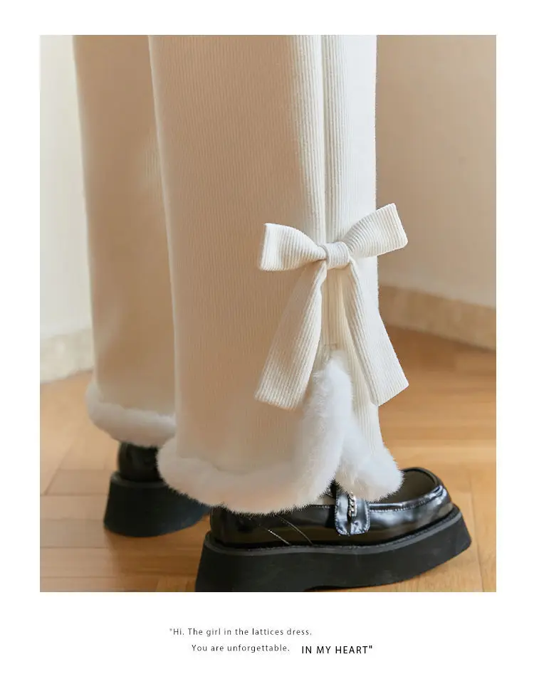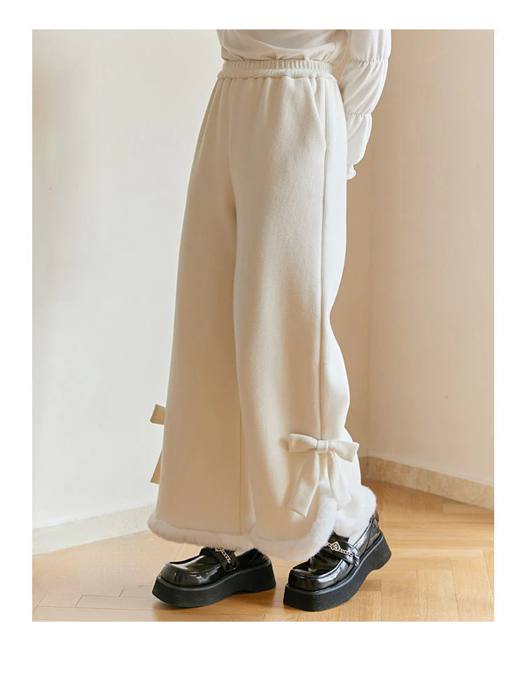 Japanese Kawaii Warm Wool Pants Women Korean Style Sweet Wide-legged Pants Female Bow Loose Casual Elegant Cute Pants Winter New