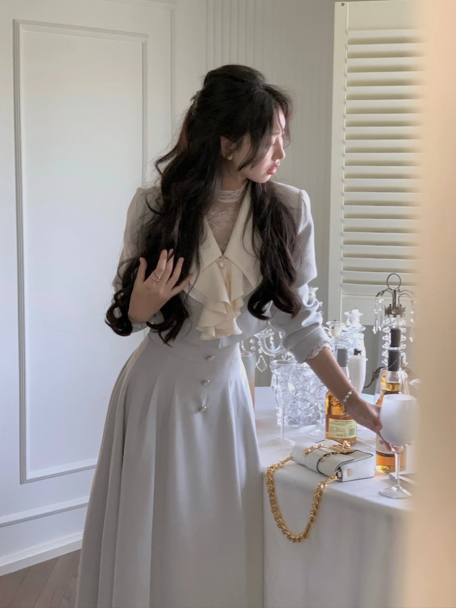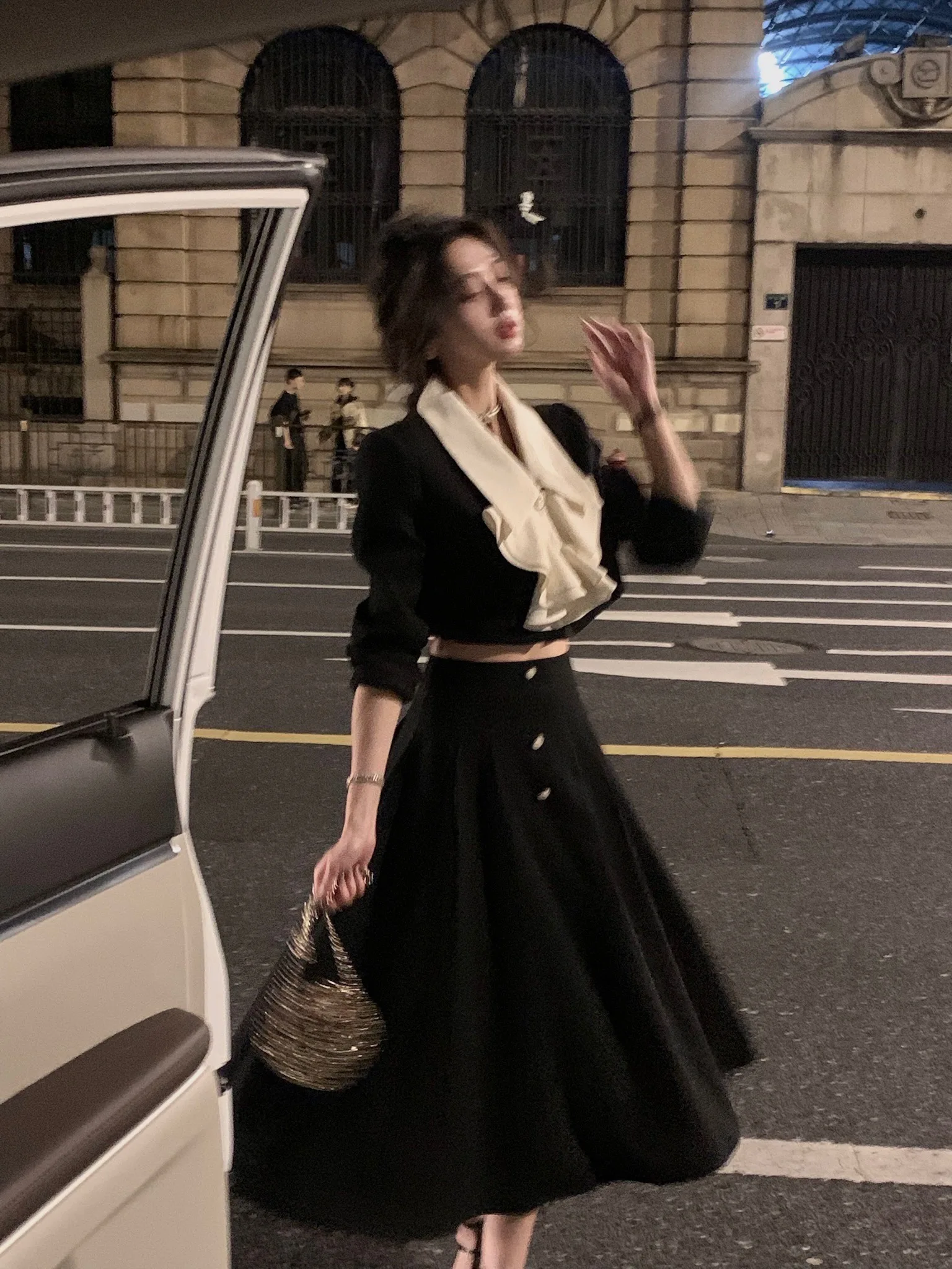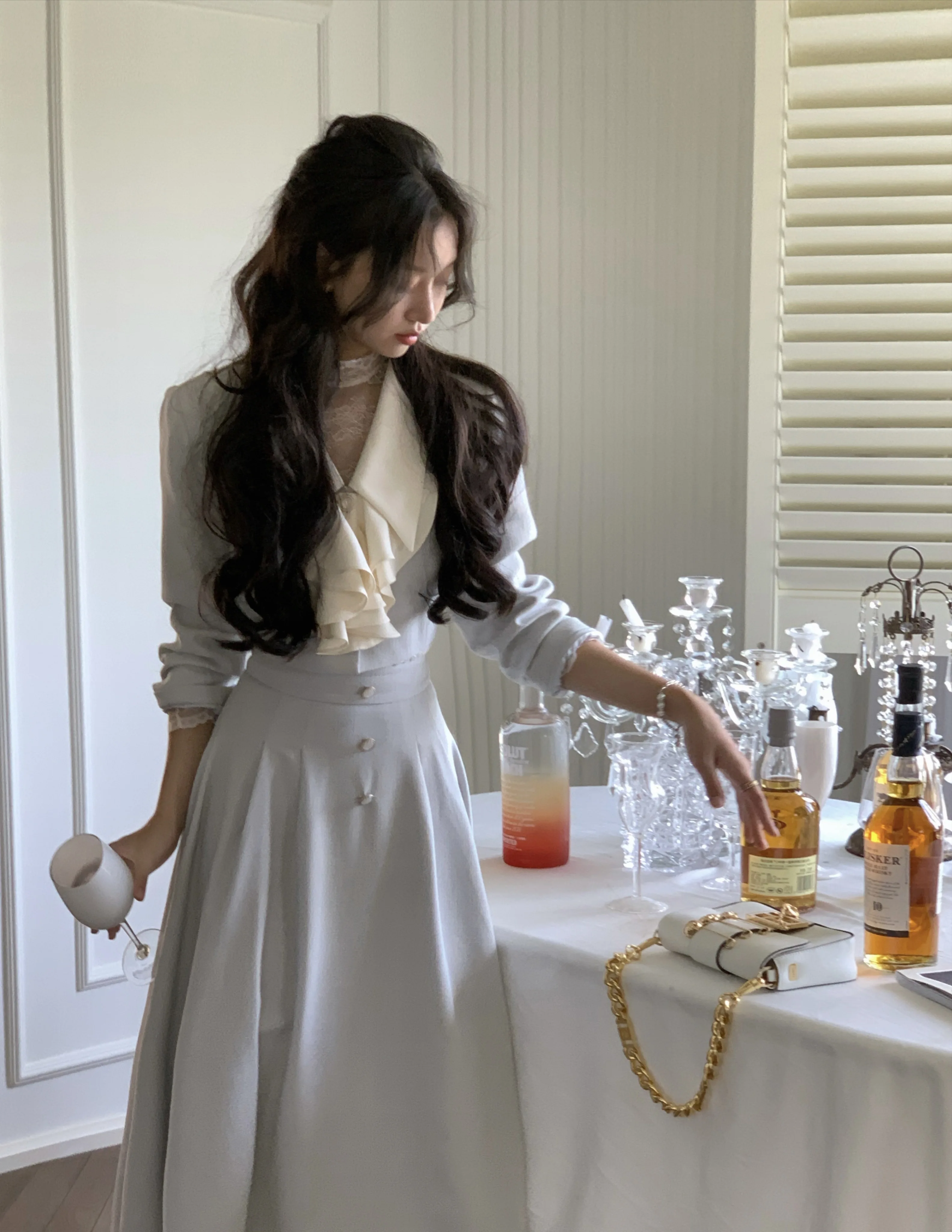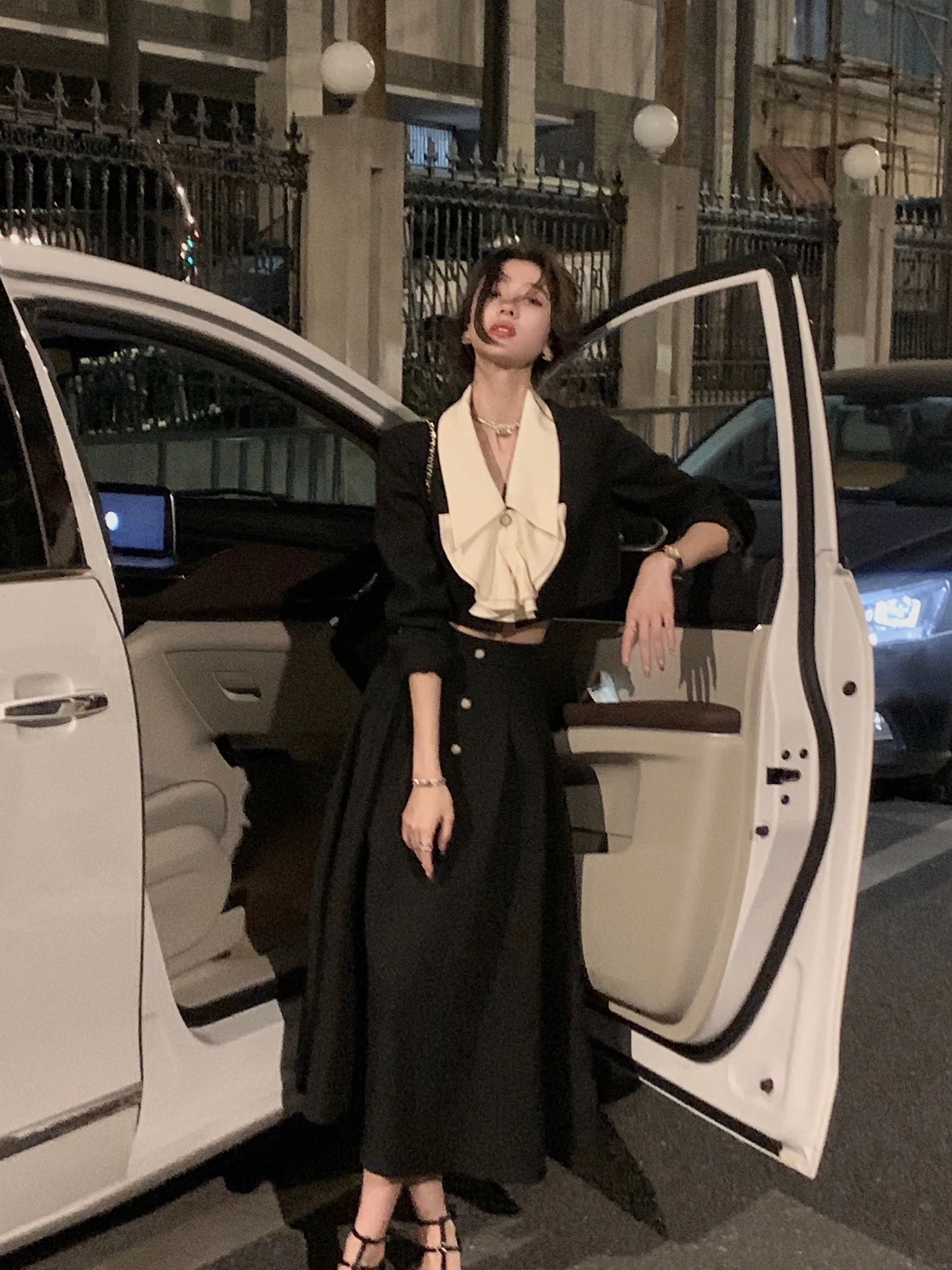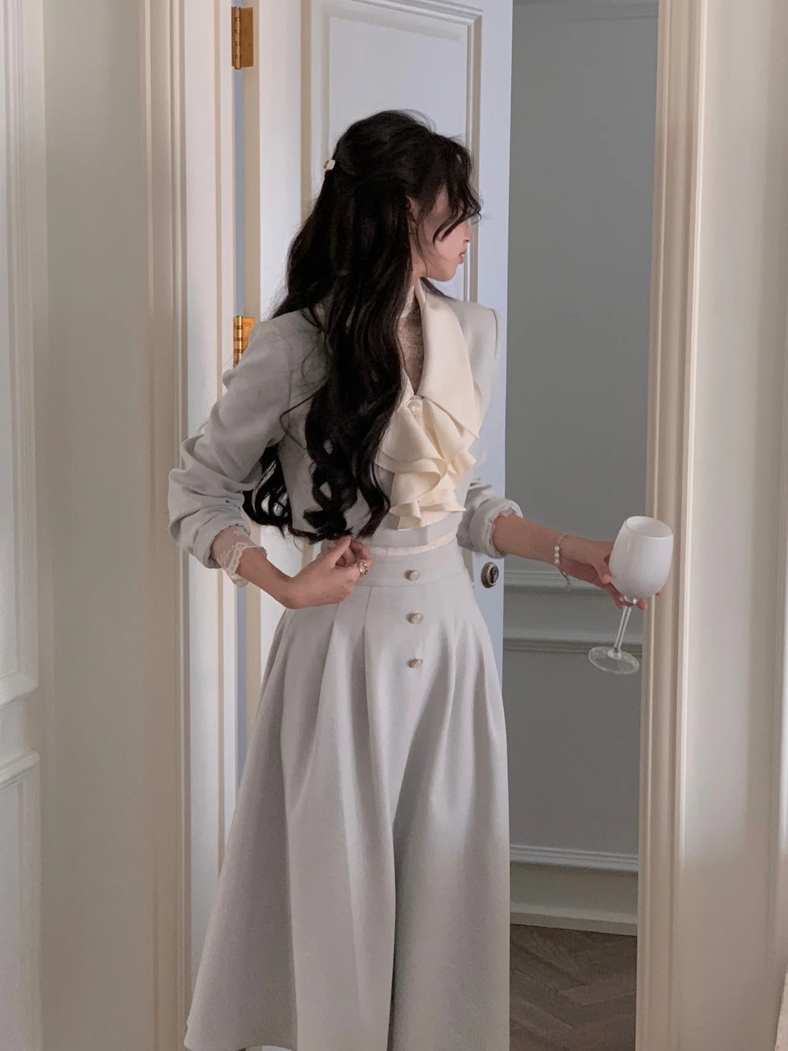 Korean Skirt Suit 2022 Autumn Elegant 2 Piece Set Office Lady Long Sleeve Short Coat + Blue Midi Skirt Outfits Woman Slim Retro