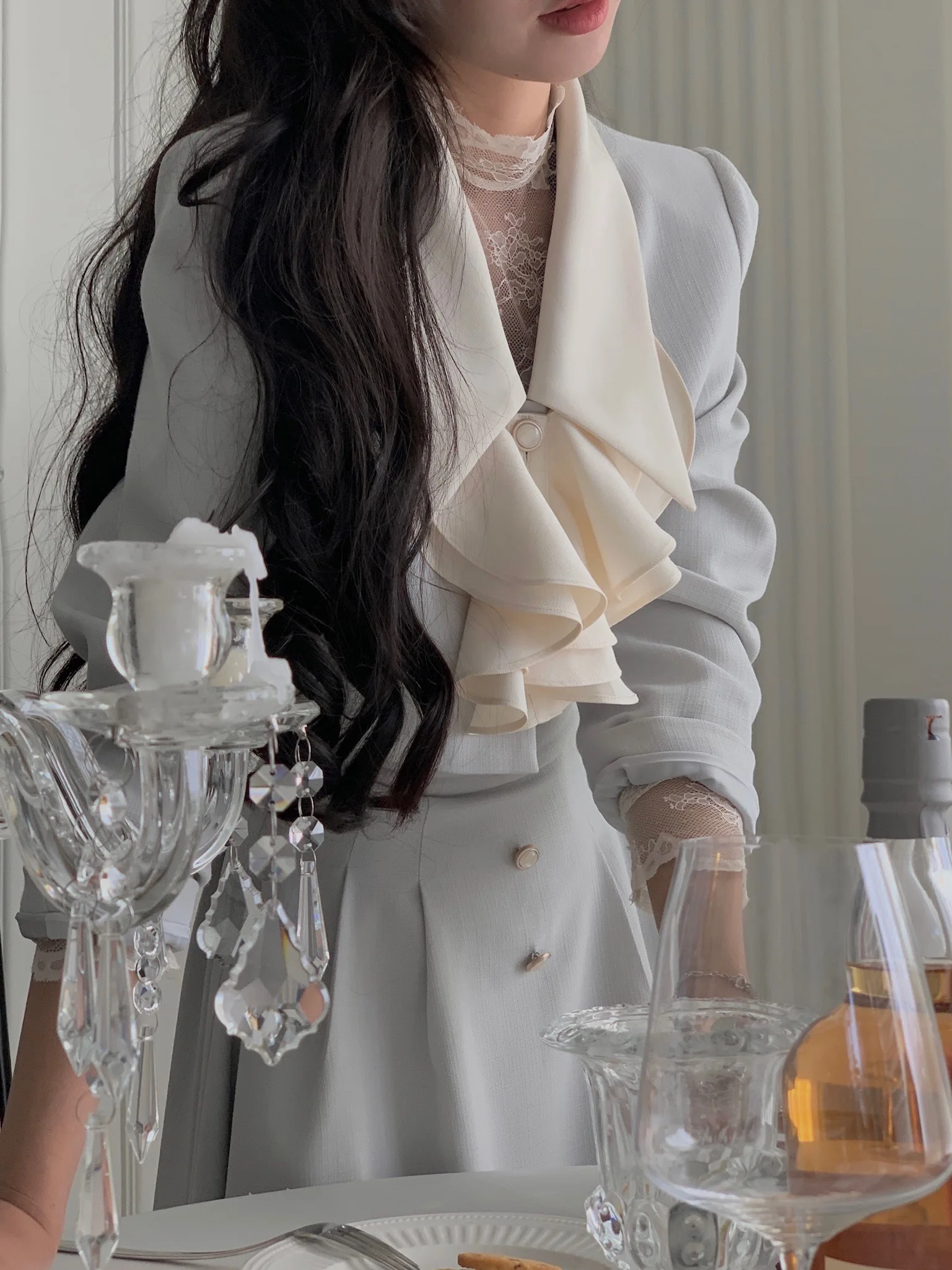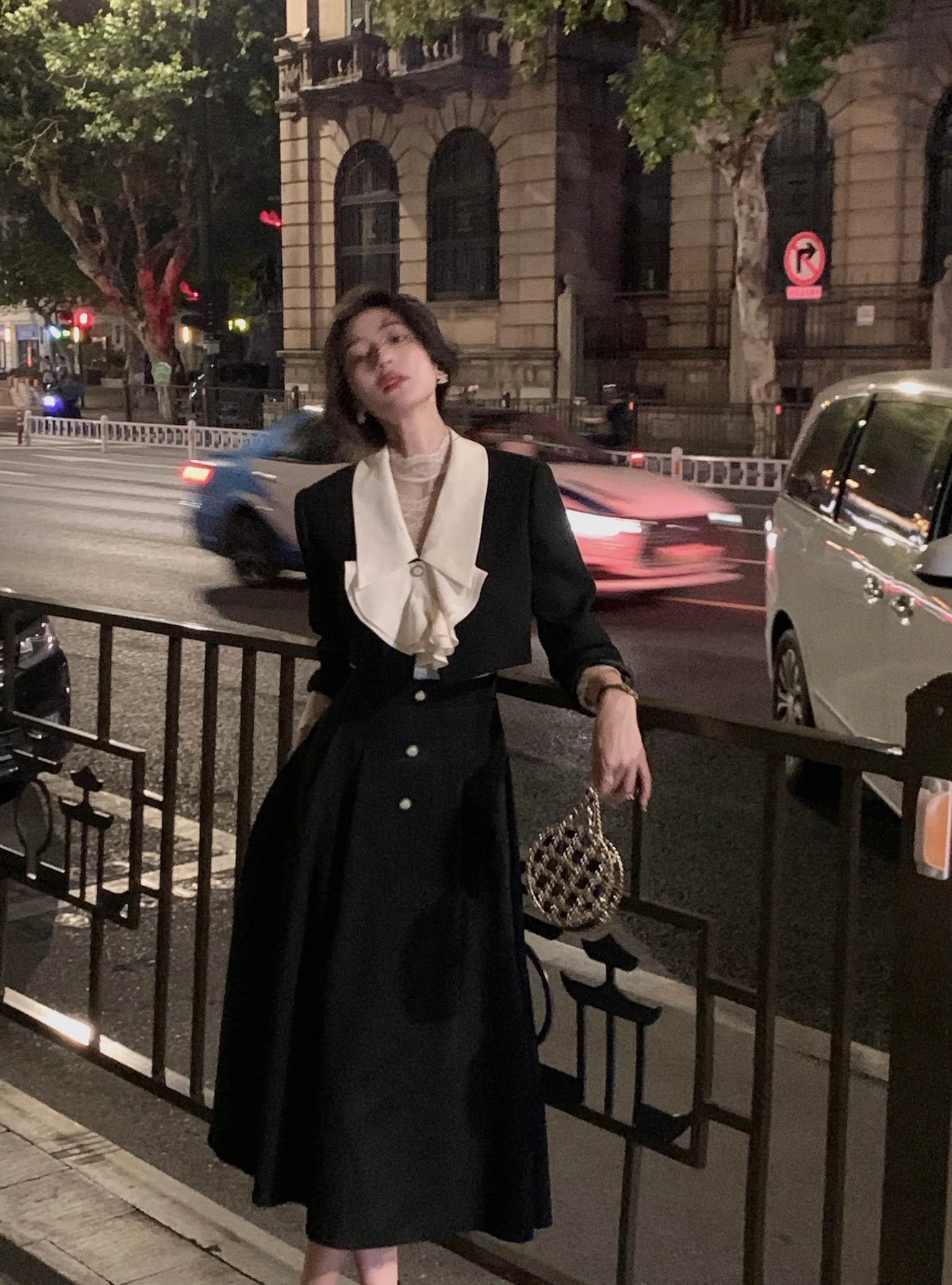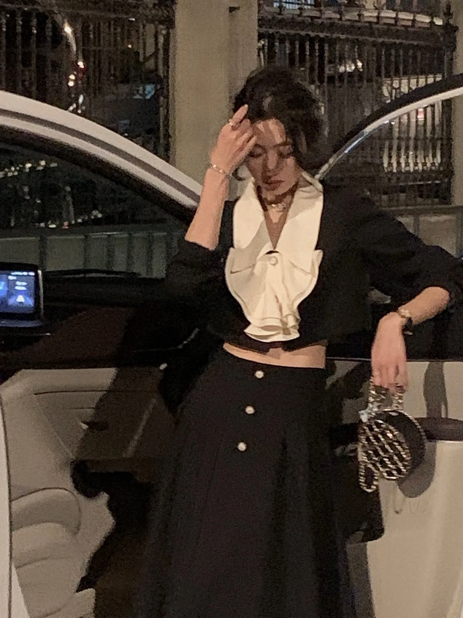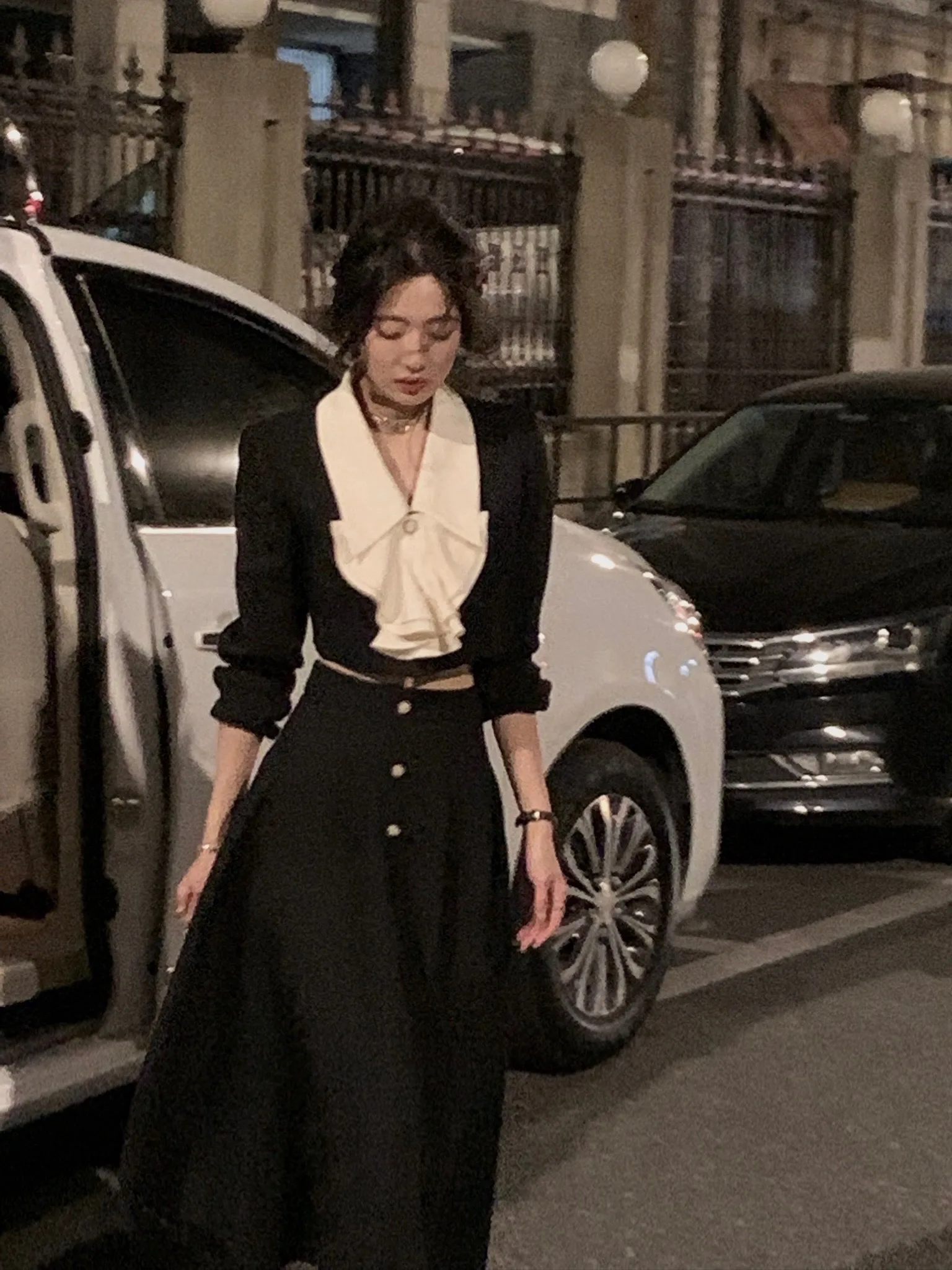 Korean Skirt Suit 2022 Autumn Elegant 2 Piece Set Office Lady Long Sleeve Short Coat + Blue Midi Skirt Outfits Woman Slim Retro