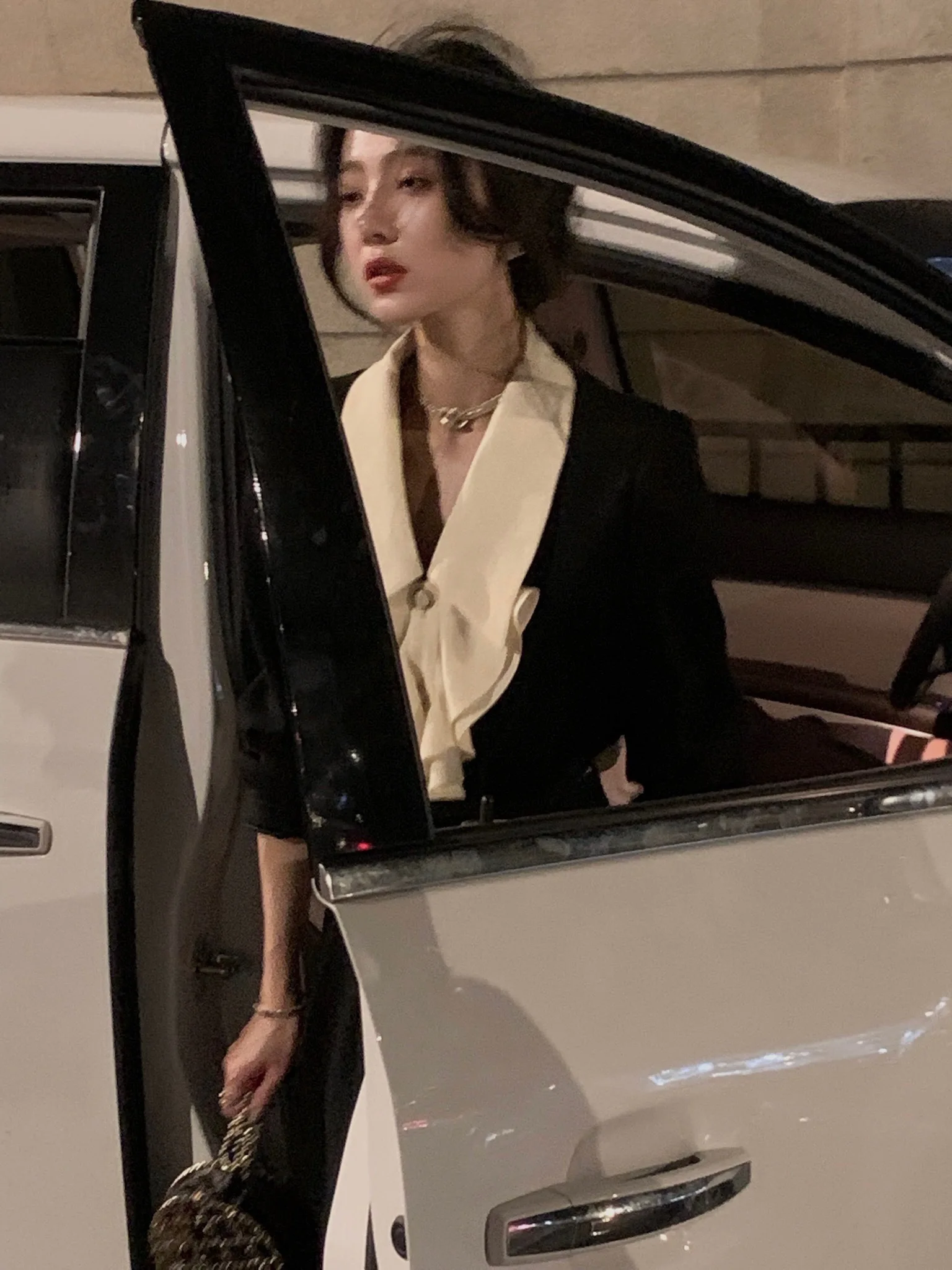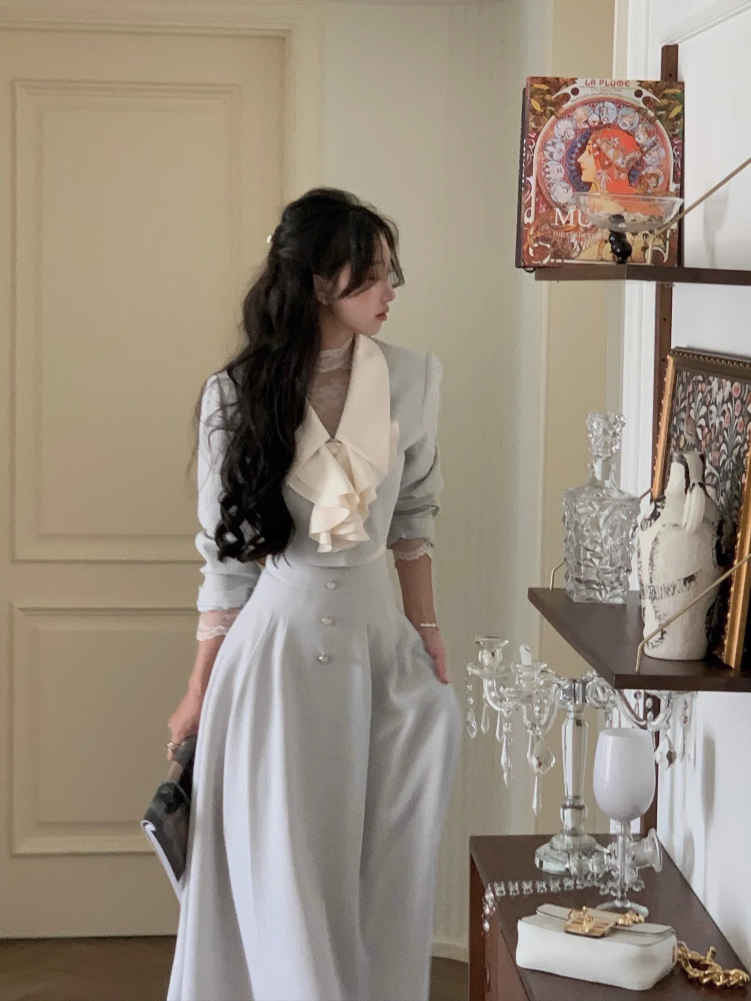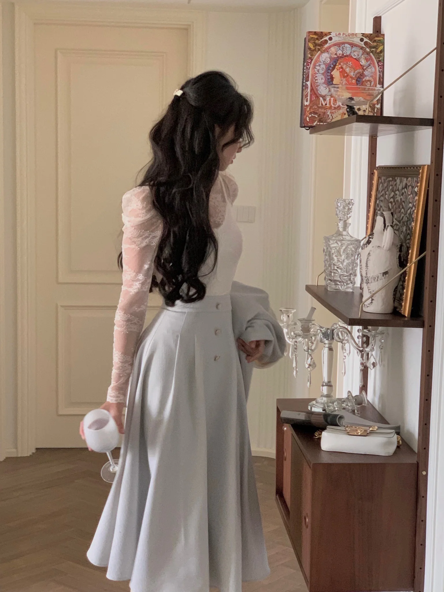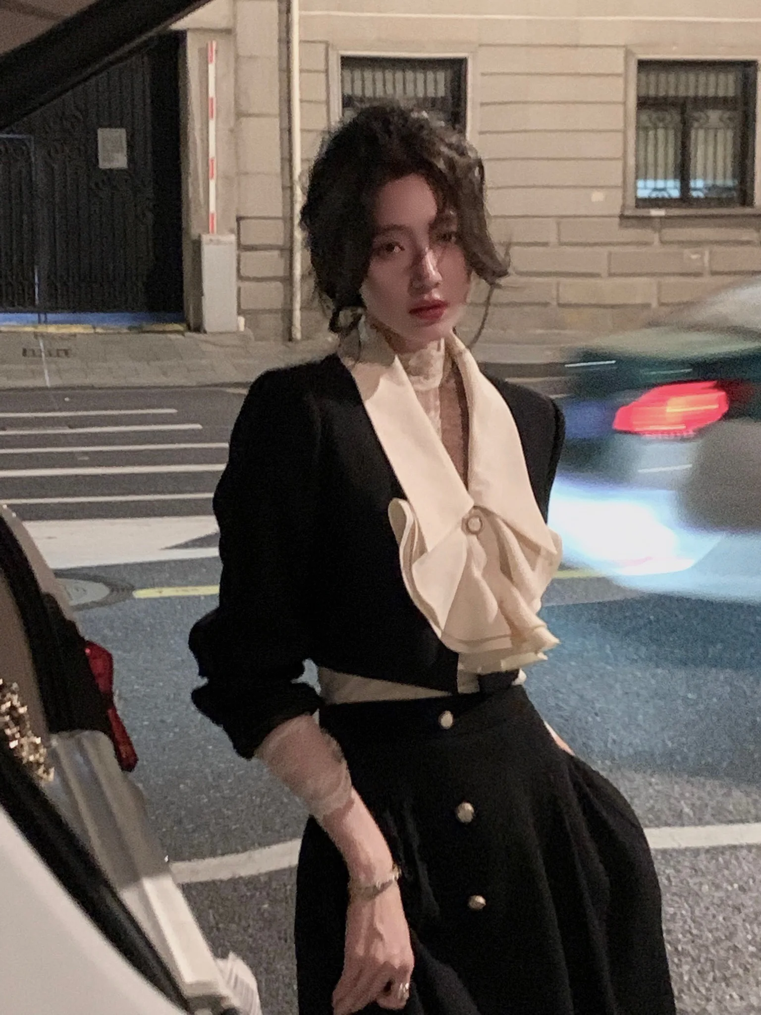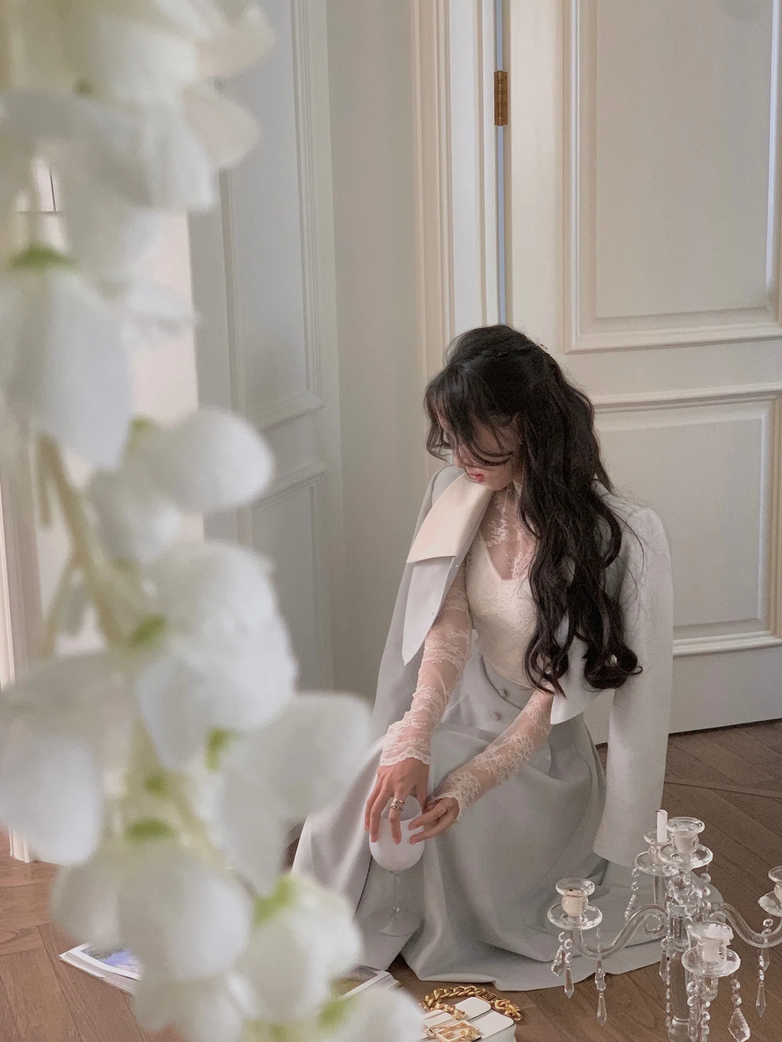Korean Skirt Suit 2022 Autumn Elegant 2 Piece Set Office Lady Long Sleeve Short Coat + Blue Midi Skirt Outfits Woman Slim Retro