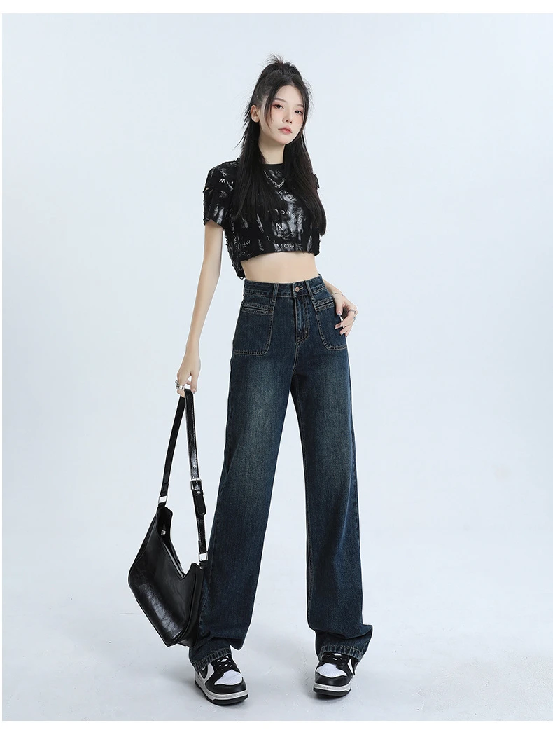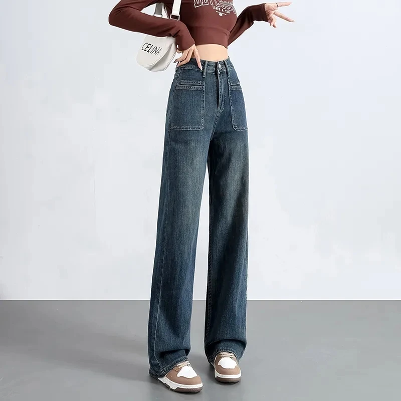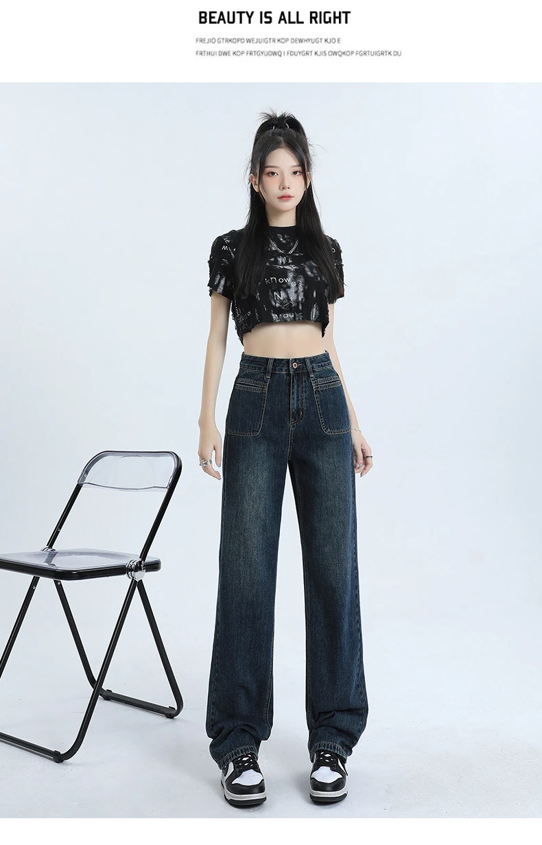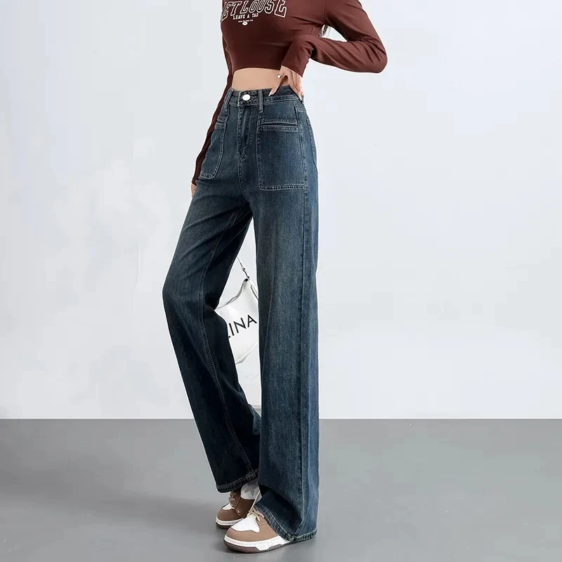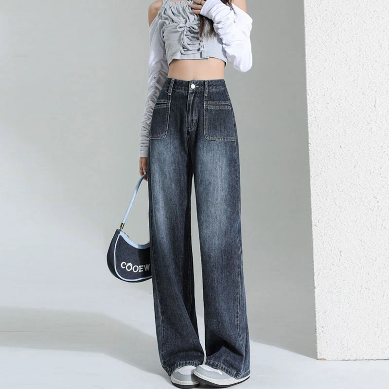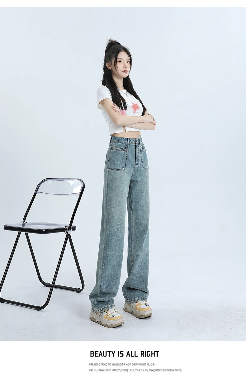 Loose Straight Leg Jeans Women's Front Pocket Design High Waist Floor Female Trousers American Wide Leg Long Pants Classic