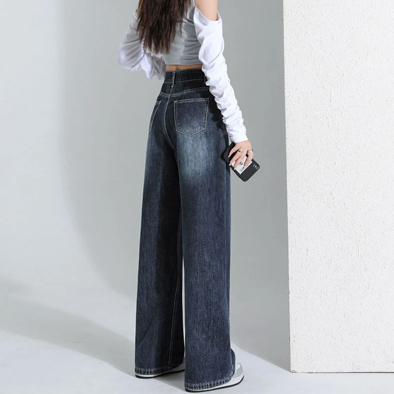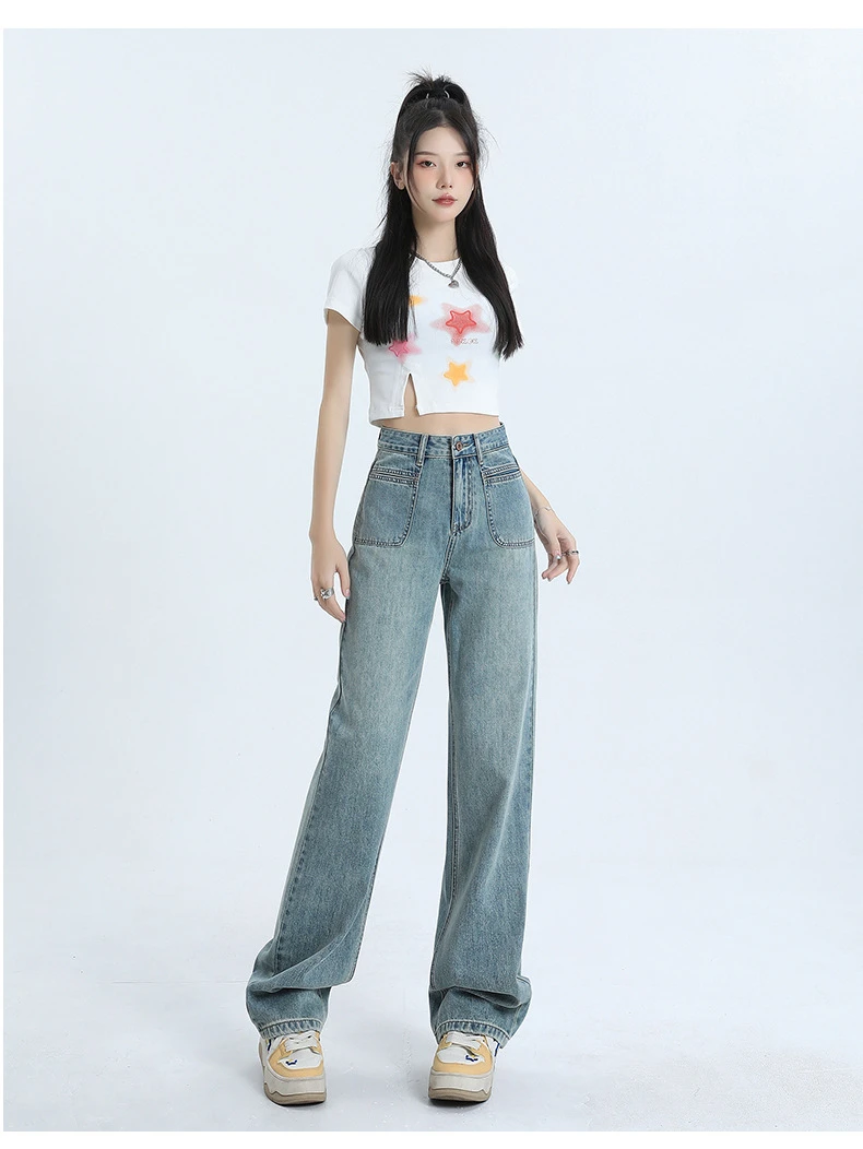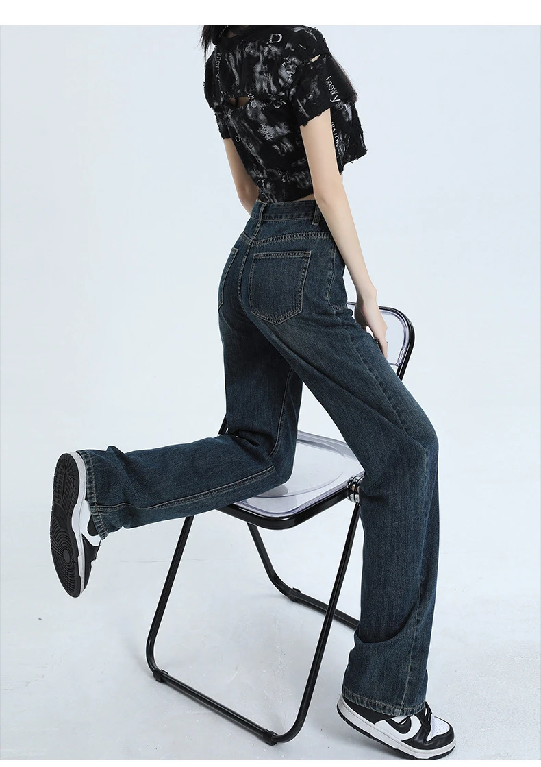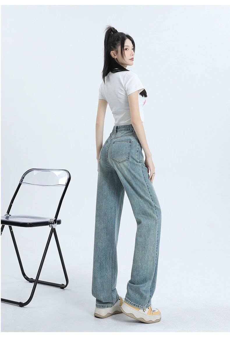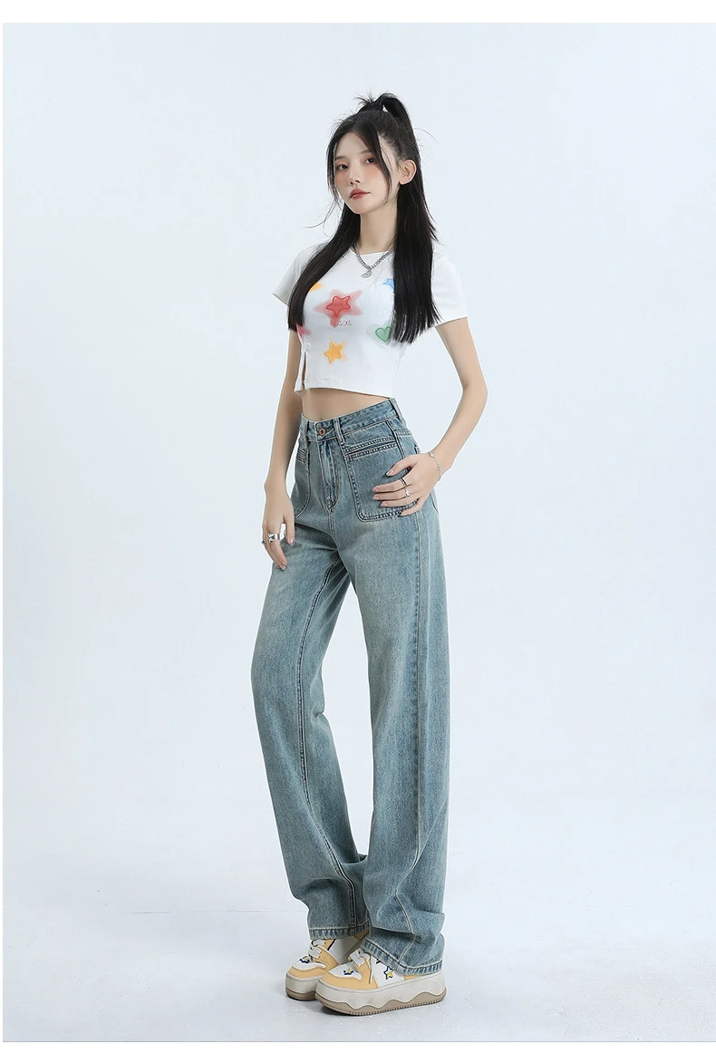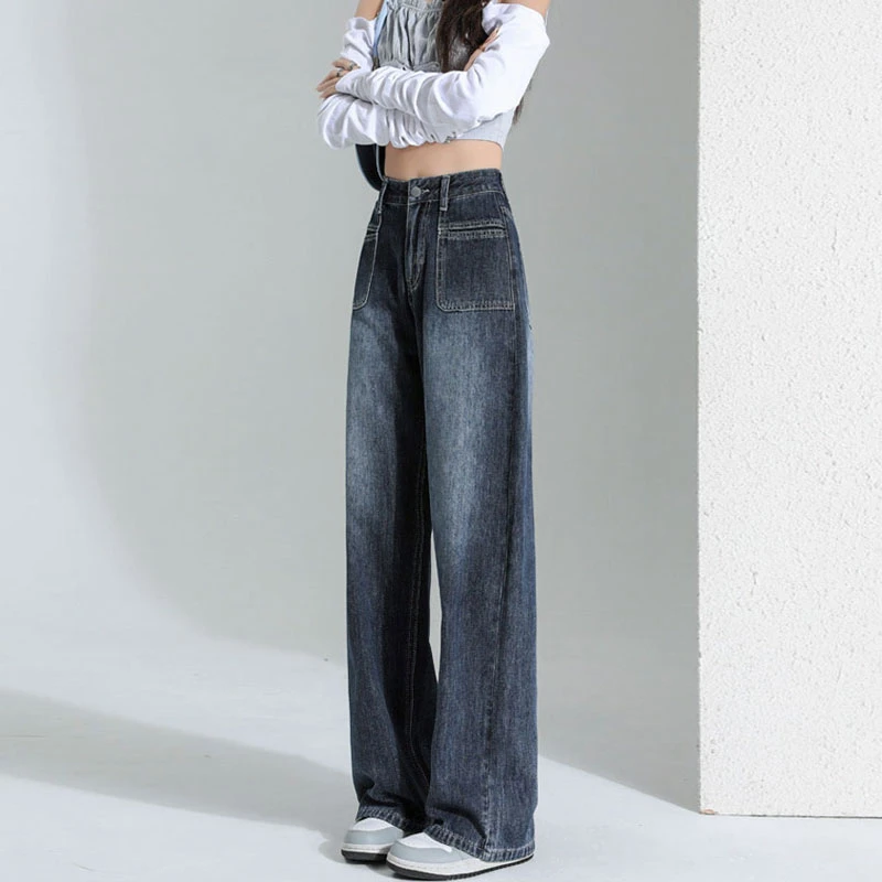 Loose Straight Leg Jeans Women's Front Pocket Design High Waist Floor Female Trousers American Wide Leg Long Pants Classic