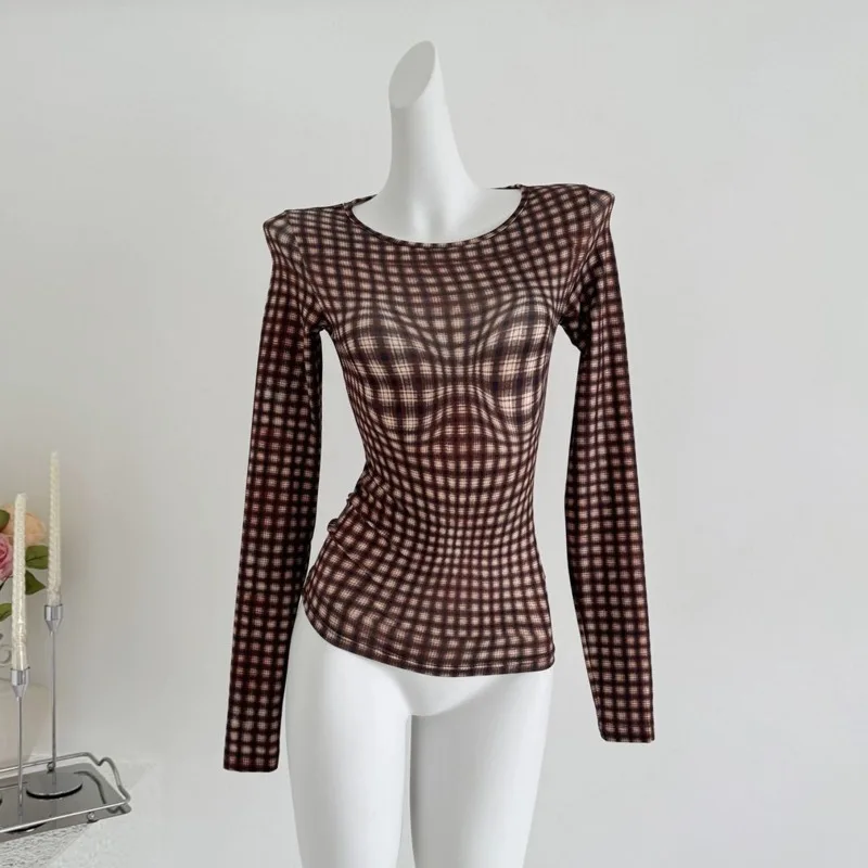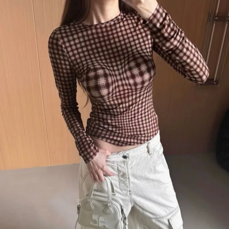 Kpop Plaid Streetwear Long Sleeved Shirts Women Round Neck Punk Style Slim T-shirts Brown Sexy Crop Tops Y2K Grunge Shirts For Women