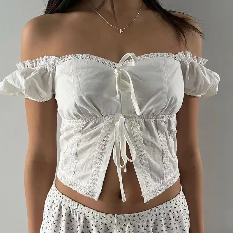 Kpop QWEEK Lace Up White Cropped Shirts Woman Corset Off Shouder Blouses Female Short Sleeve Cardigan Summer Korean Fashion Youthful