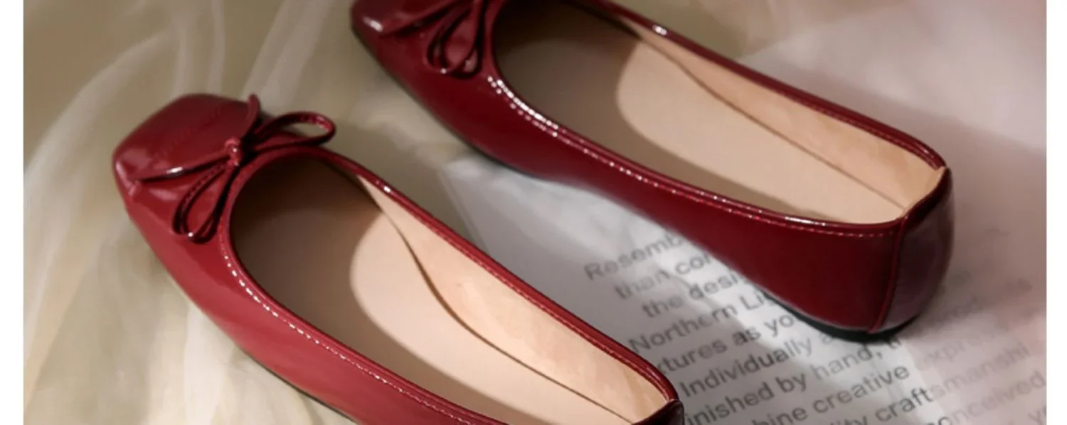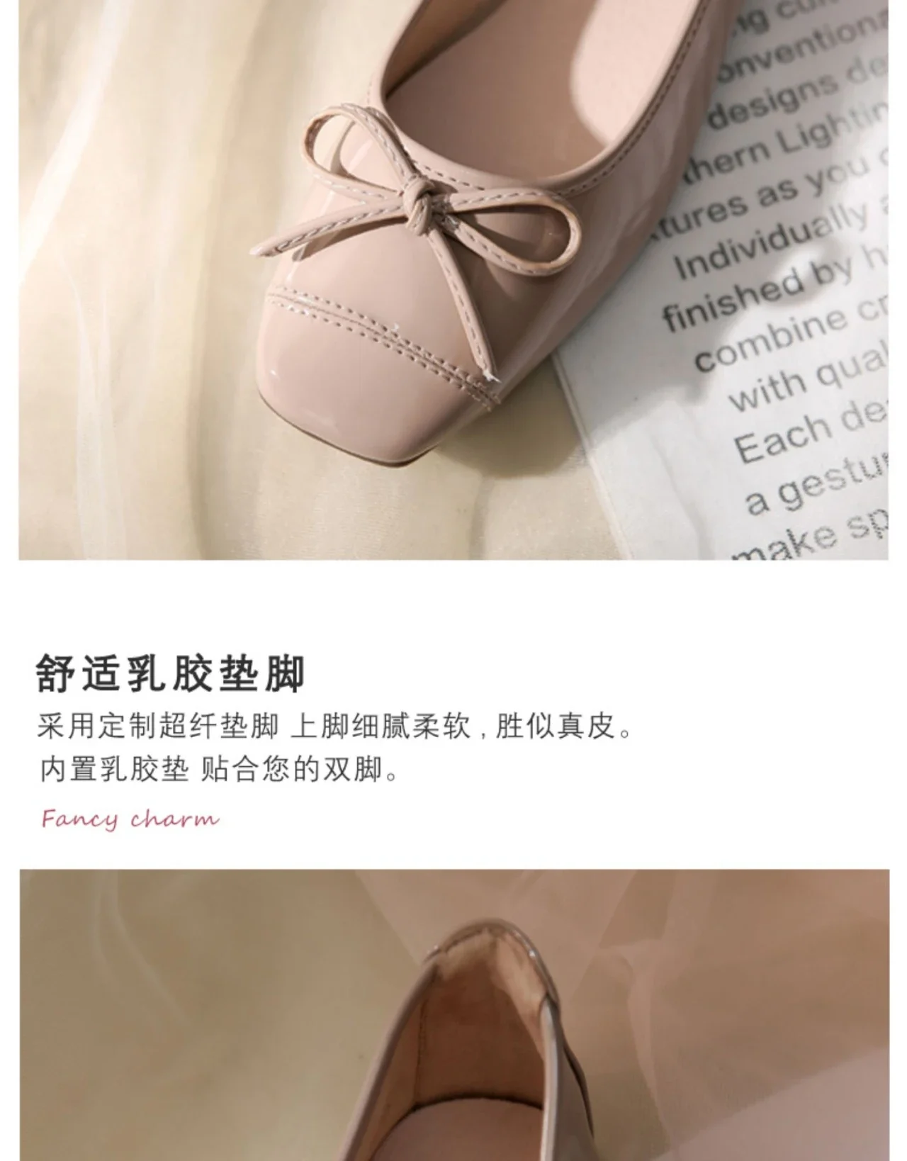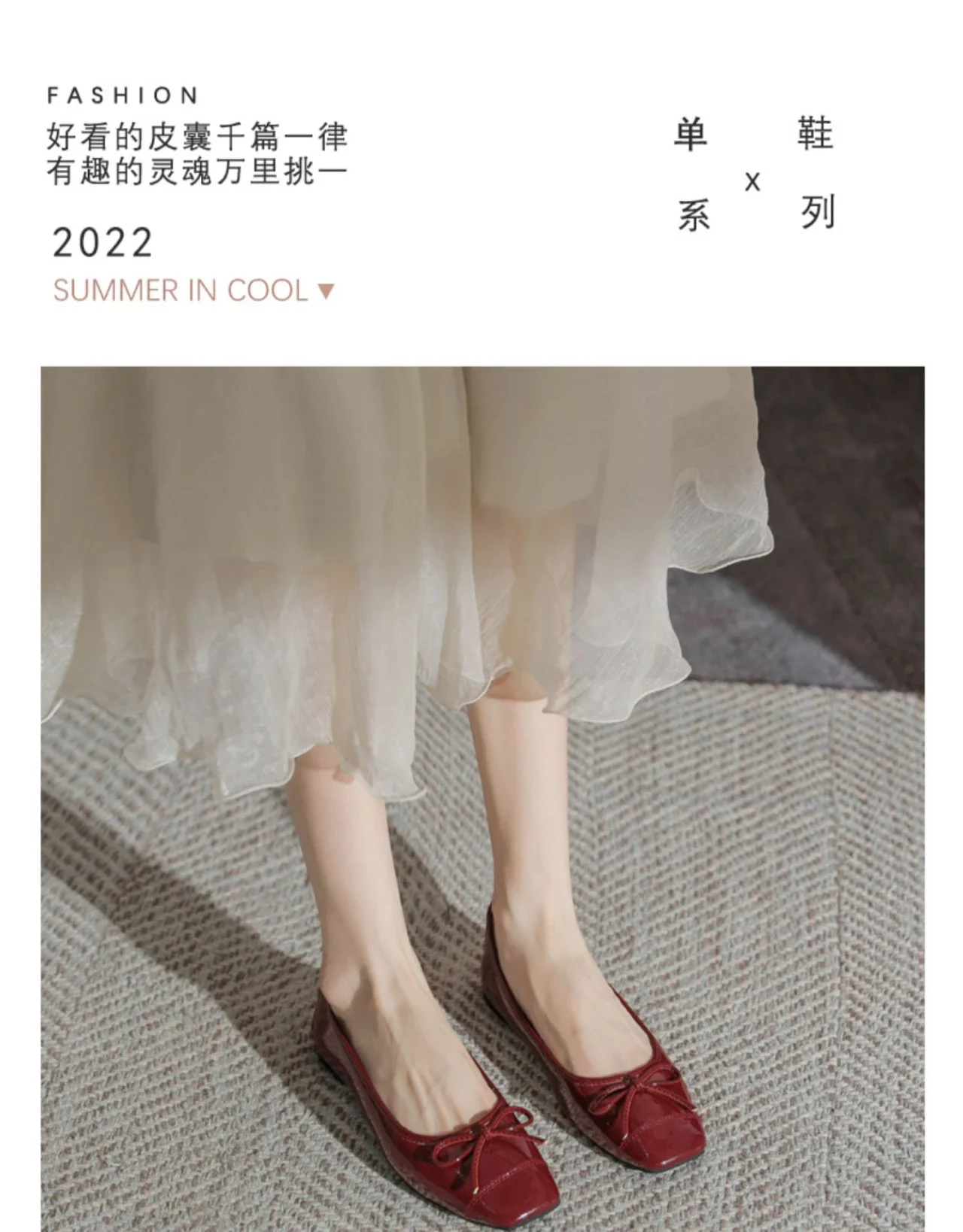 Retro Bowknot Patent Leather Women's Ballet Flats Shoes Autumn Slip on Flat Casual Shoes Round Toe Thick Heels Wine Red Loafer