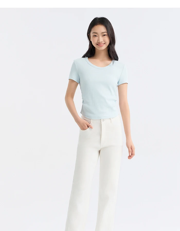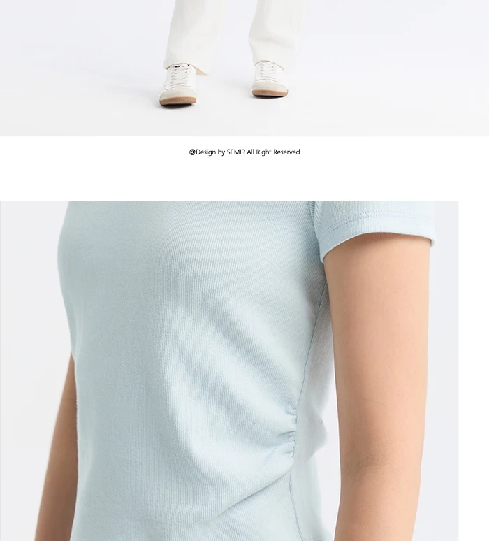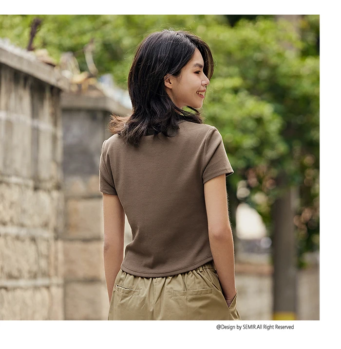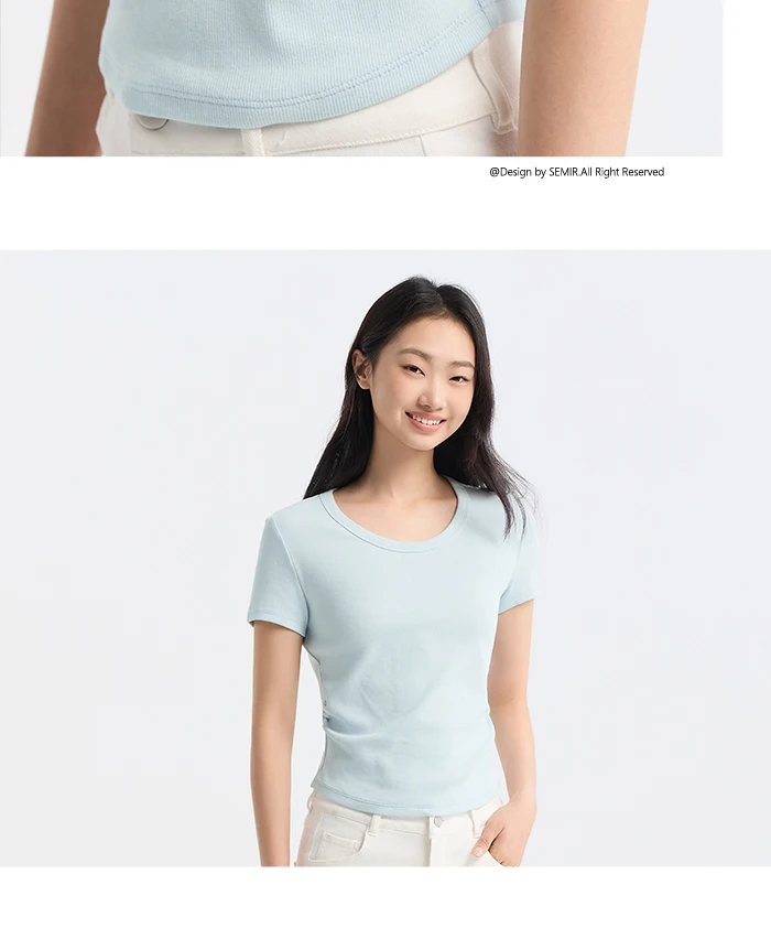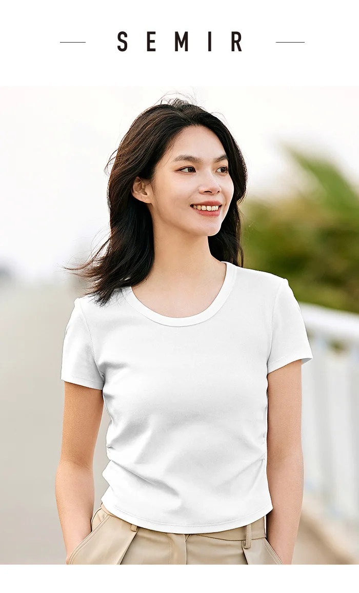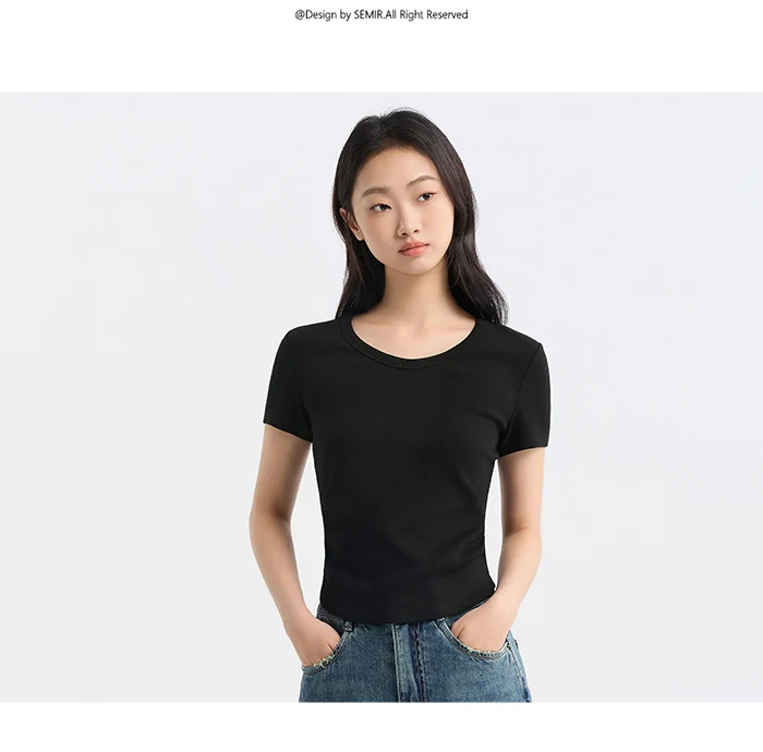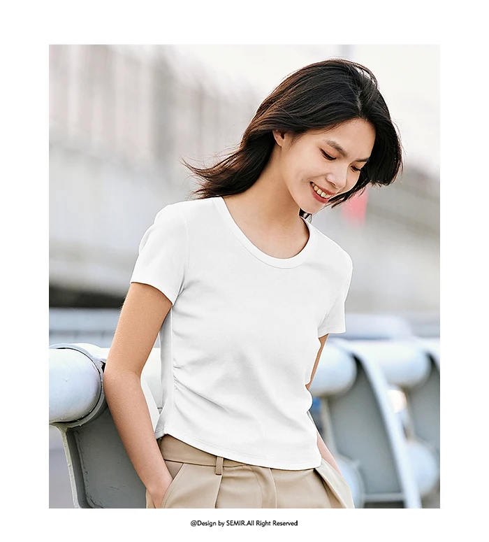 Semir Short Sleeve T-Shirt Women Short Careful Machine Solid Colour Tight 2024 New Summer Large Round Neck Positive Shoulder Pul