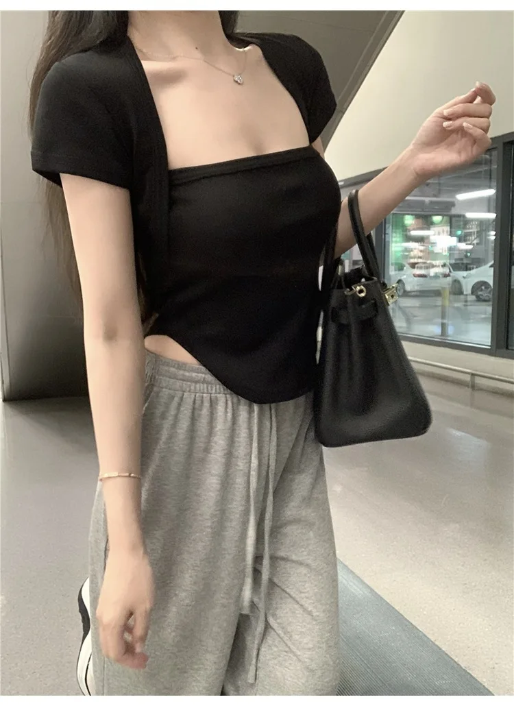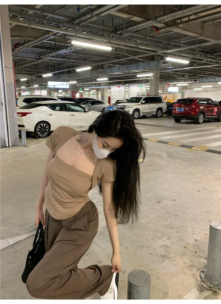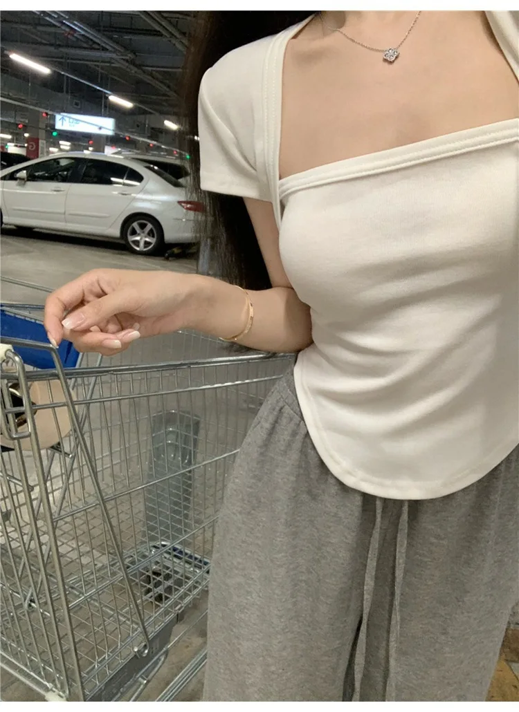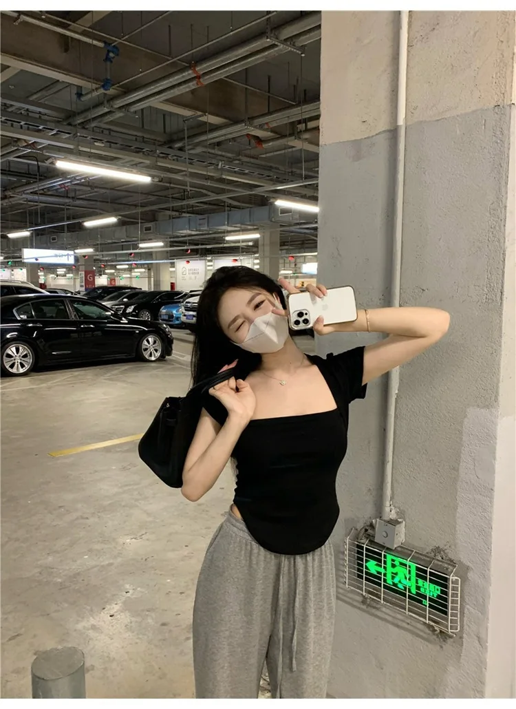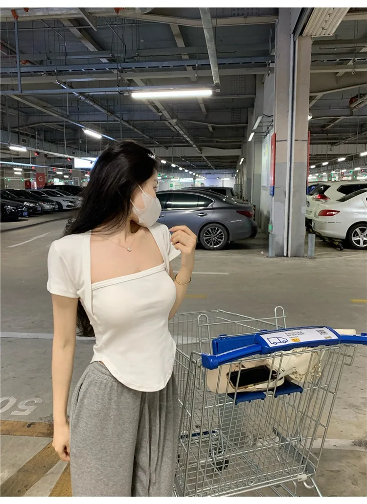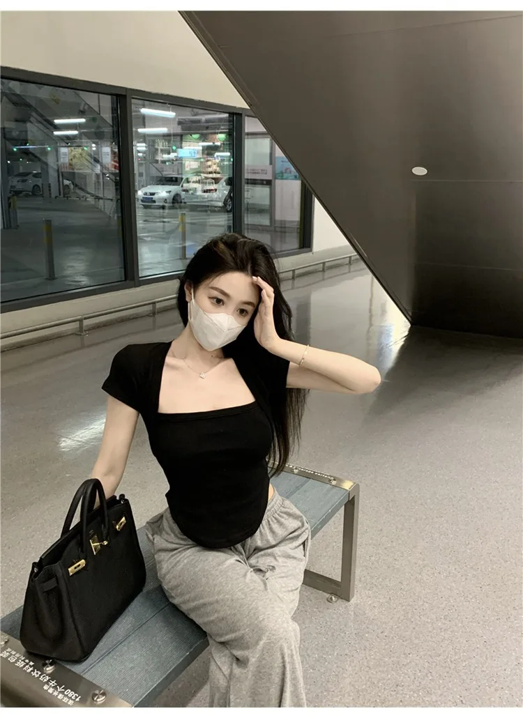 Sexy Square Neck Slim New Top Women 2024 Summer Fashion Short Sleeve Tee Korean Popular Trendy Crop Top Female