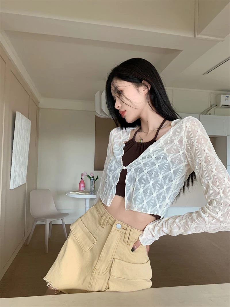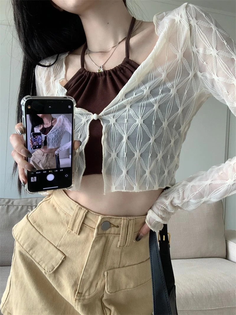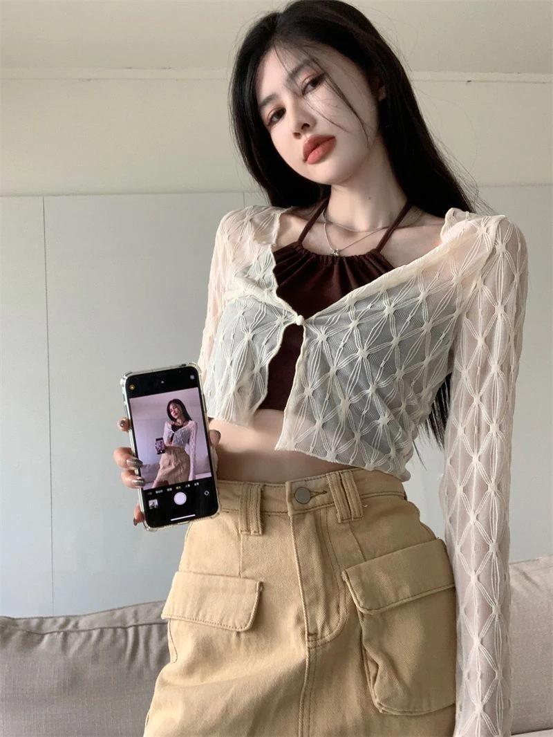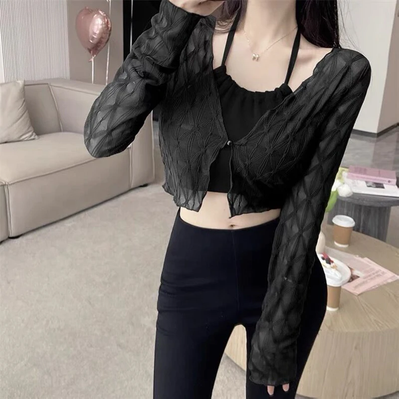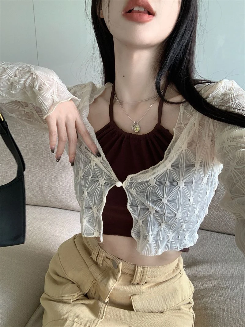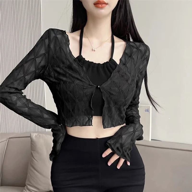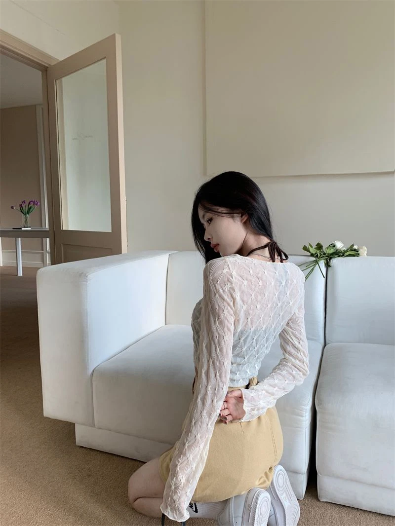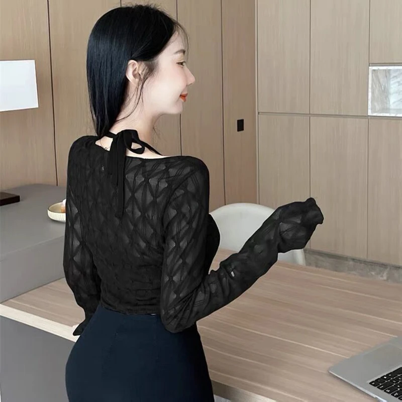Sheer Shirt Women Solid Chic Slim Fit Sweet Lace Thin Blouse Korean Fashion All Match Long Sleeve Tops Ladies Summer New