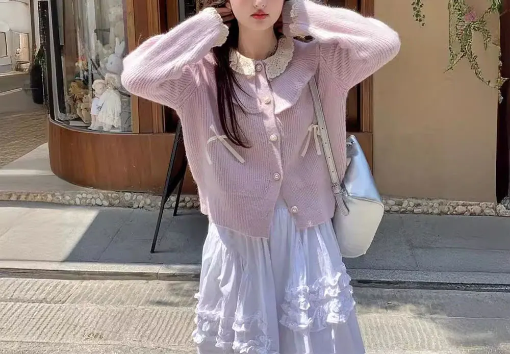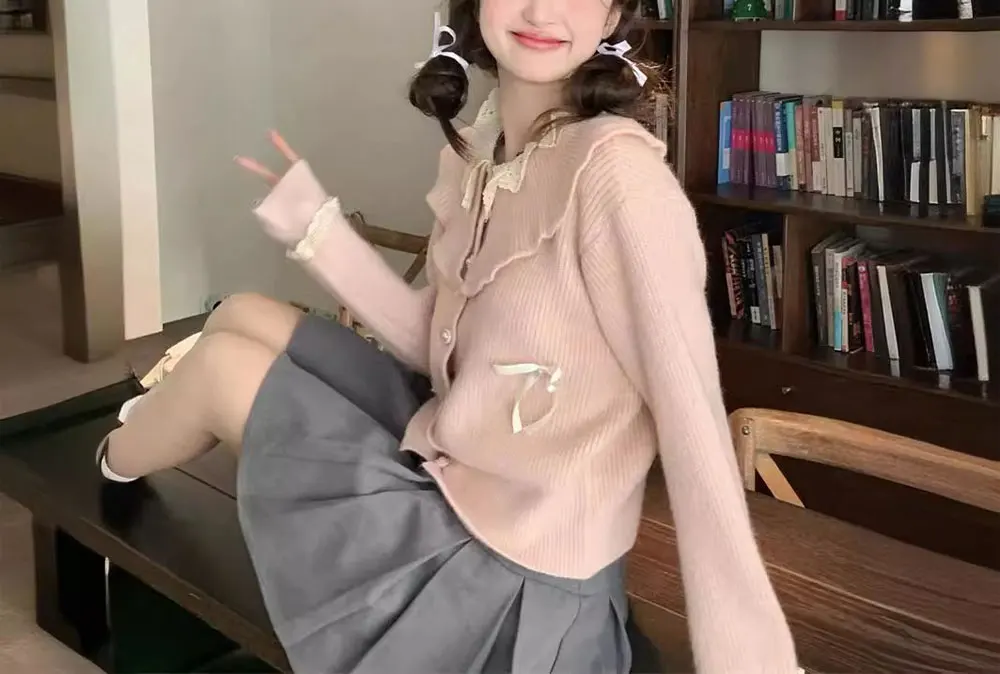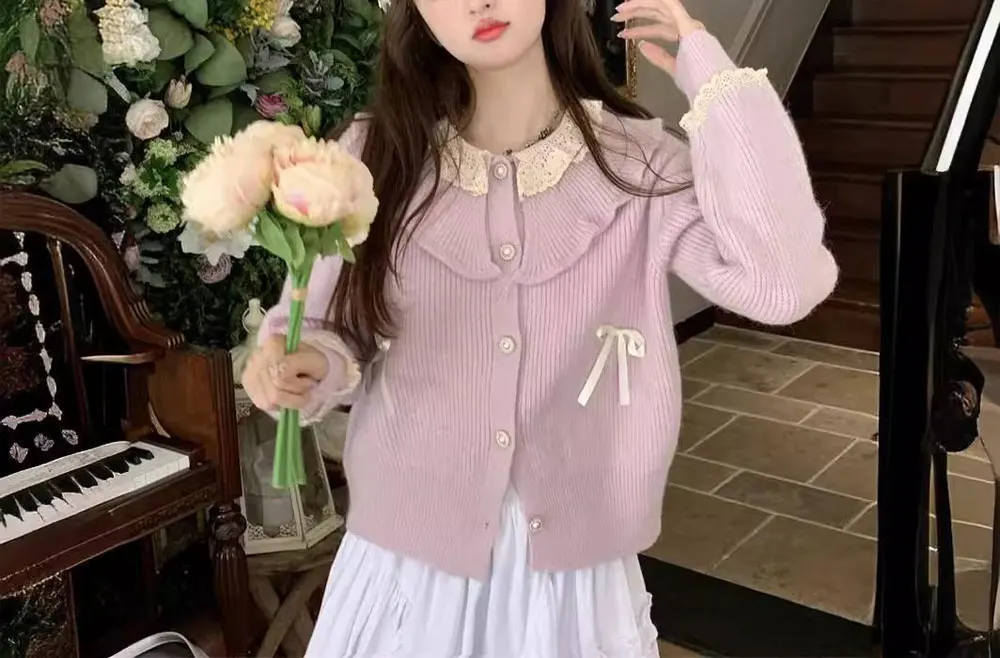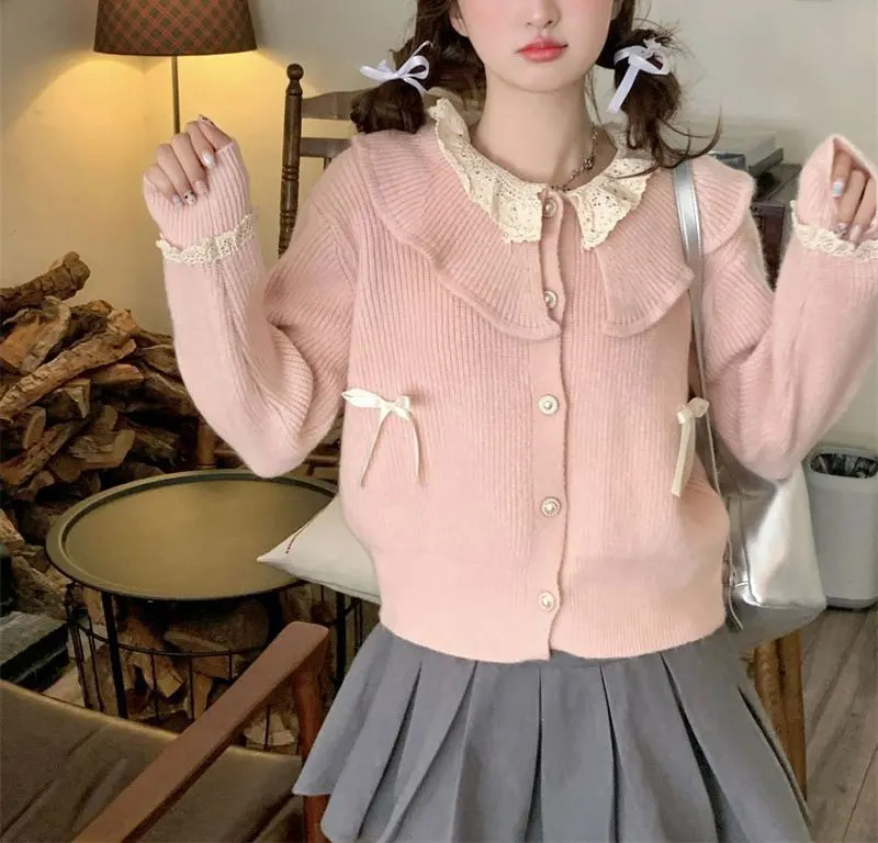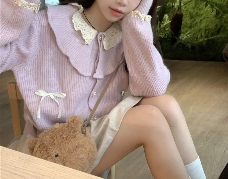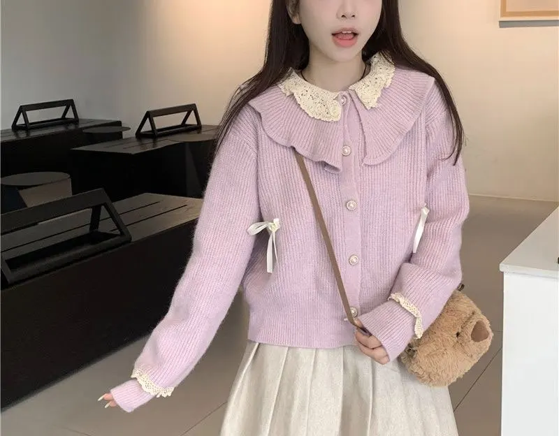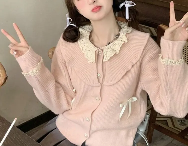 Sweet Doll Collar Lace Spliced Sweaters Autumn Winter New Fashion Bow Women's Clothing Long Sleeve Casual Loose Knitted Cardigan