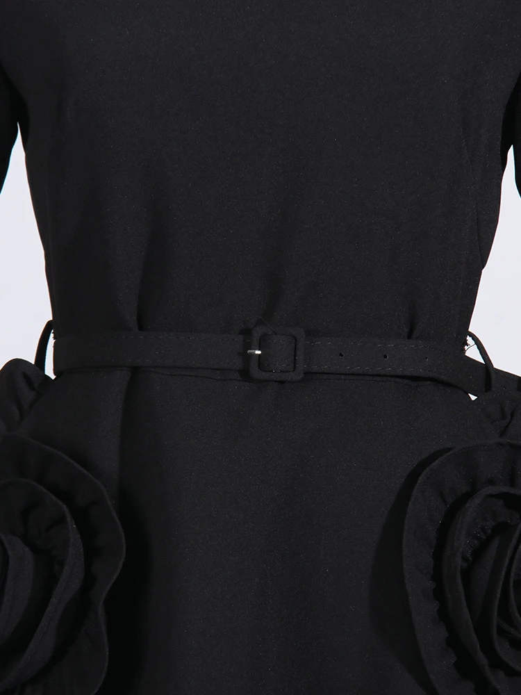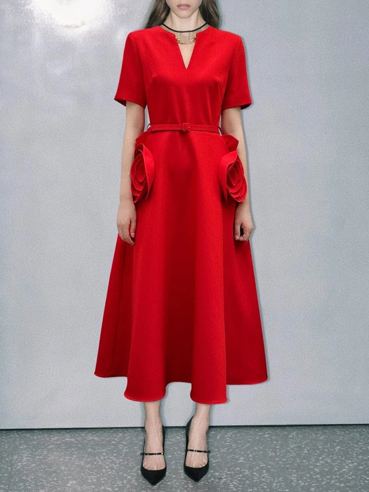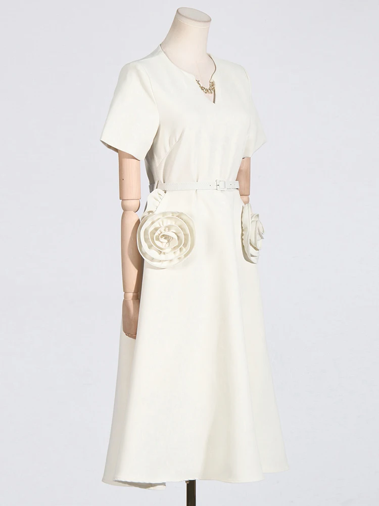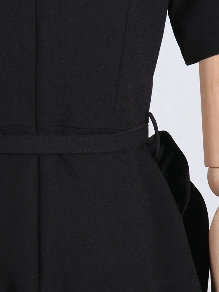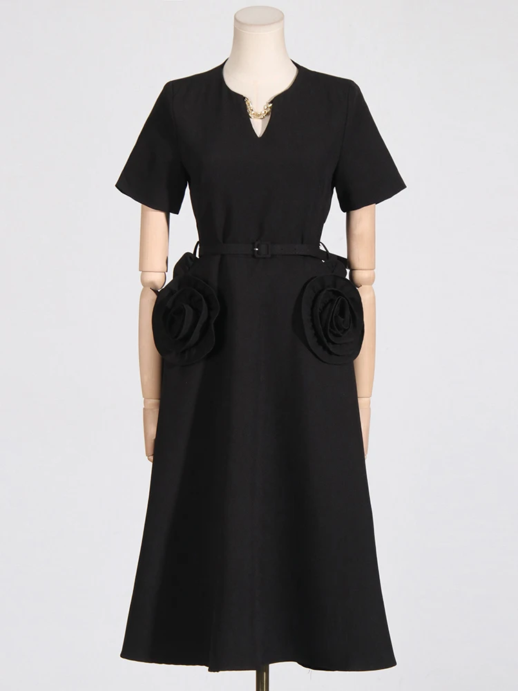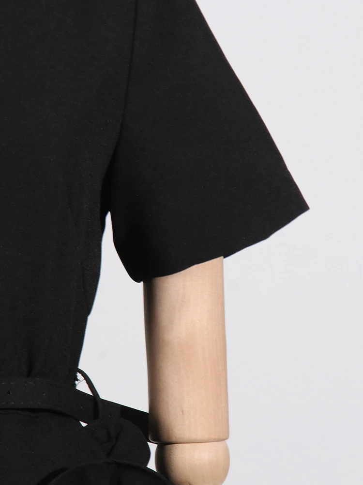 VGH Elegant Solid Patchwork Appliques Dresses For Women V Neck Short Sleeve High Waist Spliced Belt Temperament Dress Female New