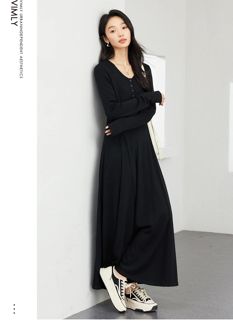 VIMLY Women's Simple Elegant Dress Autumn Semi Open Neck Waisted Pullover Knit Long Dress Casual Office Lady Versatile Dress