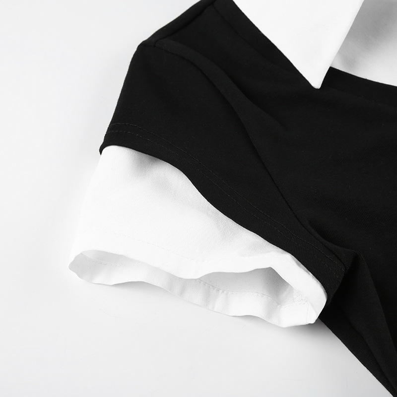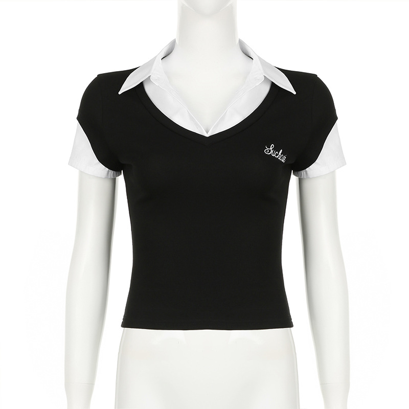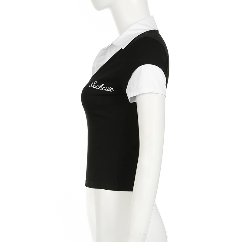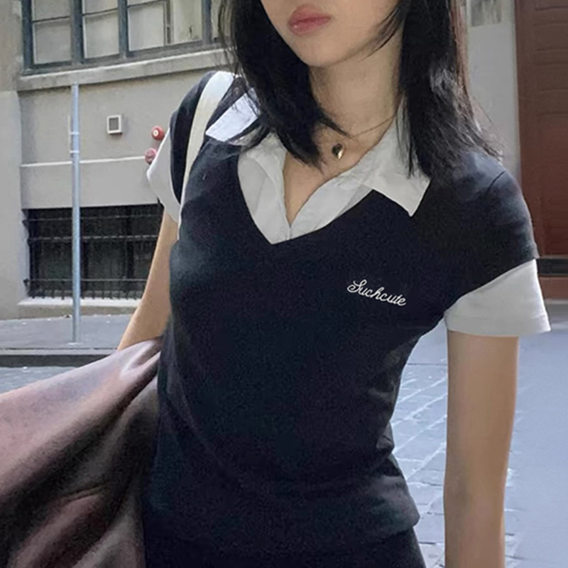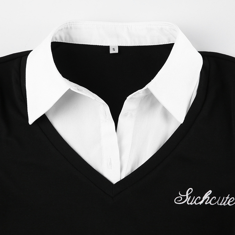 Women Casual College Style POLO Collar Splicing Fake Two Solid Slim Knit Long-Sleeved T-shirt Women Slimming Autumn And Winter