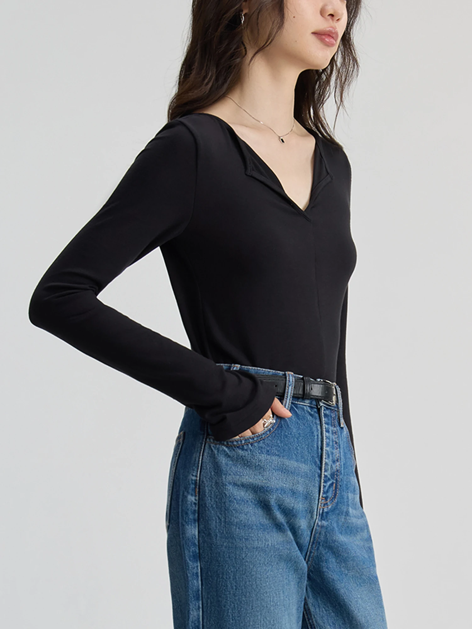ZIQIAO Petite Design Sense V-neck Long Sleeved T-shirt for Women 2024 Autumn and Winter New Versatile Top 24ZQ93177