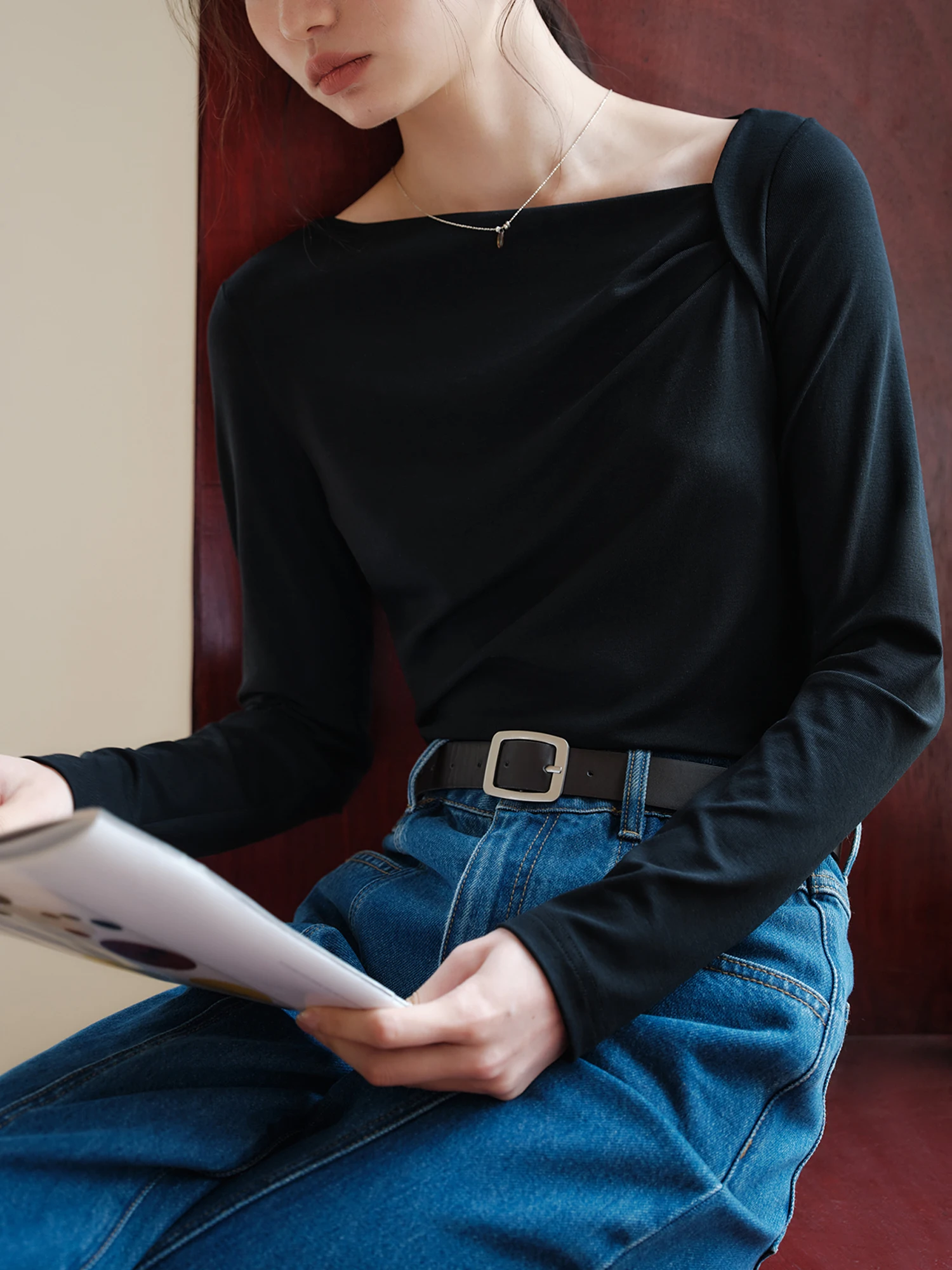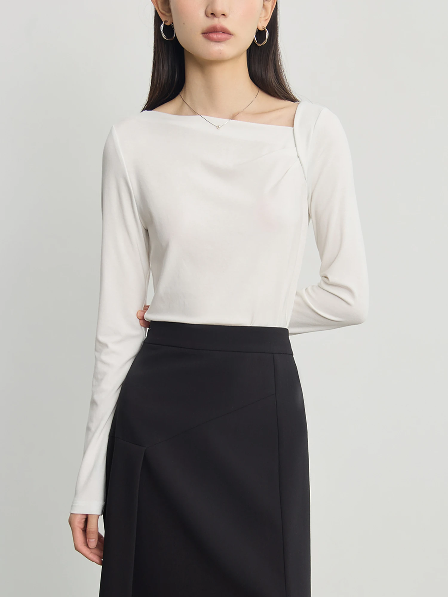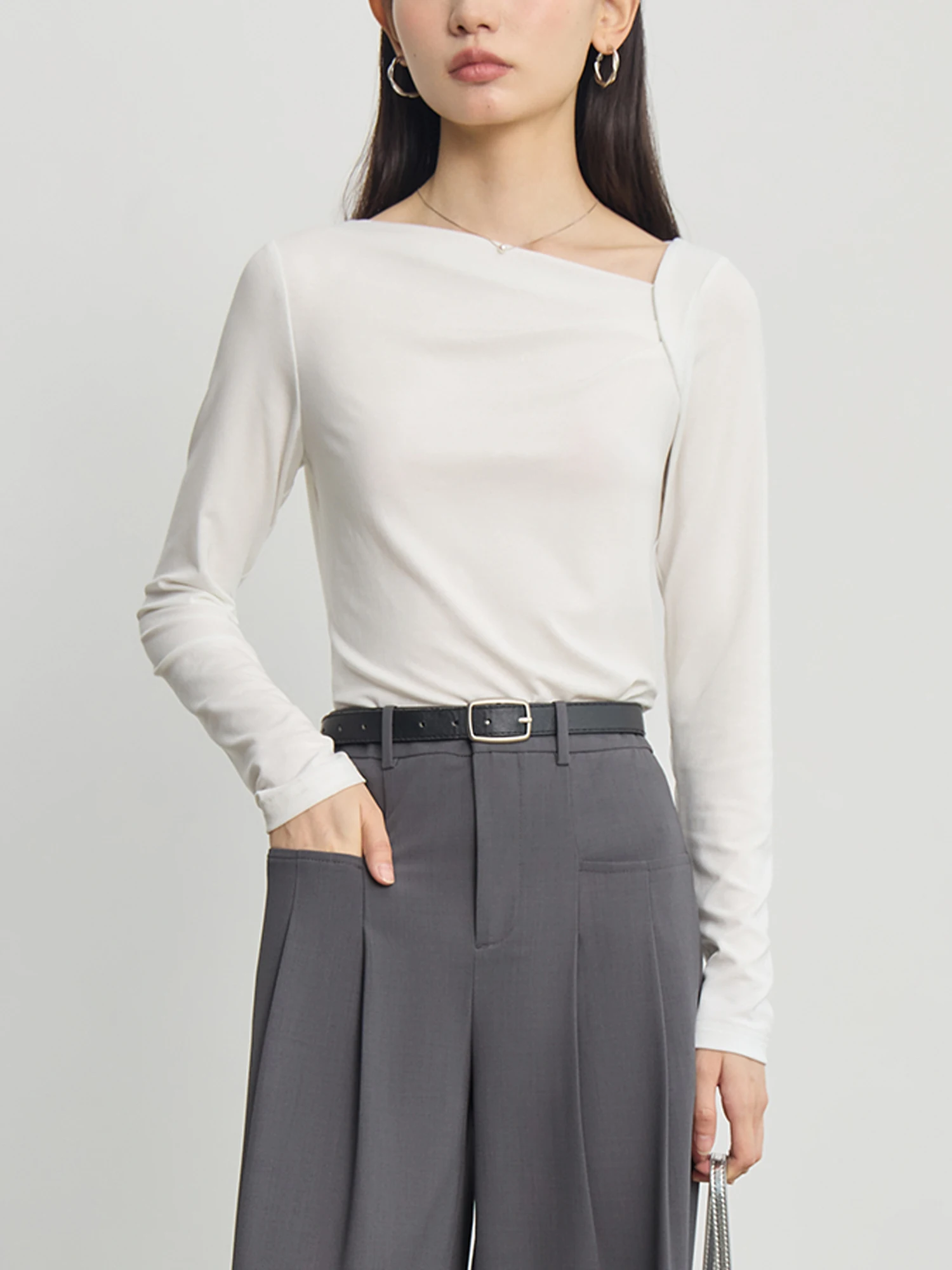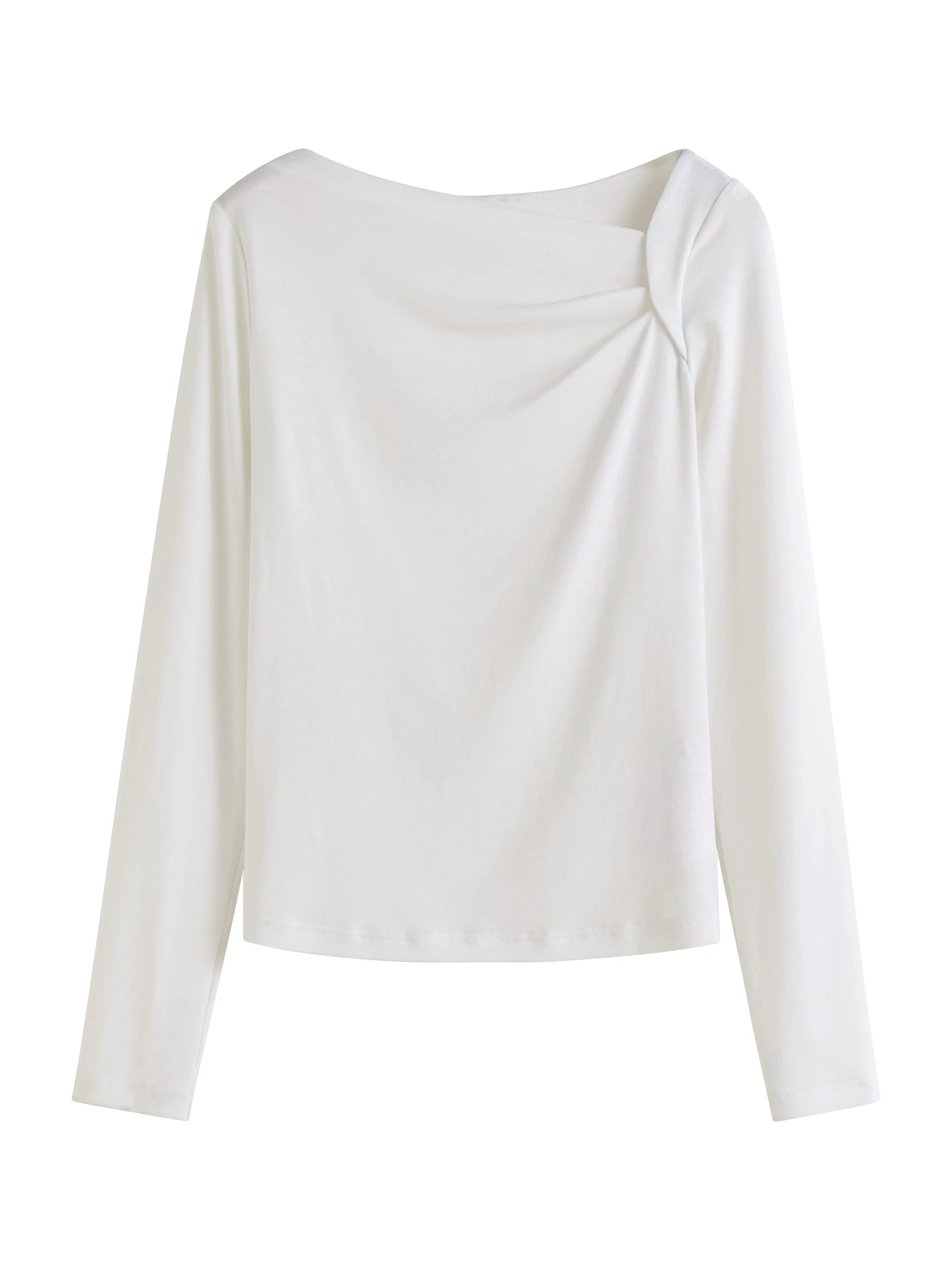 ZIQIAO Tencel Acetate Slim Fit Long-sleeved T-shirt For Women 2024 Autumn New Design Versatile Casual Solid Color Tops 24ZQ93095